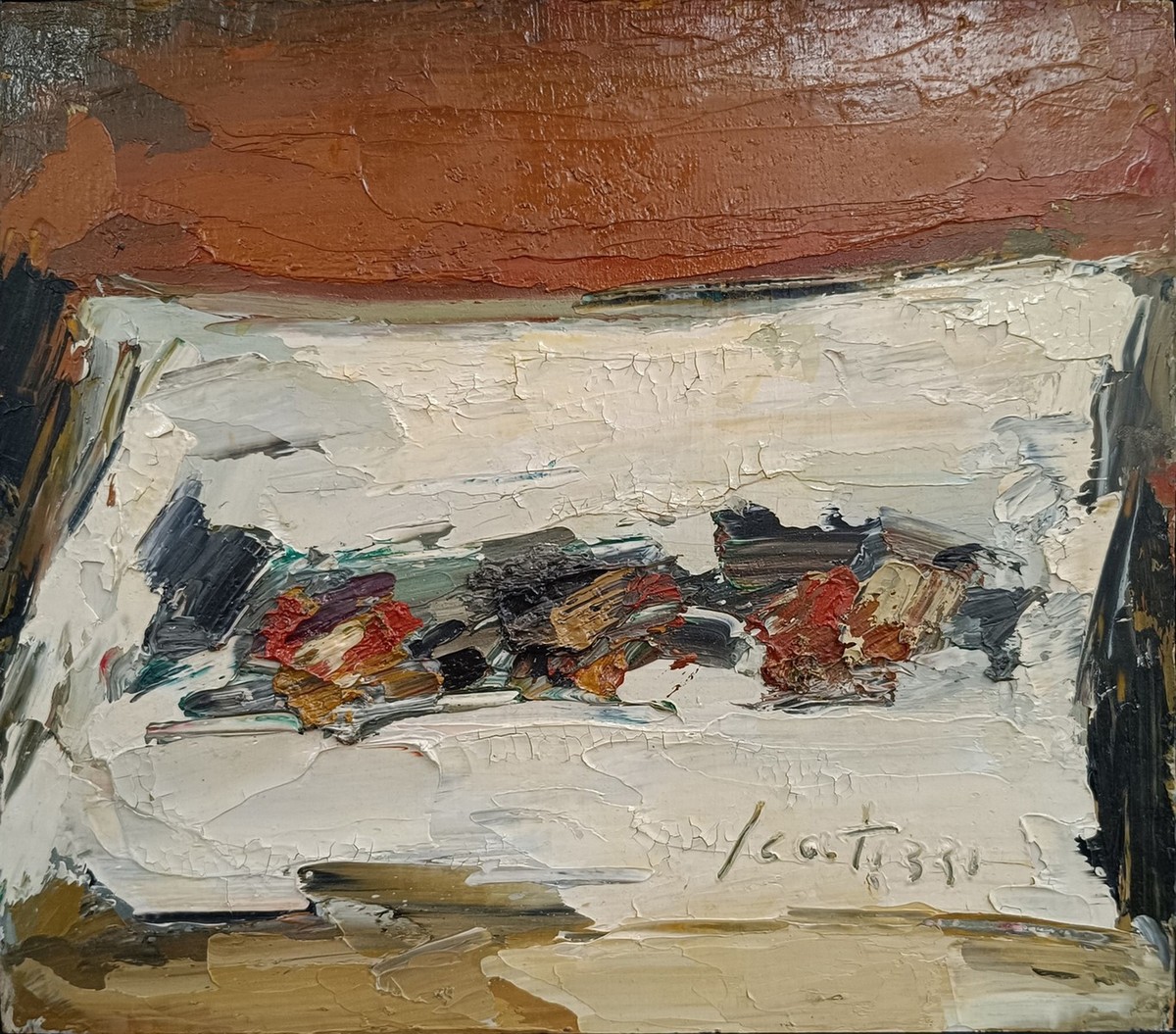 SCATIZZI SERGIO (1918 - 2009) NATURA SUL TAVOLO. olio su tavola. Cm 45,50 x 40,50. firma