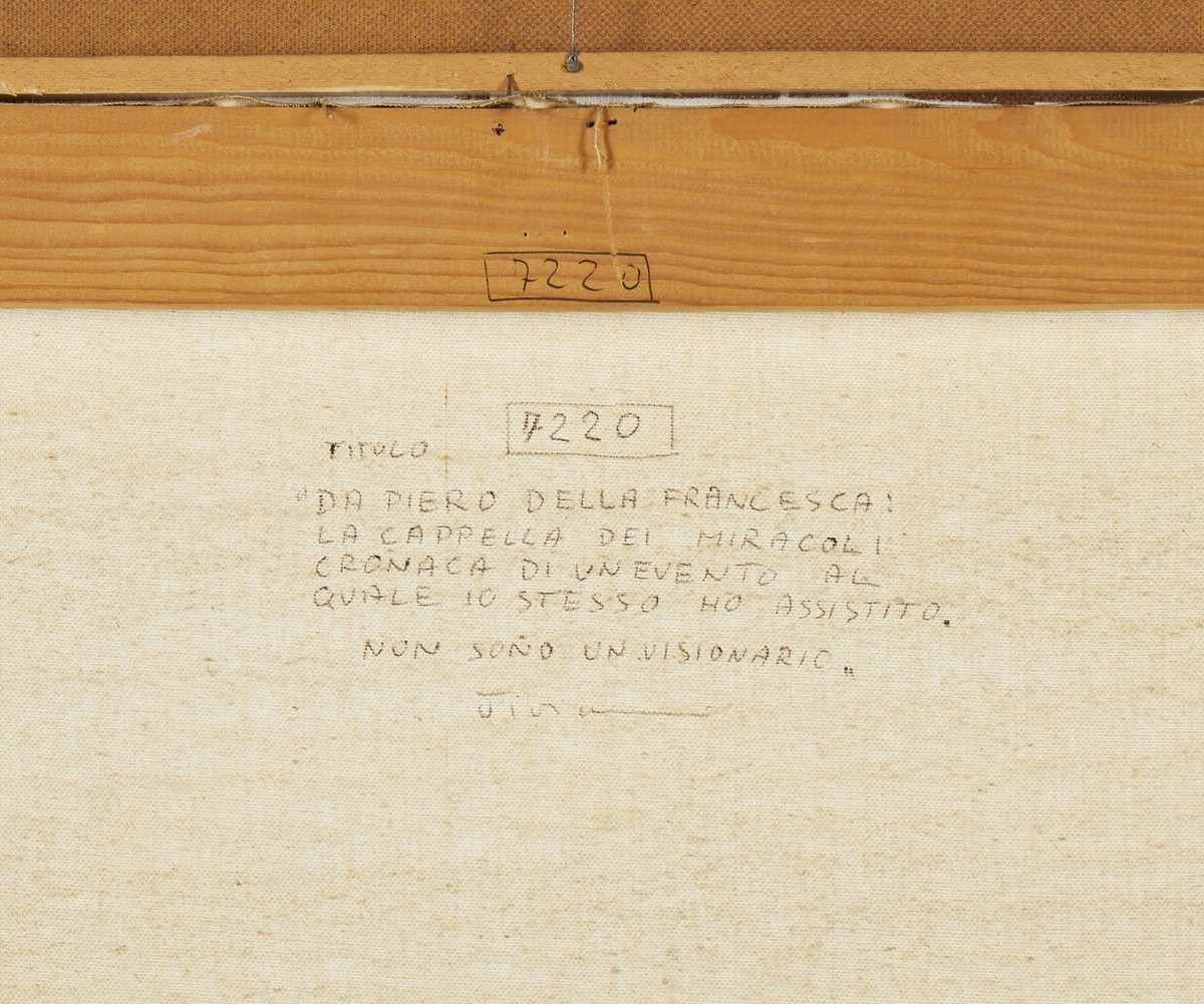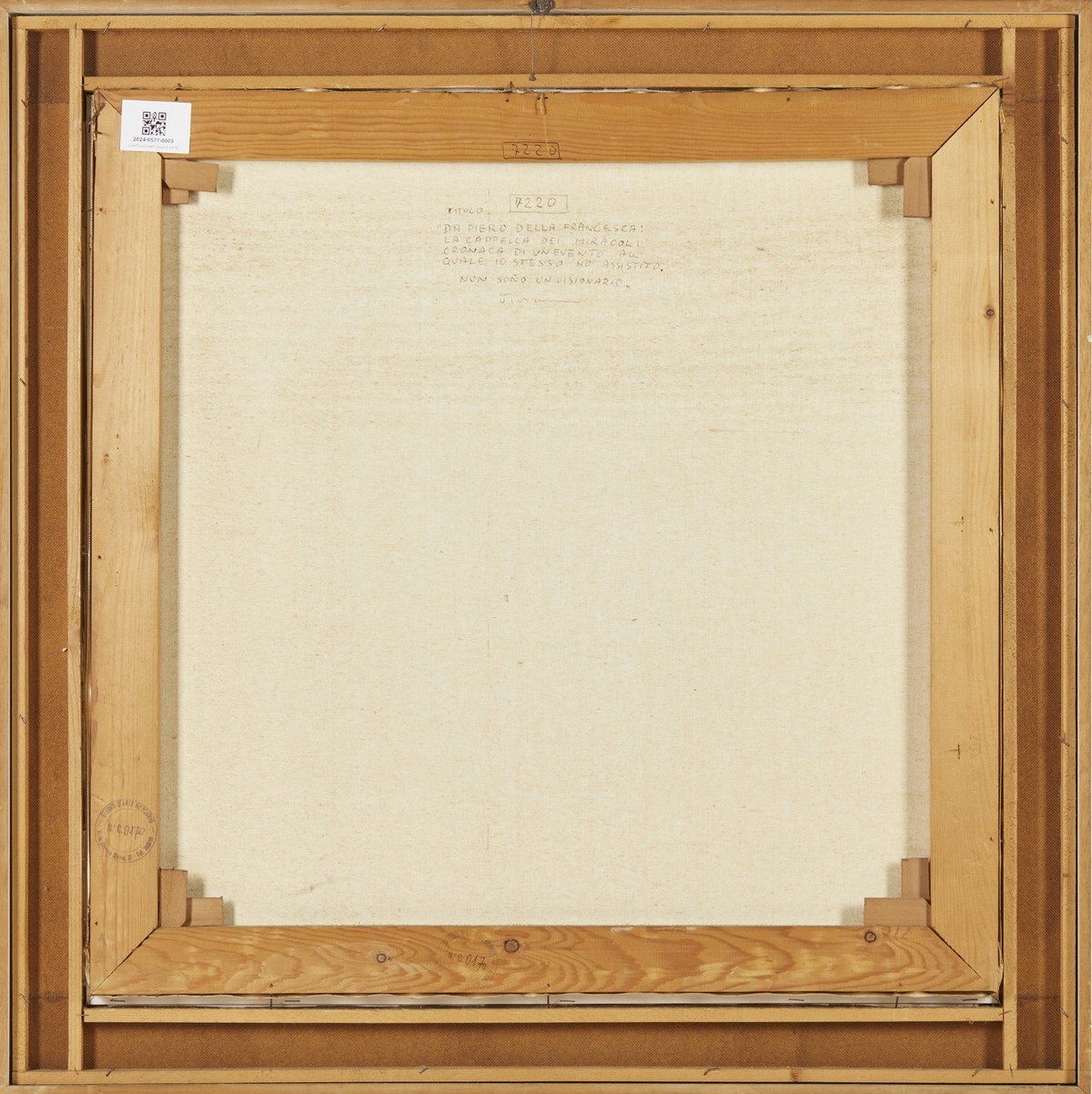 VIVIANI VANNI (1937 - 2002) DA PIERO DELLA FRANCESCA: LA CAPPELLA DEI MIRACOLI CRONACA DI UN EVENTO AL QUALE IO STESSO HO ASSISTITO. NON SONO UN VISIONARIO. Tecnica mista su tela. Cm 70,00 x 70,00. firma