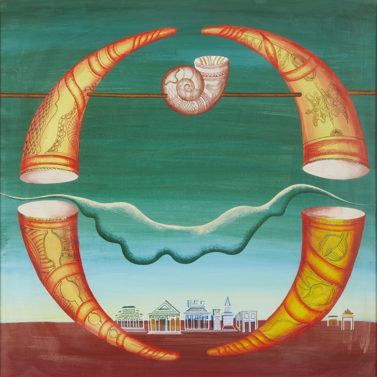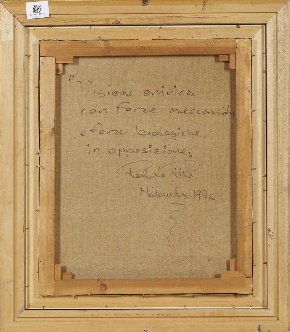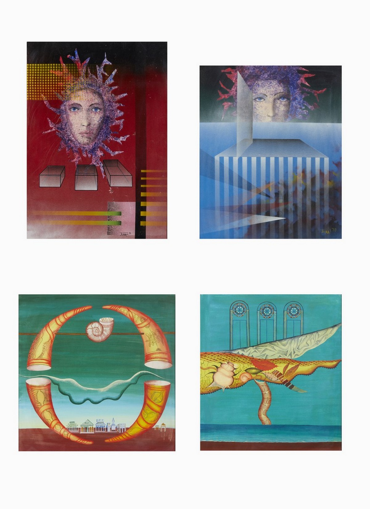 AUTORI VARI LOTTO COMPOSTO DA N.4 OPERE. VISIONE ONIRICA CON FORZE MECCANICHE E FORZE BIOLOGICHE IN OPPOSIZIONE; CATARSI. 1970-1971. Tecnica mista su tela. .