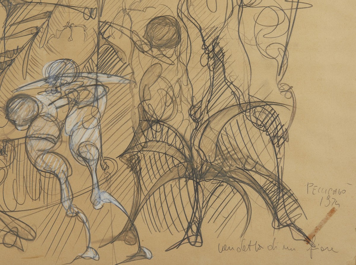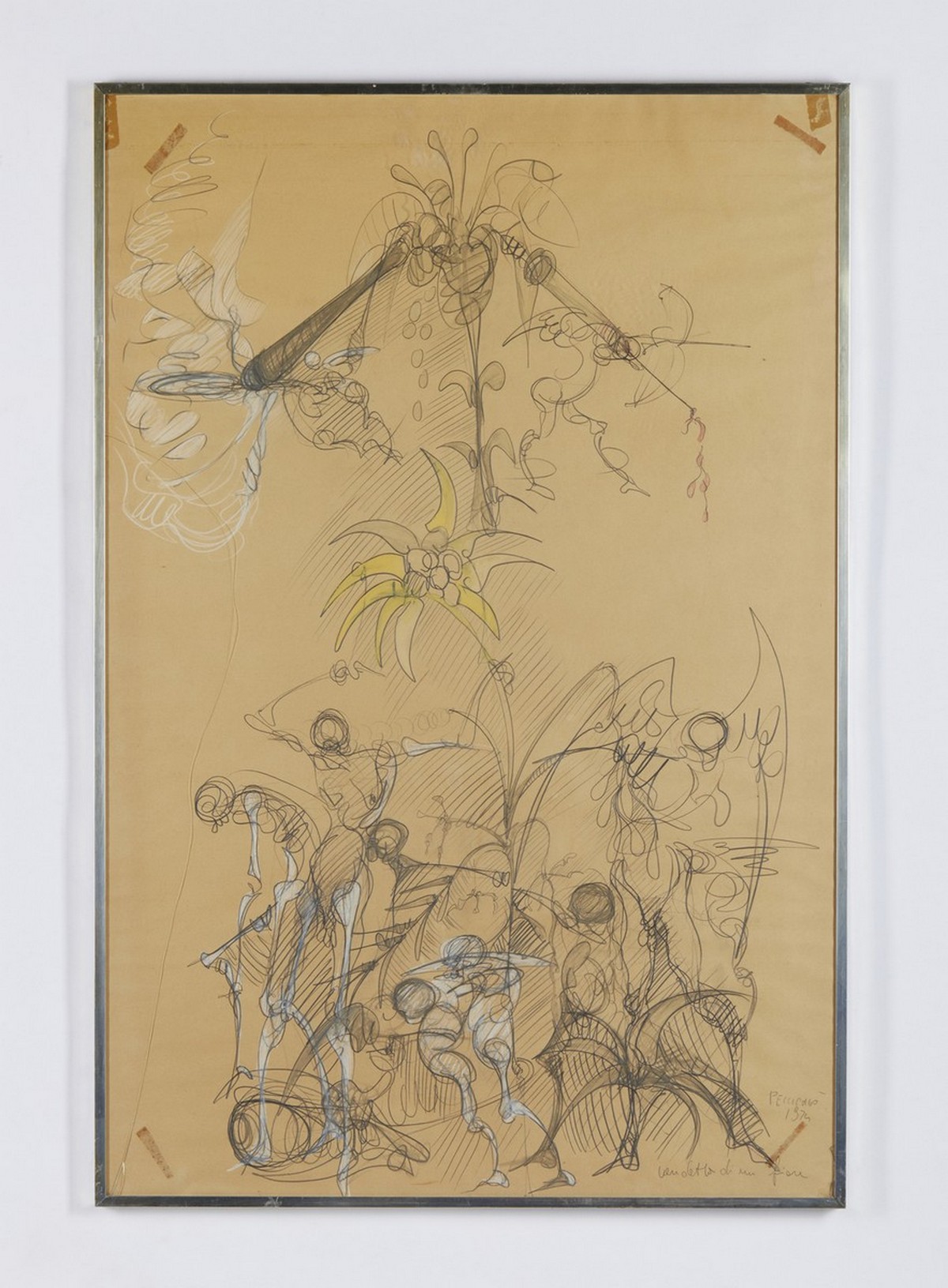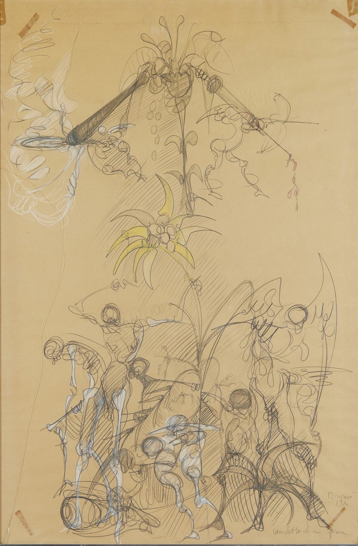 PELLICANO DOMENICO (n. 1952) VENDETTA DI UN FIORE, 1974. tecnica mista su carta. Cm 70,00 x 100,00. firma, data, titolo. Cornice presente