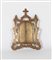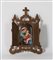 Dipinta a smalti su porcellana. Cornice a tabernacolo in ottone massiccio con doppie antine di chiusura a guisa di icona da viaggio. Decorazioni incise sulle pareti di chiusura delle antine. Al verso etichetta con scritte a mano Firenze 5/3/1904.