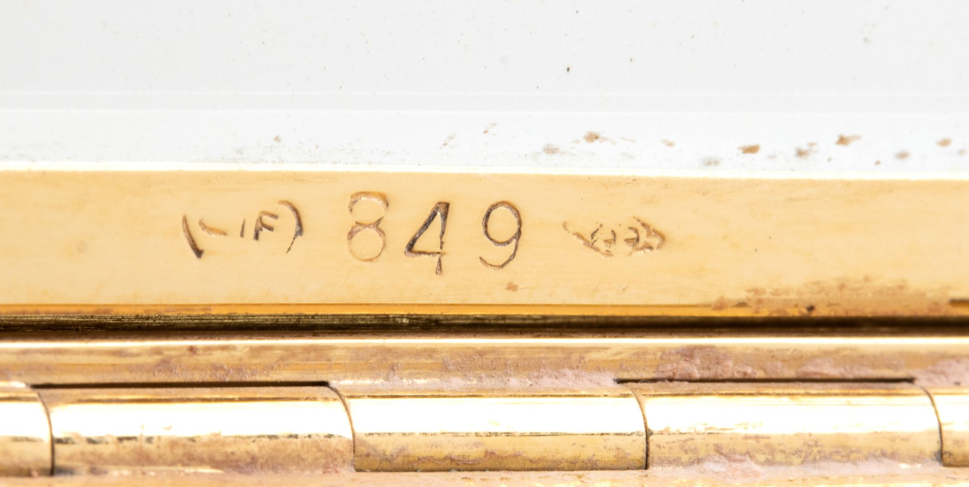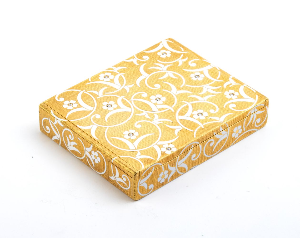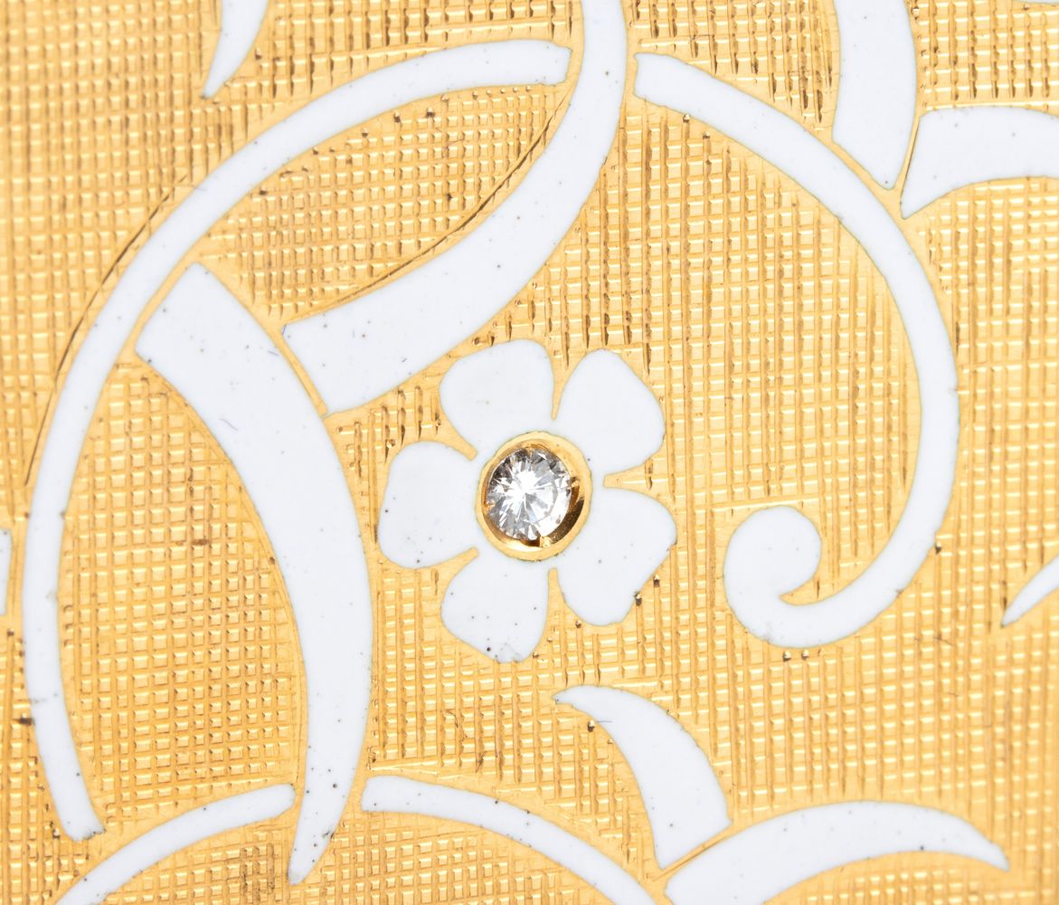 in oro giallo 18k, di forma rettangolare, con finitura satinata, decorato con motivo ramage e floreale in smalto bianco, punteggiato da diamanti. Con specchio interno. Firmata FARONE.