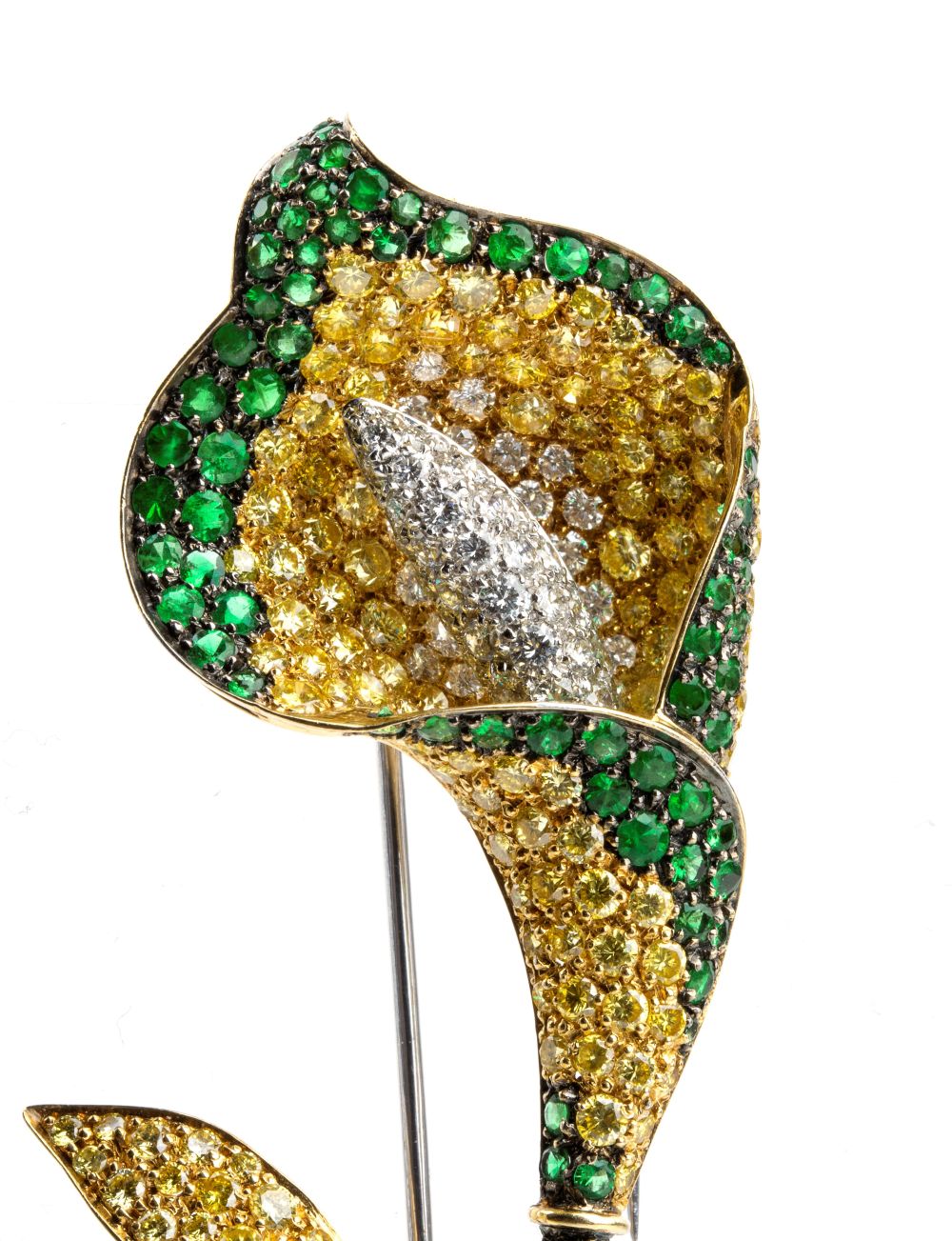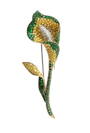a forma di Calla, fiore appartenente alla famiglia delle Aracee, in oro bianco e oro giallo 18k, impreziosita da smeraldi e diamanti.