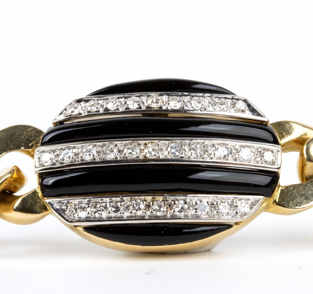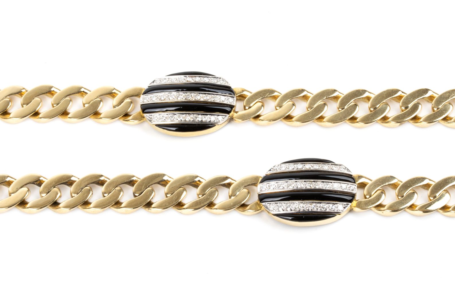 catena a maglia grumetta in oro giallo 18k, interrotta da elementi ovali in due colori d'oro, incastonati con tre file di diamanti e decorati con smalto nero.