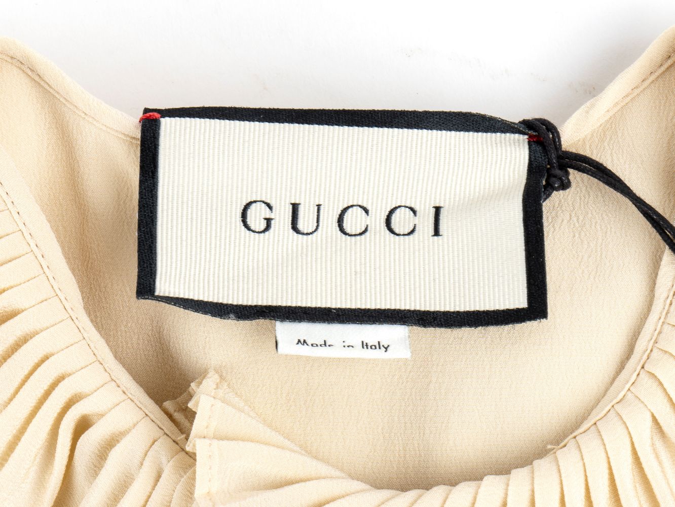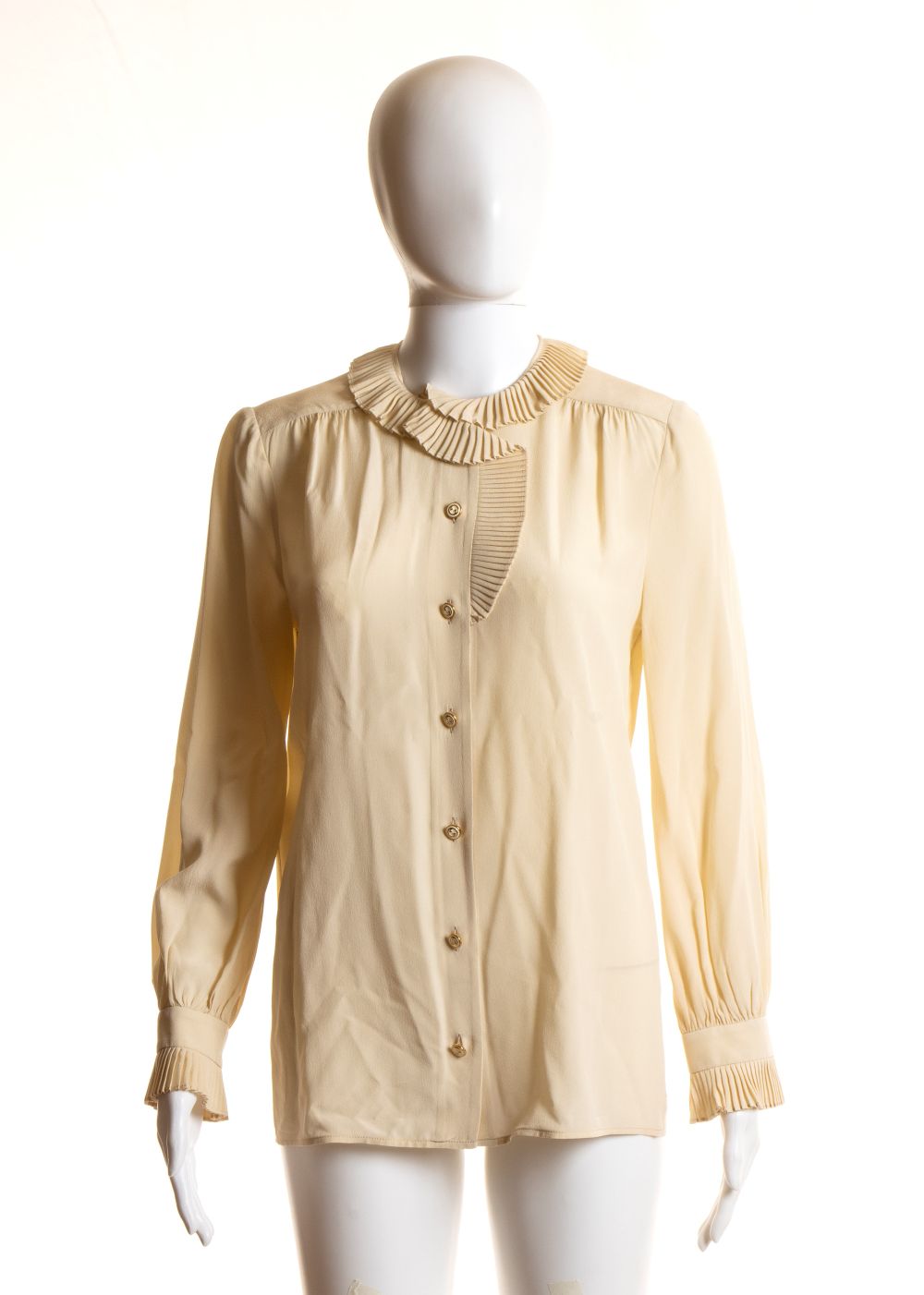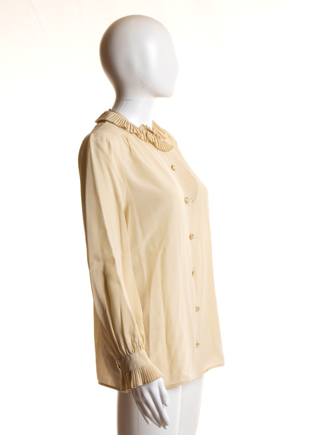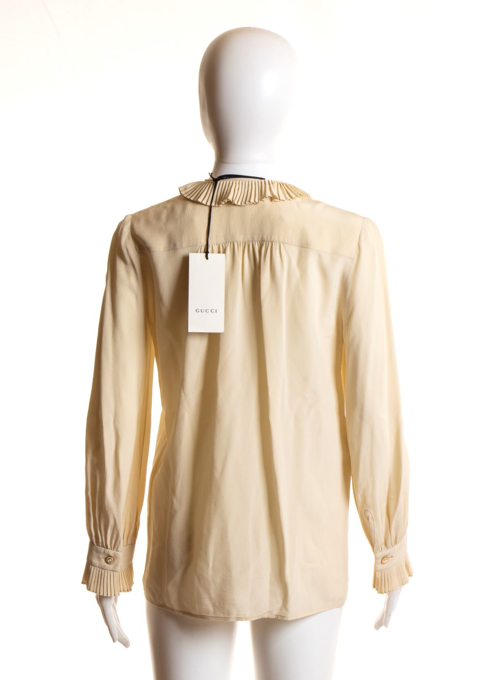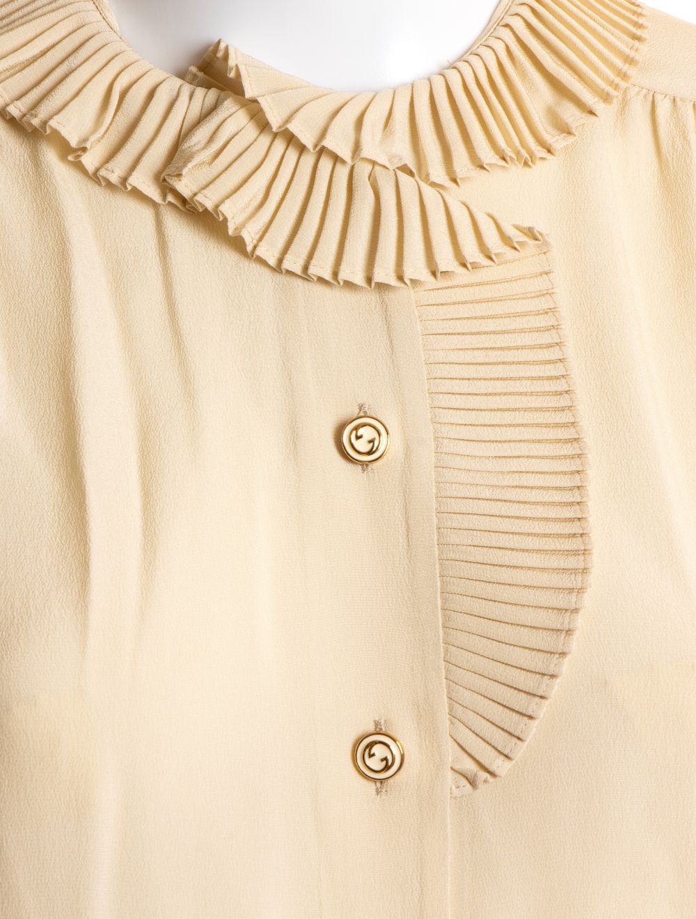 Gucci camicia in seta di colore cipria con bottoni logati con chiusura particolare effetto rouches.