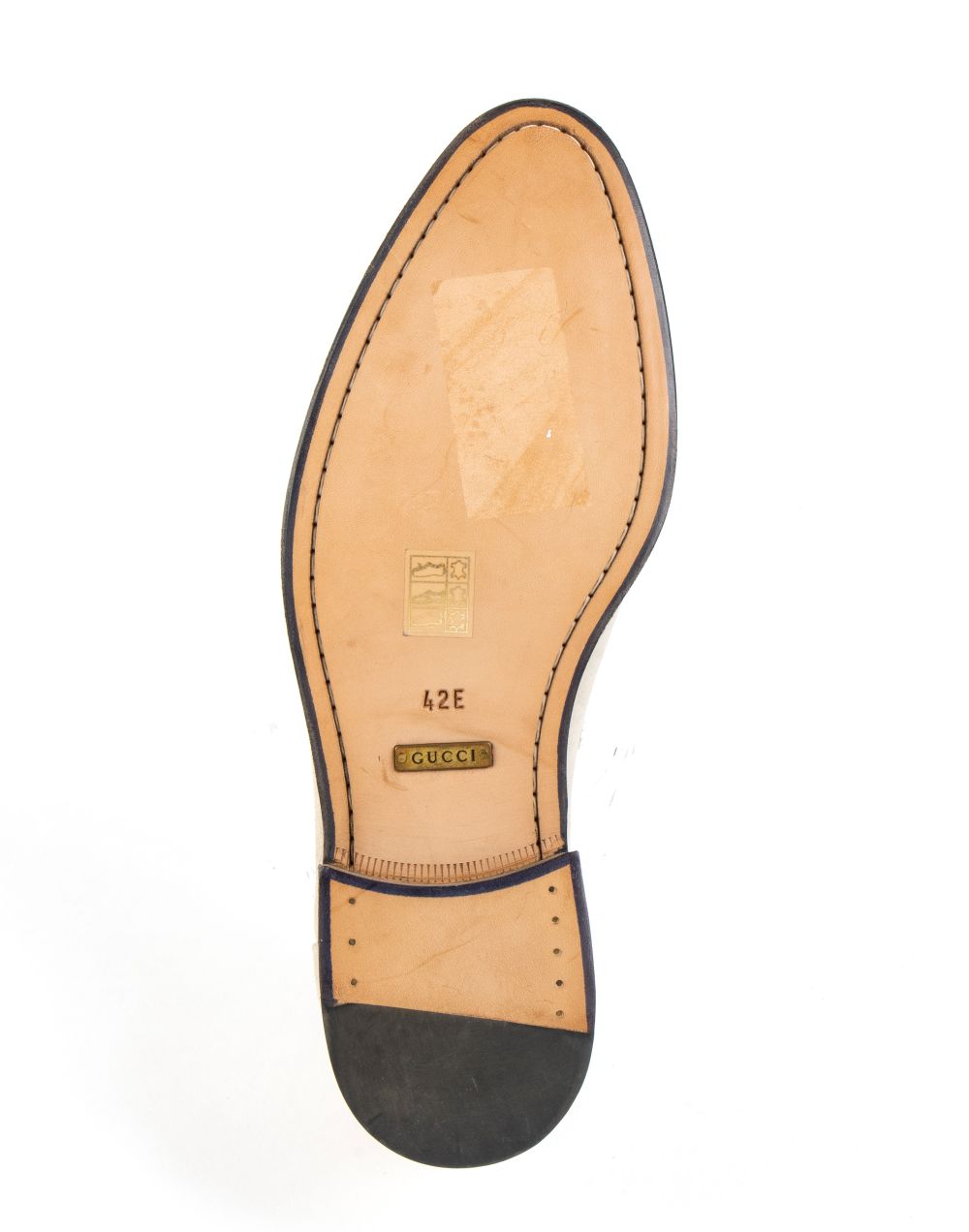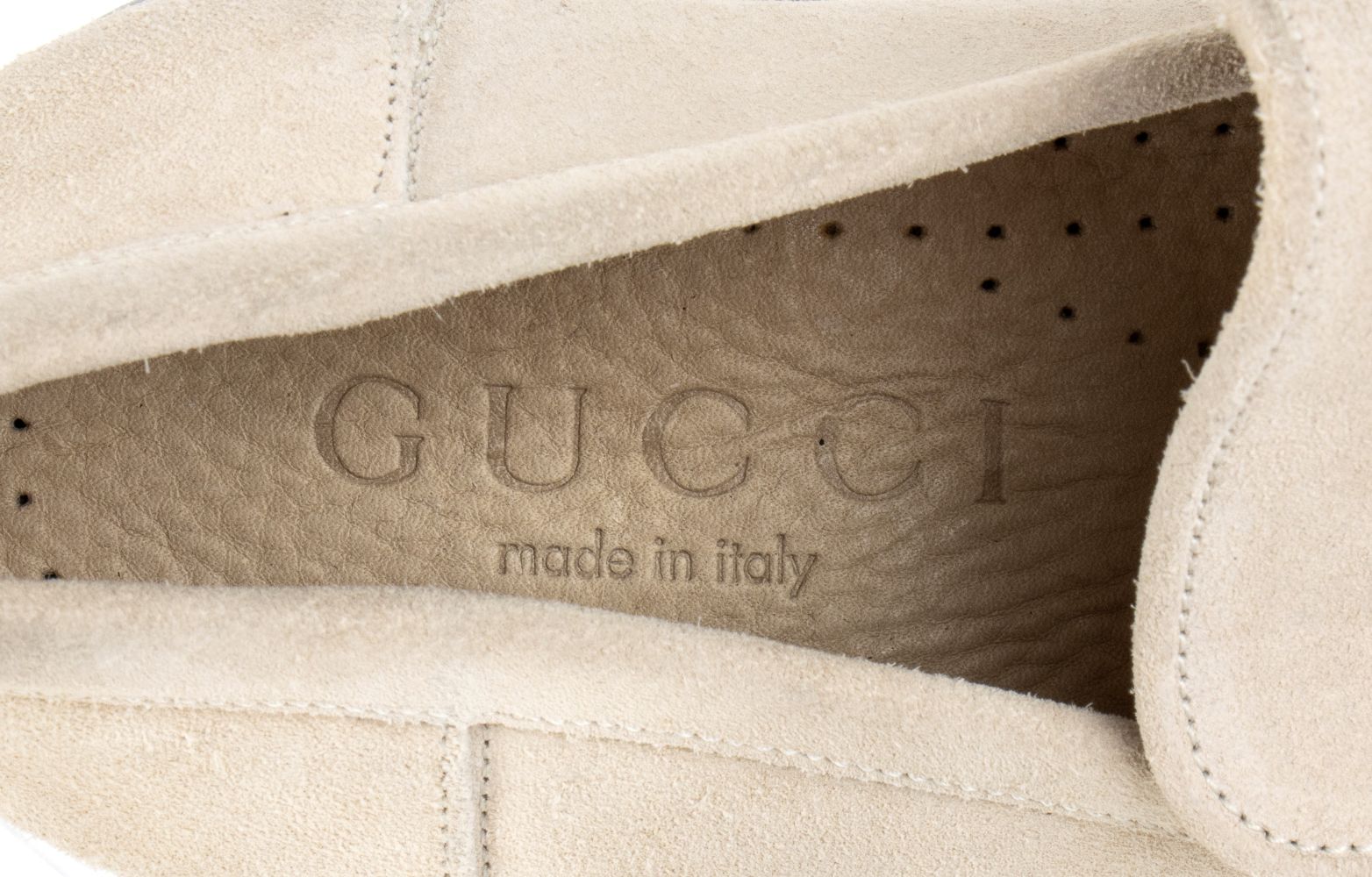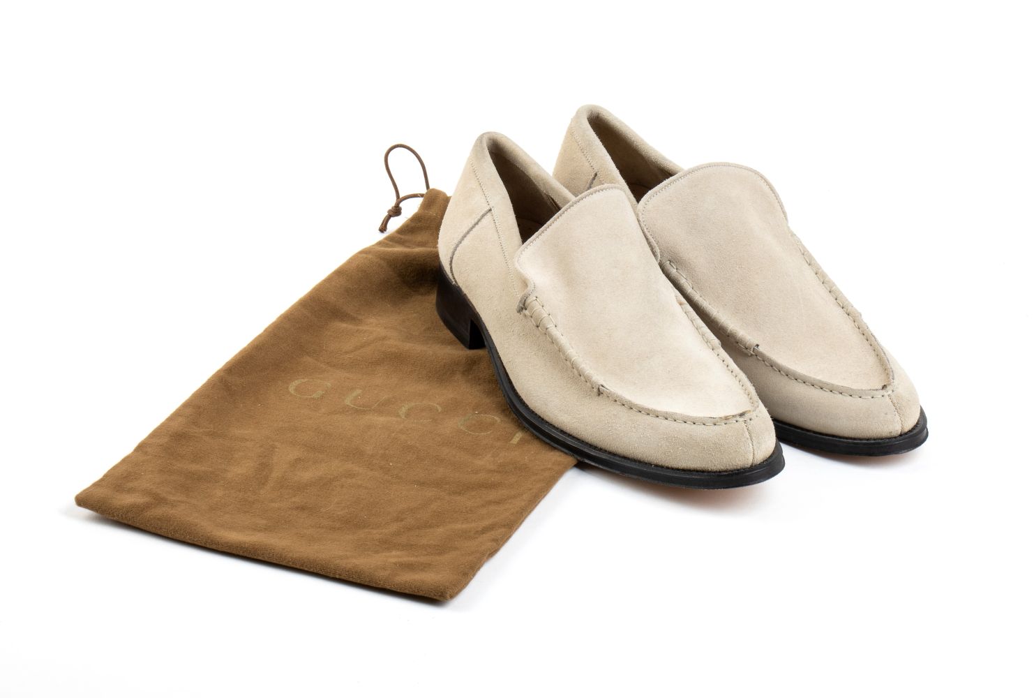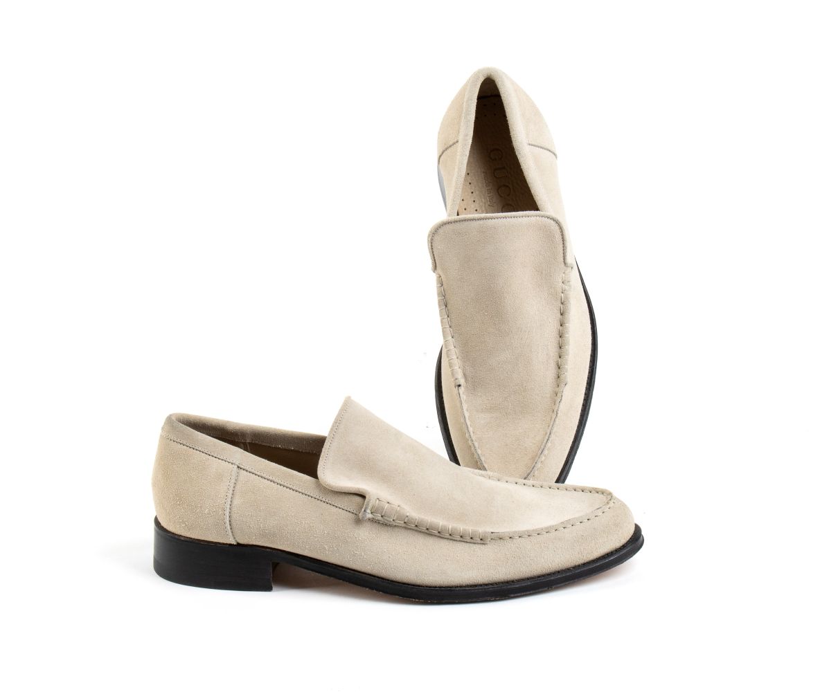 Mocassino Gucci uomo in suede beige, suola in cuoio, con dustbag.