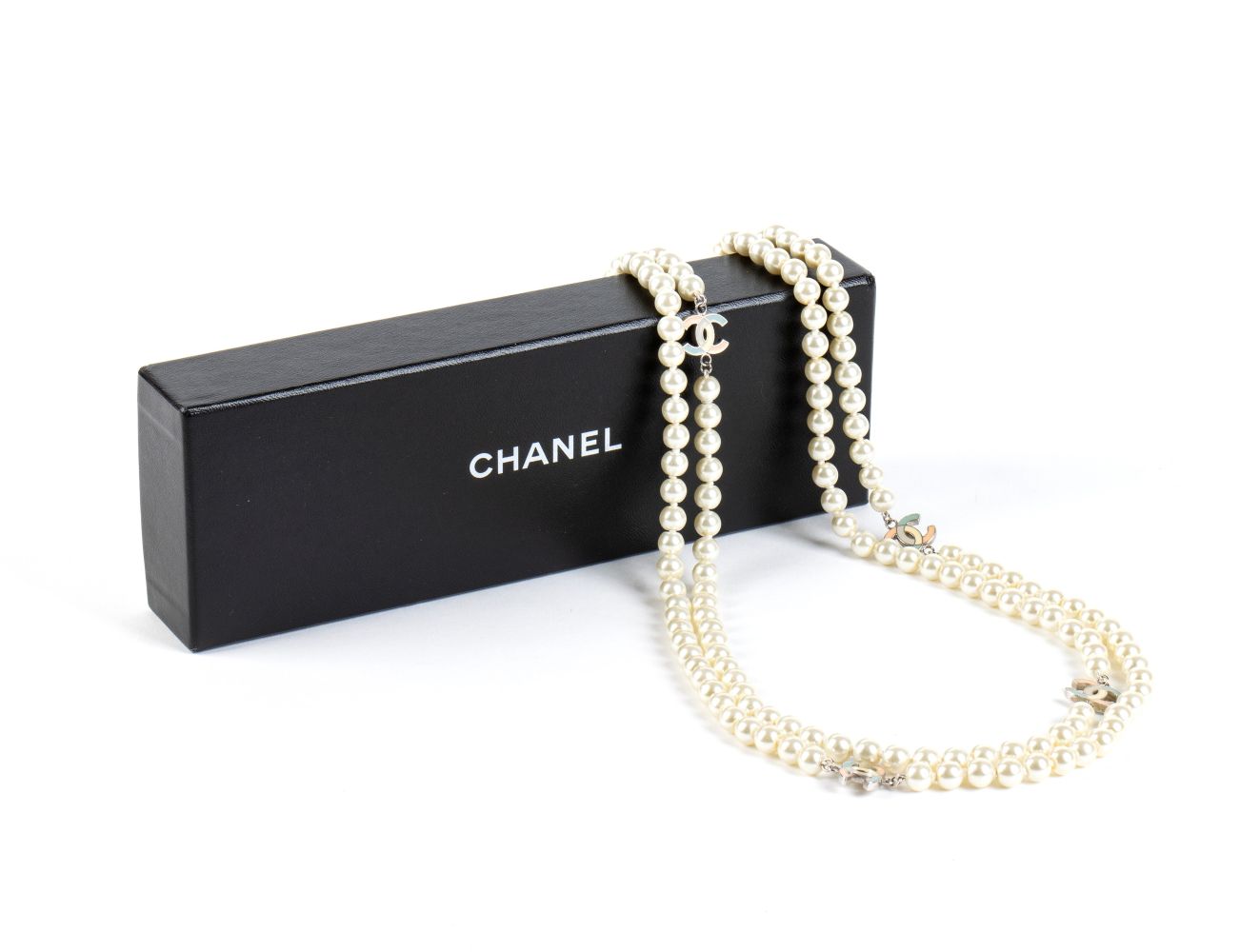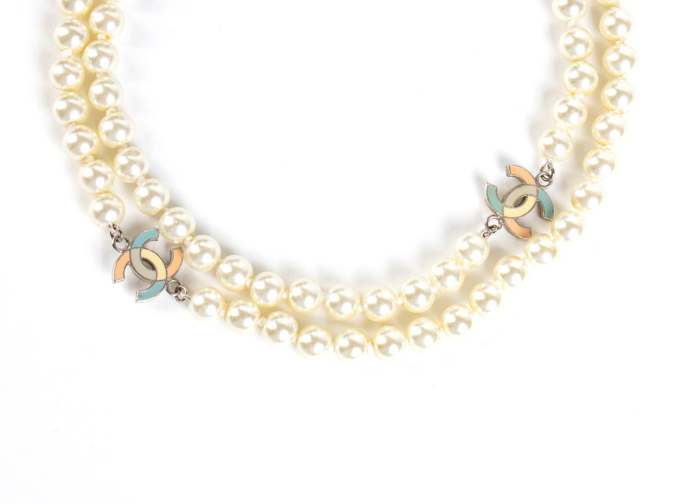 Chanel collana di perle lunghezza 138 cm con possibilità di portarla sia a doppio giro che un giro solo, impreziosita dal logo CC multicolor.