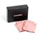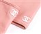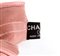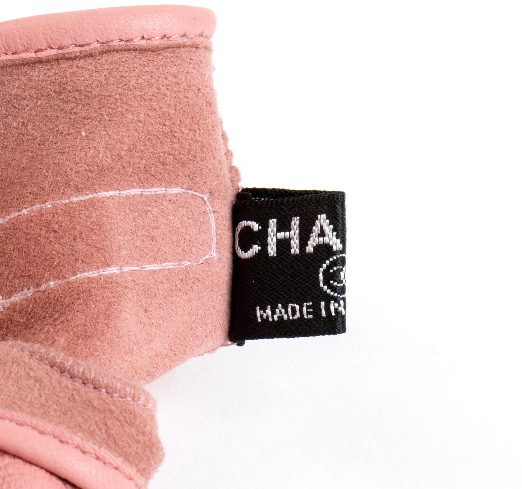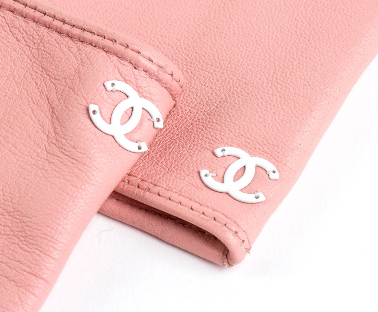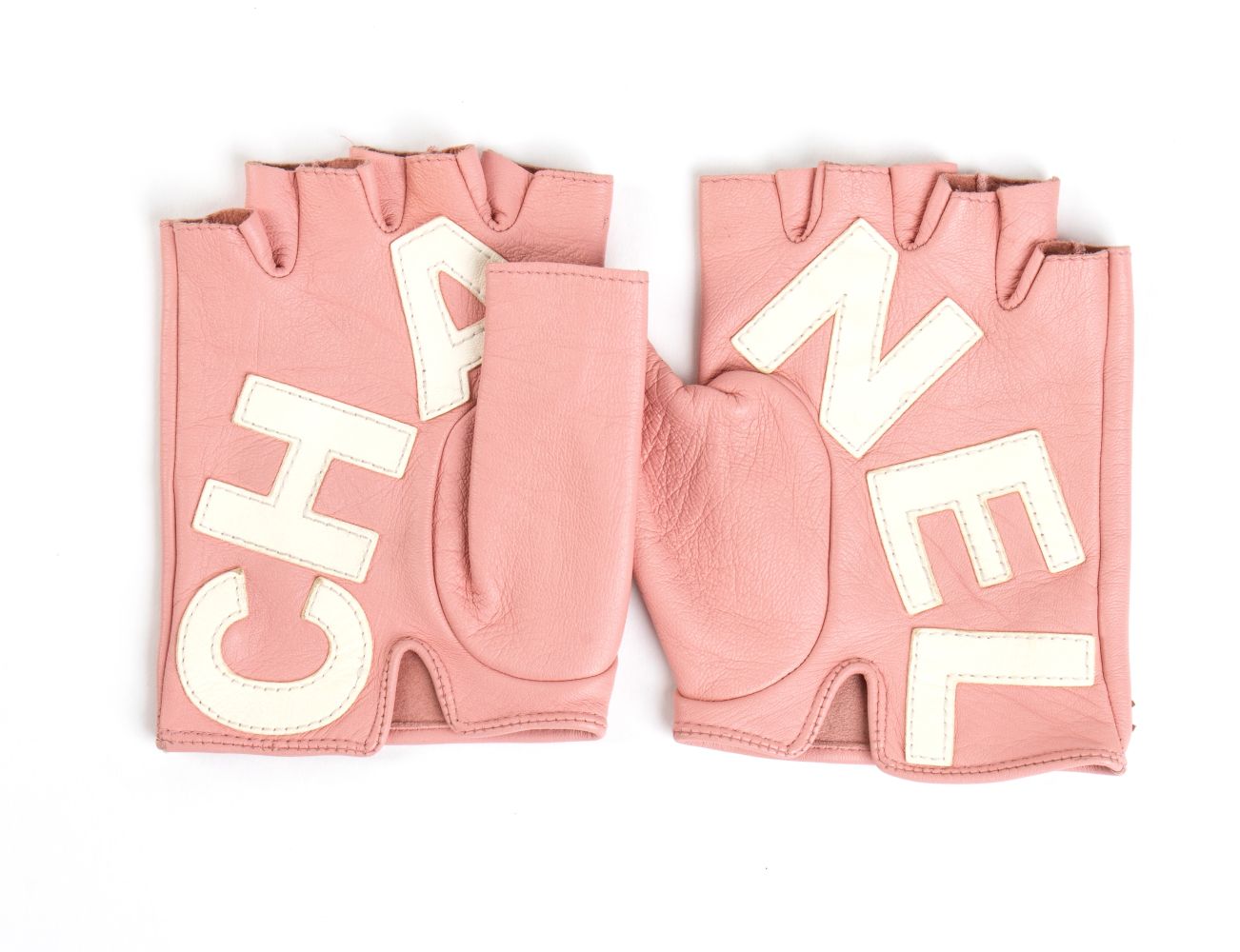 Chanel guanti senza dita in pelle di agnello rosa e bianca con logo Chanel bianco su di esso.
