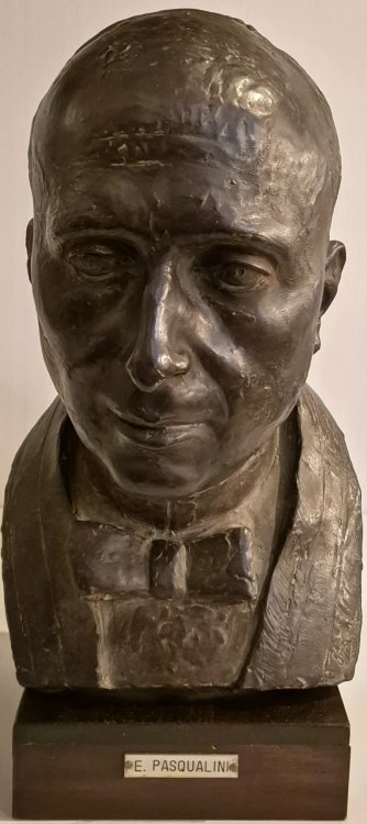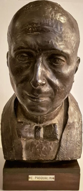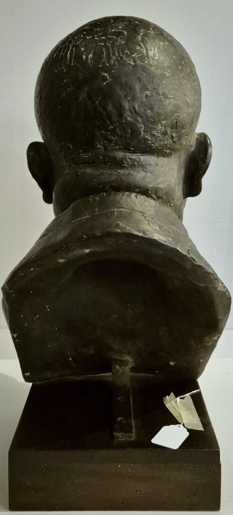 Enzo Pasqualini (Bologna, 1916 – Bologna, 1998). Busto di uomo in marsina e cravatta con fiocco a farfalla. Scultura in terracotta a patina bronzo scuro. Base in legno. Cm. 45x27,5x25. Misure complessive cm. 52x49,5x47.