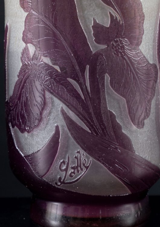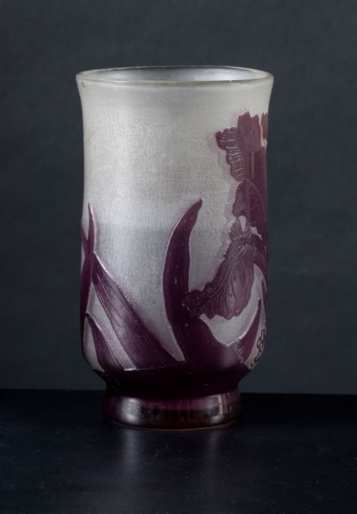 Émile Gallé (1846 - 1904), Francia. Vaso in vetro a forma di calice di tulipano lavorato ad acido ed a cammeo. Decoro di Iris di colore purpureo su fondo bianco, firmato Gallé. Cm. 17, diam cm. 10.