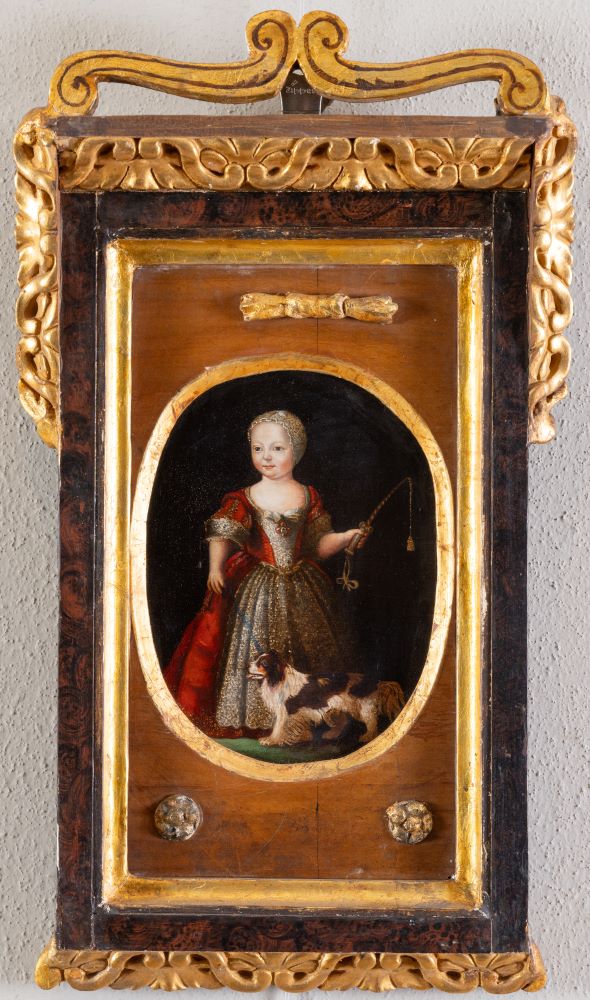 Nella ritrattistica infantile europea di questa fase i caratteri dell’abbigliamento prevedevano l’uso della veste con larga gonna, indistintamente, sino ai cinque anni di età circa, per maschi e femmine. La cuffia e la presenza due bande di tessuto cucite posteriormente alla veste, utilizzate per insegnare ai bambini a camminare, suggeriscono un’età entro i due anni. L’inserimento del cagnolino rappresenta un elemento estremamente diffuso del periodo.