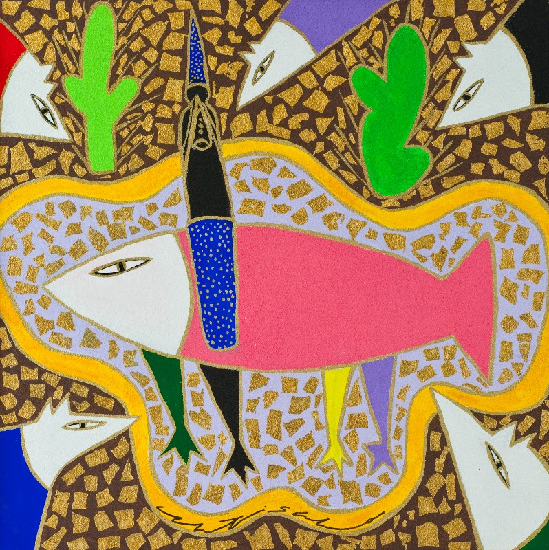 Giancarlo Montuschi (Faenza 1952) SENZA TITOLO Acrilico, sabbia e foglia oro su tela, cm. 100x100 Firmato in basso al centro.