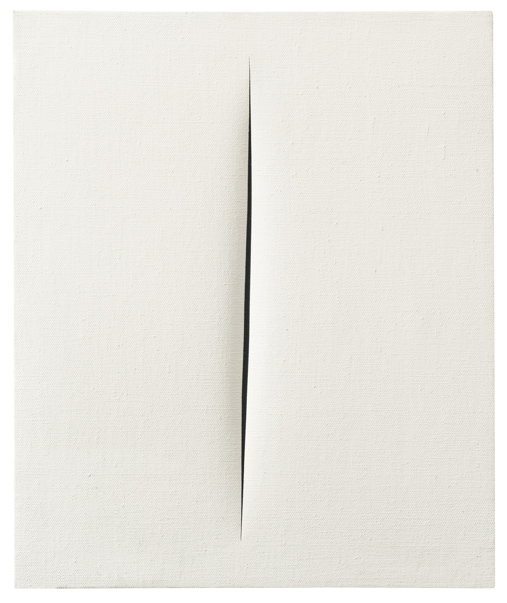 LUCIO FONTANA 1899 - 1968 CONCETTO SPAZIALE, ATTESA signed, titled, dedicated and inscribed on the reverse, waterpaint on canvas. Executed in 1965 firmato, intitolato, dedicato tu al Lerner, e iscritto il blu del cielo il blu del mare, il sangue bleu... sul retro idropittura su tela cm 54x45 Eseguito nel 1965 PROVENANCE Studio Marconi, Milano Collezione Franco Frascarolo, Valenza Po Ivi acquisito dall’attuale proprietario EXHIBITED Alessandria, ex complesso conventuale di San Francesco, Lo sguardo indiscreto. Arte del XX Secolo dalle collezioni alessandrine, Alessandria 2000-2001 Valenza, Villa Scalcabarozzi, Tesori d’Arte a Valenza. Capolavori dalle Collezioni Private, 2014, pp.122-123, illustrato a colori LITERATURE Enrico Crispolti, Lucio Fontana. Catalogue Raisonné, Bruxelles 1974, vol. II, p. 164 Enrico Crispolti, Lucio Fontana. Catalogo generale, Milano 1986, vol. II, p. 576, n. 65 T 86 Enrico Crispolti, Lucio Fontana. Catalogo ragionato di sculture, dipinti, ambientazioni, Milano 2006, vol. II, p. 762, n. 65 T 86