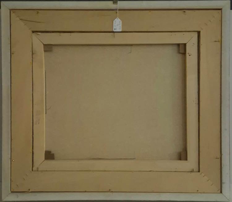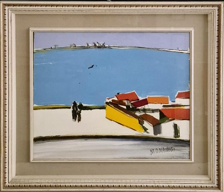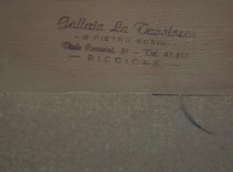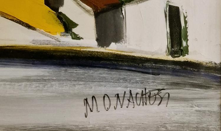Acrilici su tela. Firmato al verso in basso a destra Monachesi. Al verso timbro Galleria La Tavolozza, Riccione.