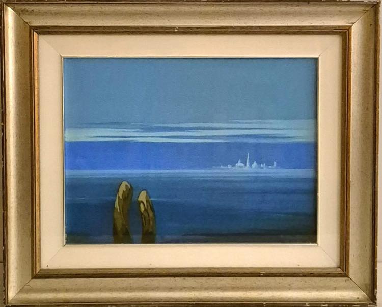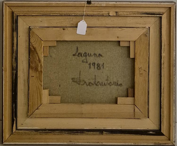 Salvatore Fratantonio (Modica 1938). Laguna, 1981. Cm 30x40 - in cornice cm 48x57,5. Olio su tela. Firmato in basso a destra "Fratantonio". Titolato, datato e firmato sul retro "Laguna 1981 Fratantonio".