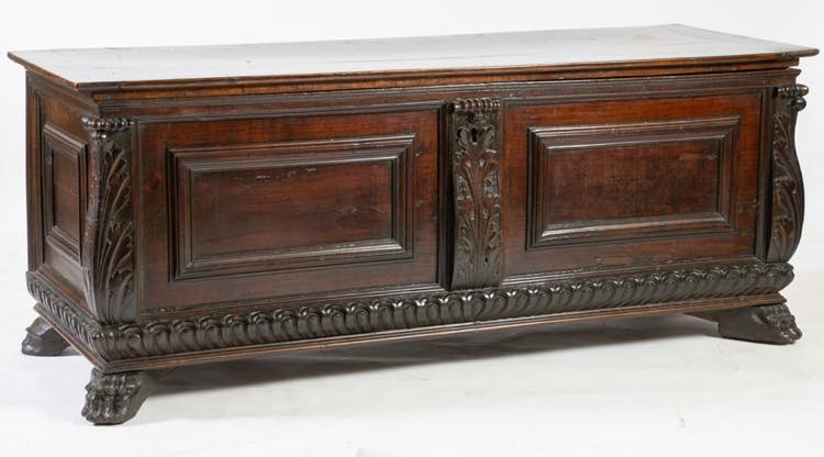 Manifattura lombardoveneta, XVII secolo. Cassapanca in massello di noce.