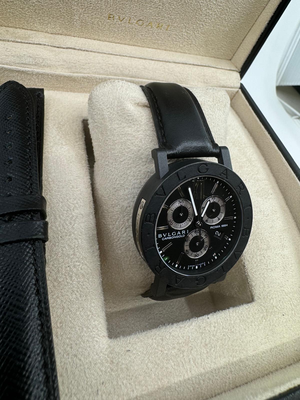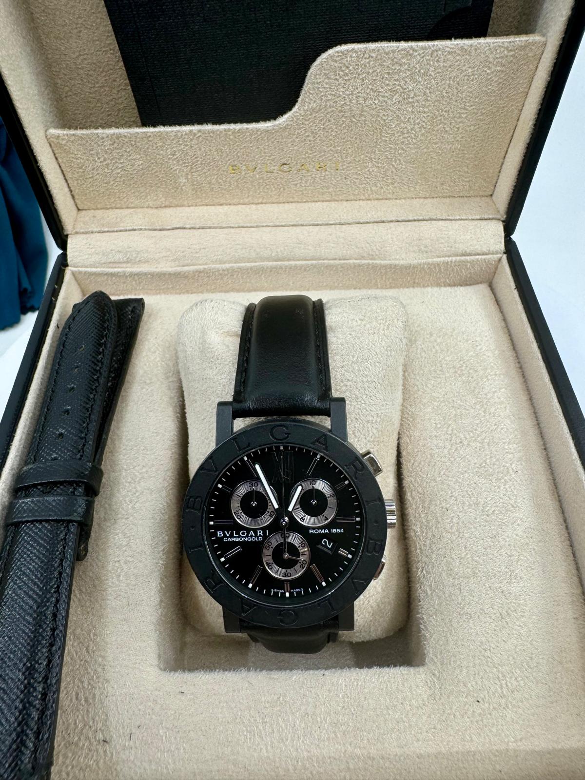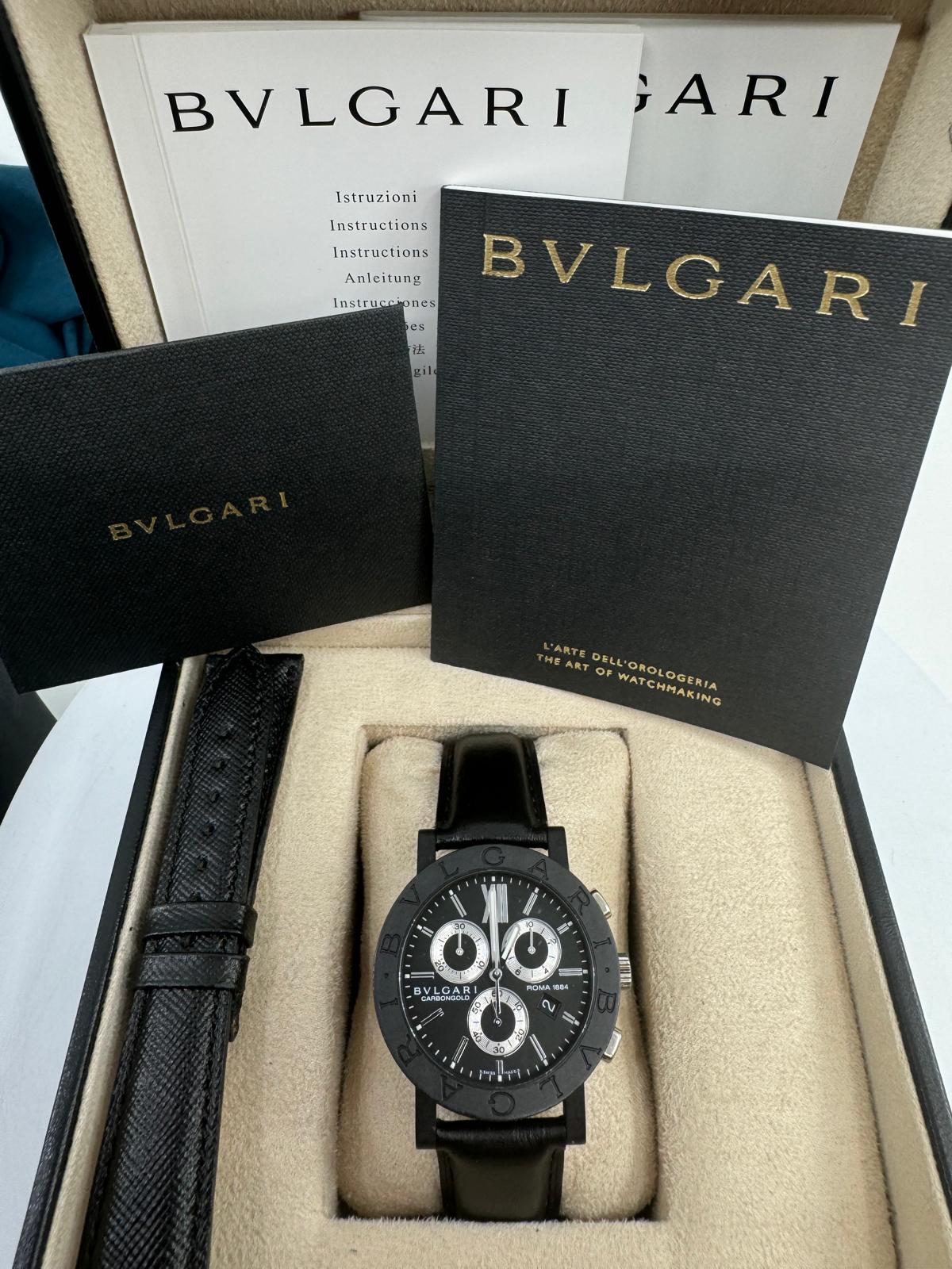 Marca Bulgari Modello (Orologio) Bulgari Numero di referenza BB 38 CL CH Carica Quarzo Materiale della cassa Carbonio Materiale cinturino Pelle Anno di produzione 2021 Con scatola originale e documenti originali Carica Quarzo Cassa Materiale della cassa Carbonio Diametro 38 mm Impermeabile 3 ATM Materiale lunetta Carbonio Vetro Vetro zaffiro Quadrante Nero Numeri sul quadrante Arabi Cinturino Materiale cinturino Pelle Colore cinturino Nero Chiusura Chiusura ad ardiglione Funzioni Cronografo