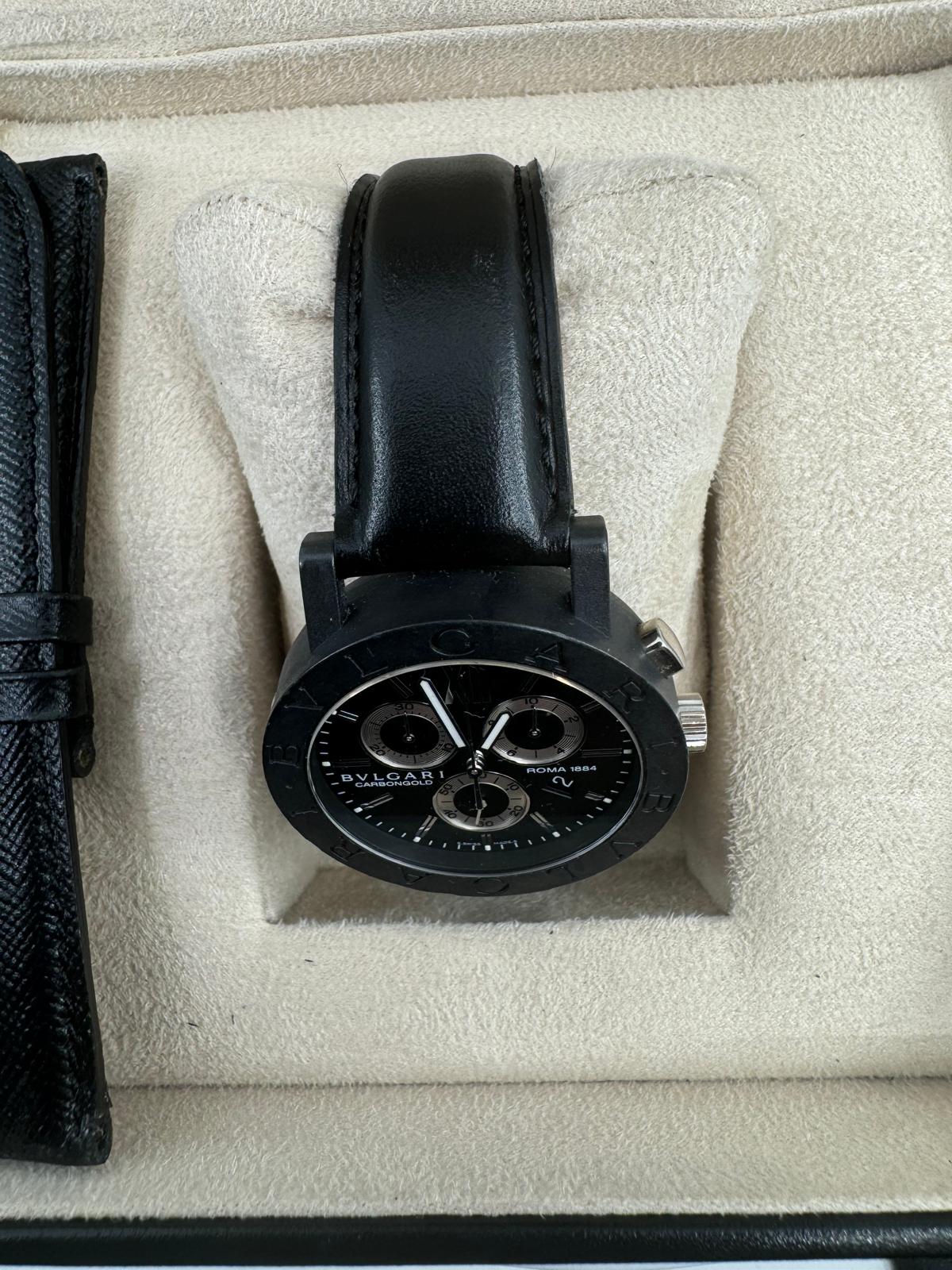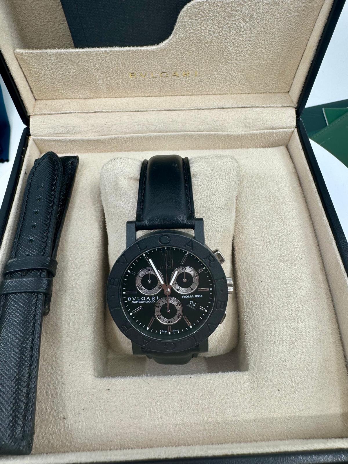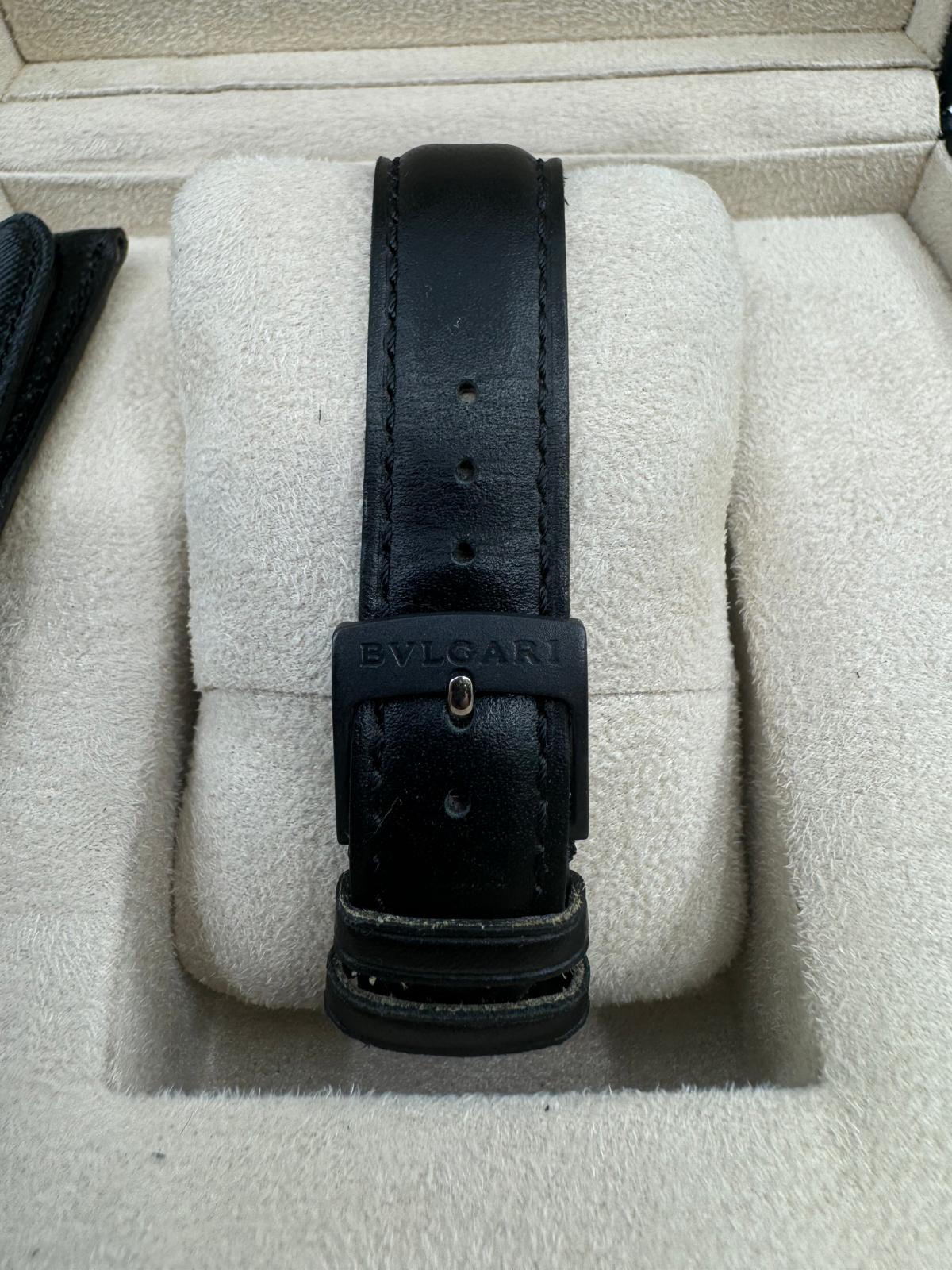 Marca Bulgari Modello (Orologio) Bulgari Numero di referenza BB 38 CL CH Carica Quarzo Materiale della cassa Carbonio Materiale cinturino Pelle Anno di produzione 2021 Con scatola originale e documenti originali Carica Quarzo Cassa Materiale della cassa Carbonio Diametro 38 mm Impermeabile 3 ATM Materiale lunetta Carbonio Vetro Vetro zaffiro Quadrante Nero Numeri sul quadrante Arabi Cinturino Materiale cinturino Pelle Colore cinturino Nero Chiusura Chiusura ad ardiglione Funzioni Cronografo