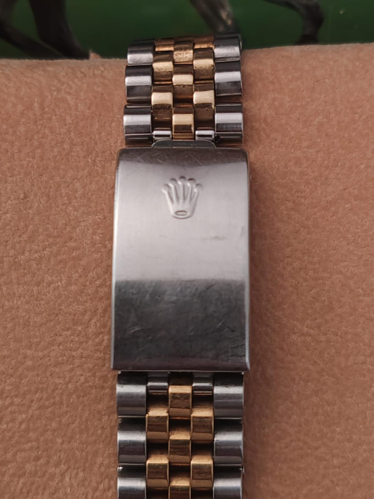Marca Rolex Modello (Orologio) Datejust 36 Numero di referenza 16233 Carica Automatico Materiale della cassa Oro/Acciaio Materiale cinturino Oro/acciaio Anno di produzione 96/97 (Anno approssimativo) Condizione Buono (segni di usura o graffi poco visibili o visibili) Corredo Senza scatola originale né documenti originali Carica Automatico Materiale della cassa Oro/Acciaio Diametro 36 mm Impermeabile 10 ATM Materiale lunetta Oro giallo Vetro Vetro zaffiro Quadrante Champagne Numeri sul quadrante Senza numeri Cinturino Materiale cinturino Oro/acciaio Colore cinturino Oro/acciaio Chiusura Déployante Materiale chiusura Acciaio