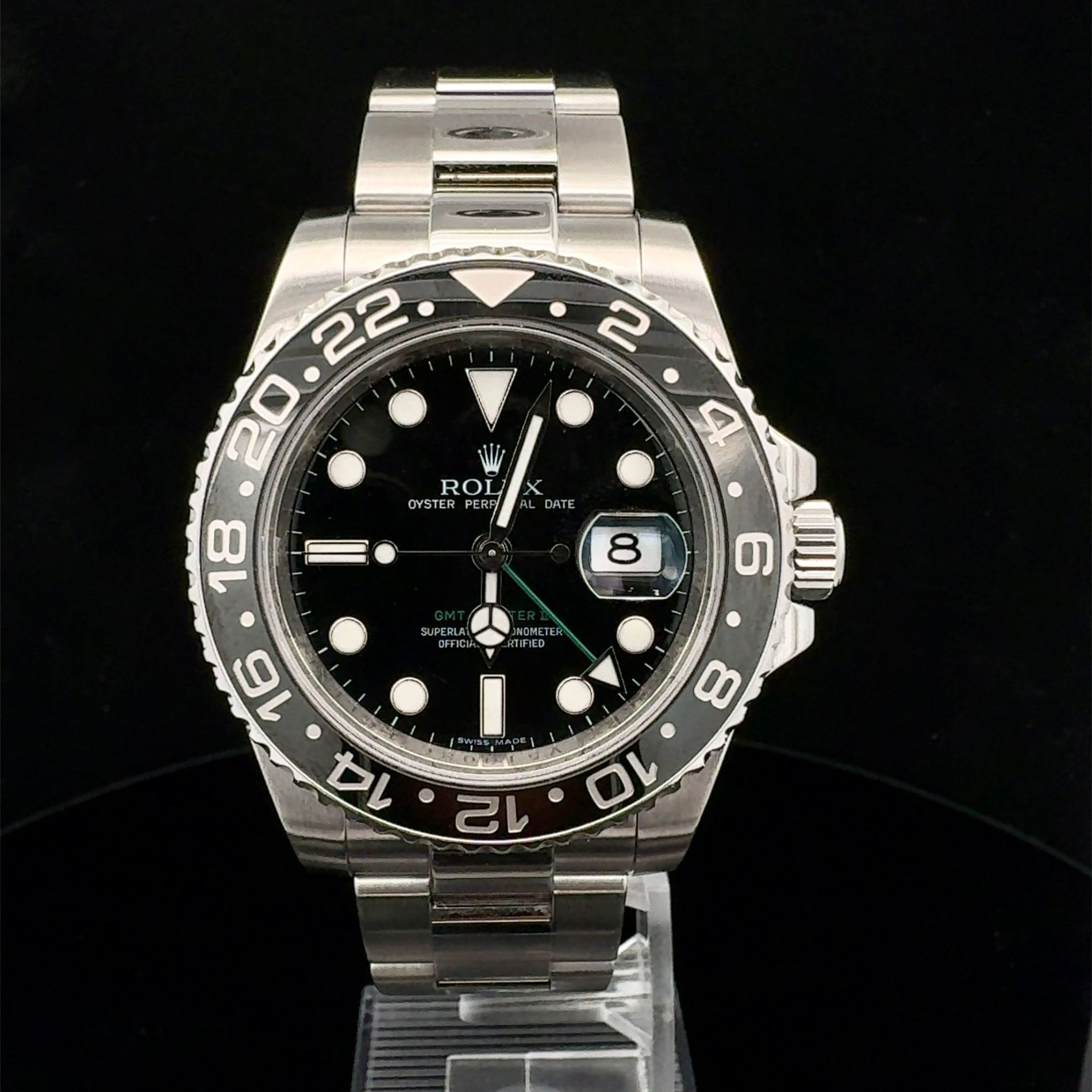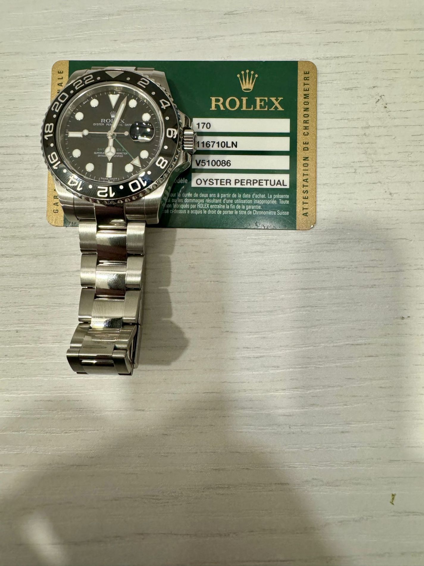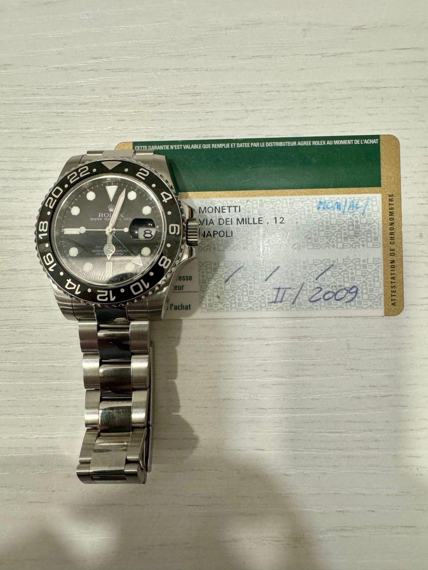 Marca Rolex Modello (Orologio) GMT-Master II Referenza 116710LN Carica Automatico Materiale della cassa Acciaio Materiale cinturino Acciaio Anno di produzione 2009 Condizione Ottimo Corredo: con garanzia originale Rolex italiana, no box Diametro 40 mm Prova Impermeabile 10 ATM Materiale lunetta Ceramica Vetro zaffiro Quadrante Nero Funzioni Data, GMT