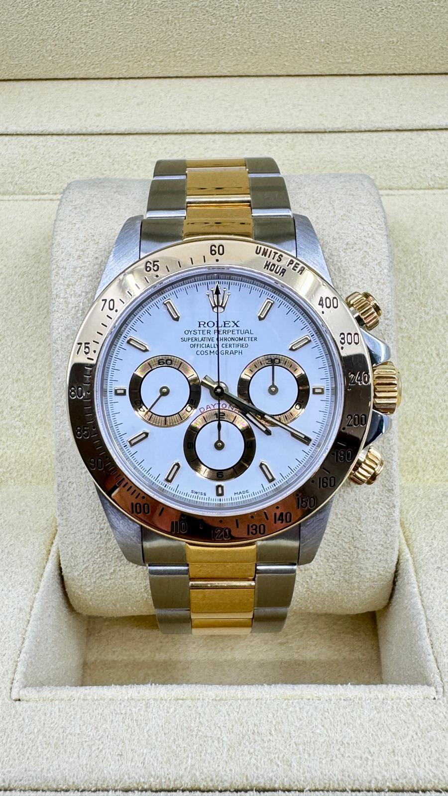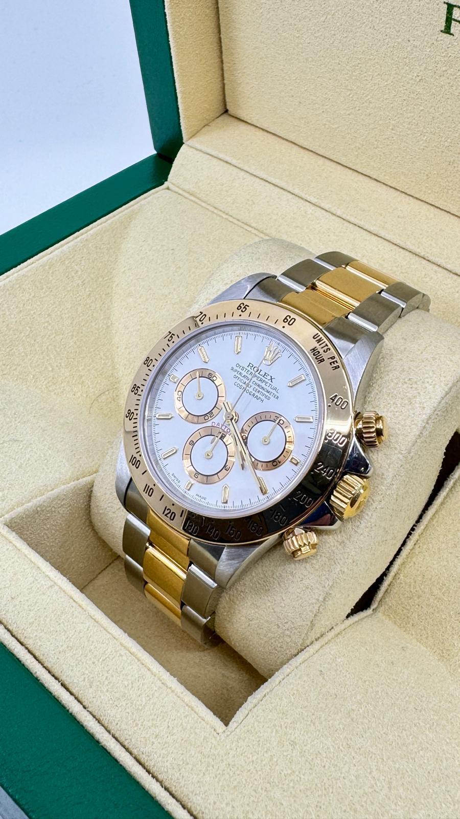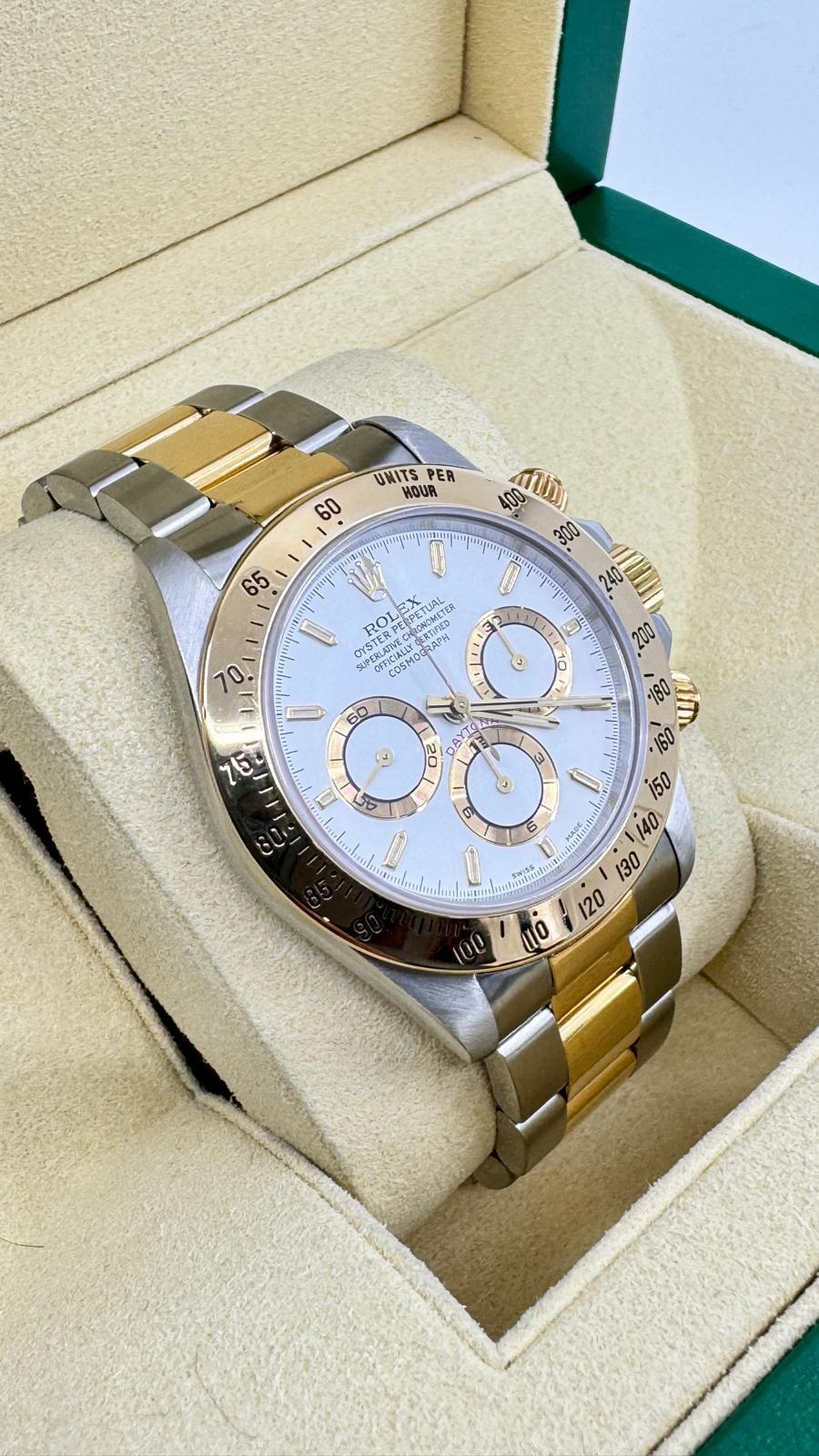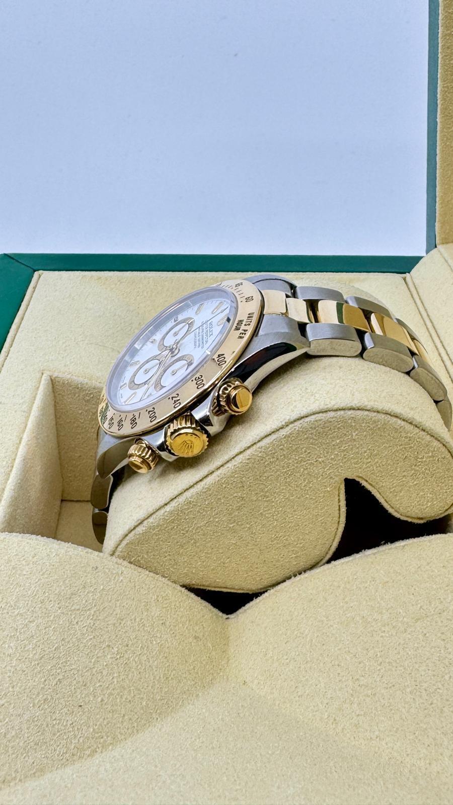 Marca Rolex Daytona Numero di referenza 16523 Carica Automatico Materiale della cassa Oro/Acciaio Materiale cinturino Oro/acciaio Anni 90 documenti originali Rolex, no box Calibro Carica Automatico Cassa Materiale della cassa Oro/Acciaio Diametro 40 mm Impermeabile 10 ATM Materiale lunetta Oro giallo Vetro Vetro zaffiro Cinturino Materiale cinturino Oro/acciaio Colore cinturino Oro/acciaio Chiusura Déployante Materiale chiusura Oro/Acciaio Funzioni Cronografo