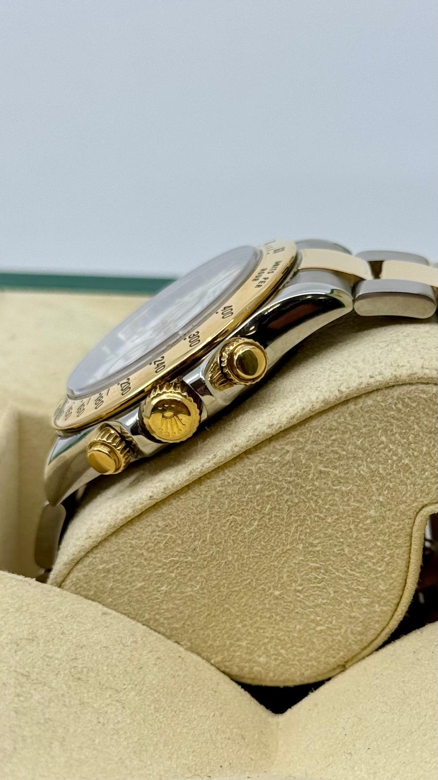 Marca Rolex Daytona Numero di referenza 116523 Carica Automatico Materiale della cassa Oro/Acciaio Materiale cinturino Oro/acciaio Anni 2001/2005 documenti originali Rolex, no box Calibro Carica Automatico Cassa Materiale della cassa Oro/Acciaio Diametro 40 mm Impermeabile 10 ATM Materiale lunetta Oro giallo Vetro Vetro zaffiro Cinturino Materiale cinturino Oro/acciaio Colore cinturino Oro/acciaio Chiusura Déployante Materiale chiusura Oro/Acciaio Funzioni Cronografo