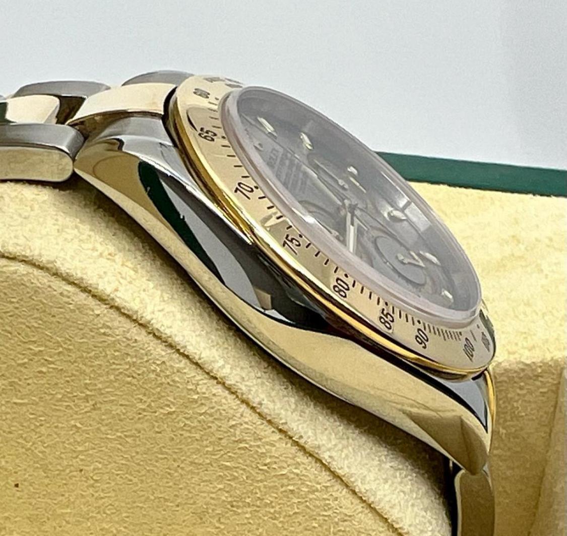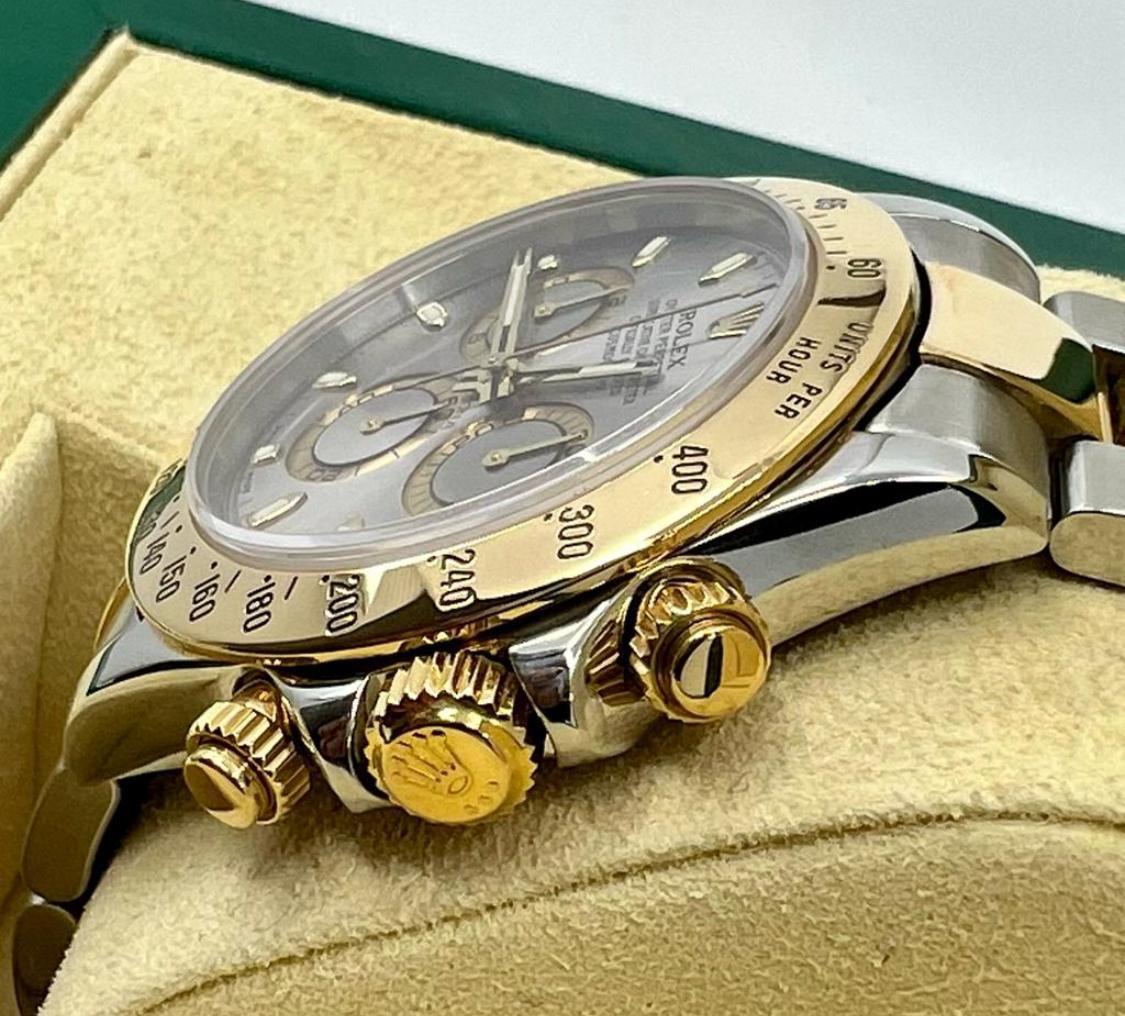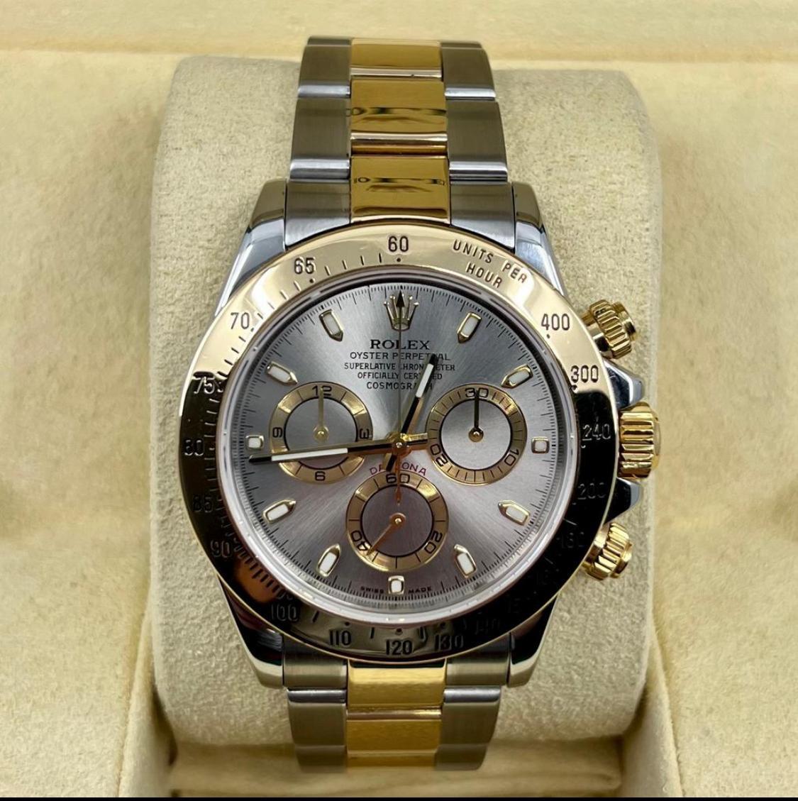 Marca Rolex Daytona Numero di referenza 116523 Carica Automatico Materiale della cassa Oro/Acciaio Materiale cinturino Oro/acciaio Anni 2001/2005 documenti originali Rolex, no box Calibro Carica Automatico Cassa Materiale della cassa Oro/Acciaio Diametro 40 mm Impermeabile 10 ATM Materiale lunetta Oro giallo Vetro Vetro zaffiro Cinturino Materiale cinturino Oro/acciaio Colore cinturino Oro/acciaio Chiusura Déployante Materiale chiusura Oro/Acciaio Funzioni Cronografo