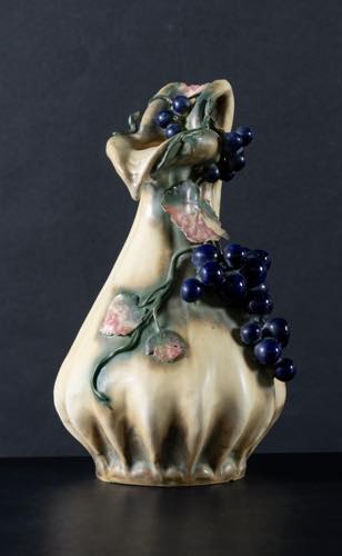 Nei toni del verde, del rosa e del color biscotto con decorazione di tralci di vite e grappoli di uva con acini blu a tutto rilievo.