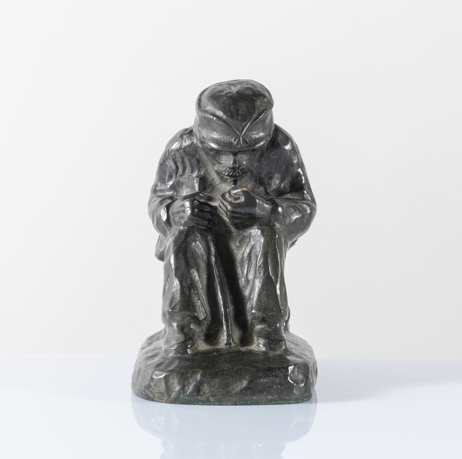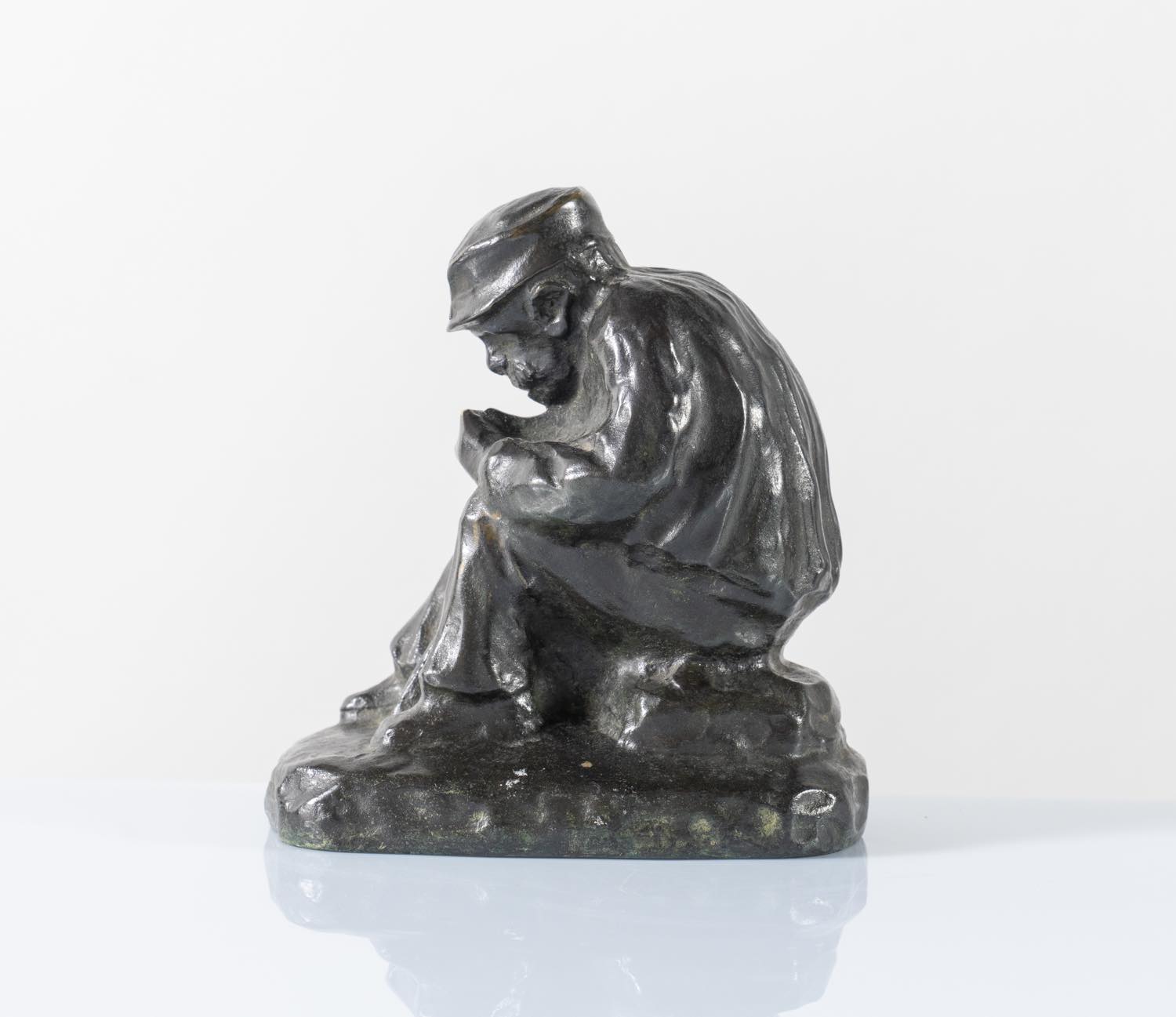 Raffigurante veterano di guerra o anziano lavoratore seduto rannicchiato su se stesso con cappello, pipa e bastone.
