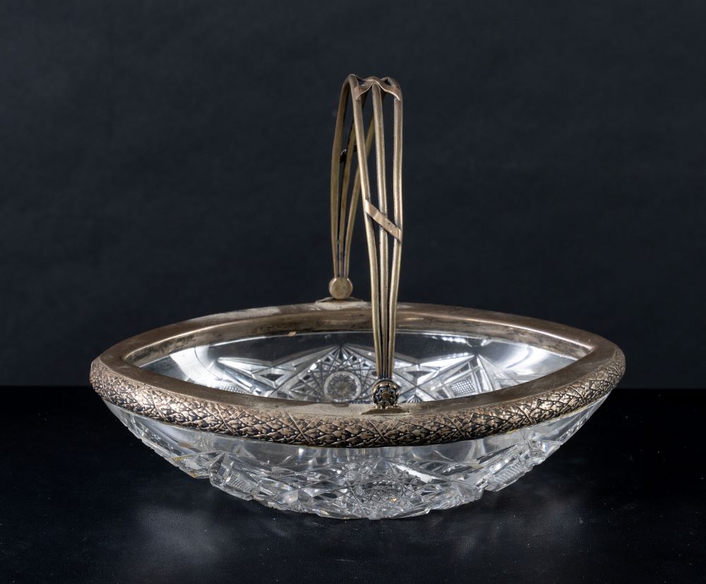Peter Carl Fabergé (San Pietroburgo 1846 - Losanna 1920), attr,. Cestina in cristallo e argento. Bordo superiore e manico in argento 84 zolotnik. Sul bordo superiore reca punzoni: КФаберже, 84, punzone non decifrato, donna di profilo, BA. Difetti e mancanze. Cm 6,5x22x14.