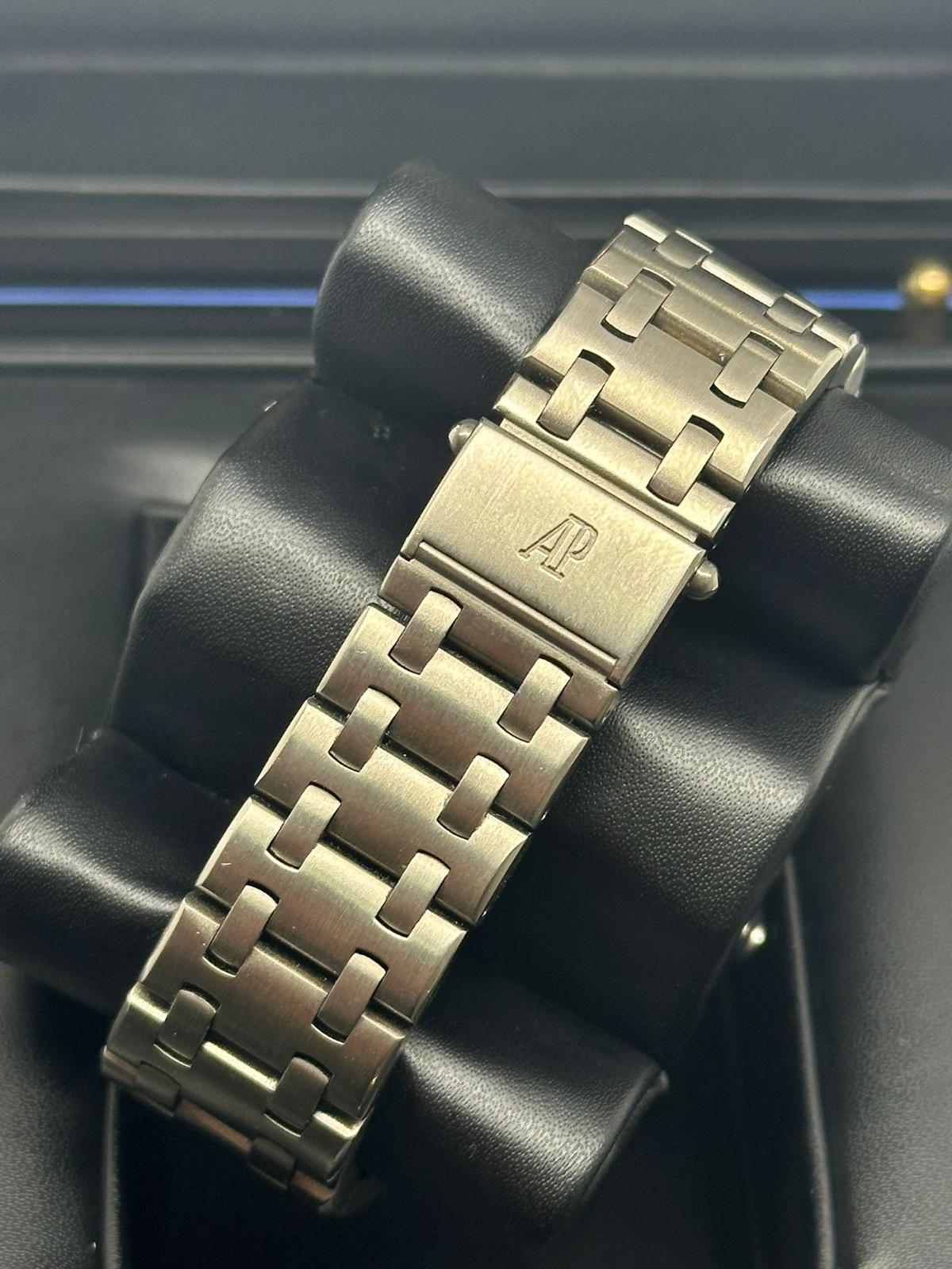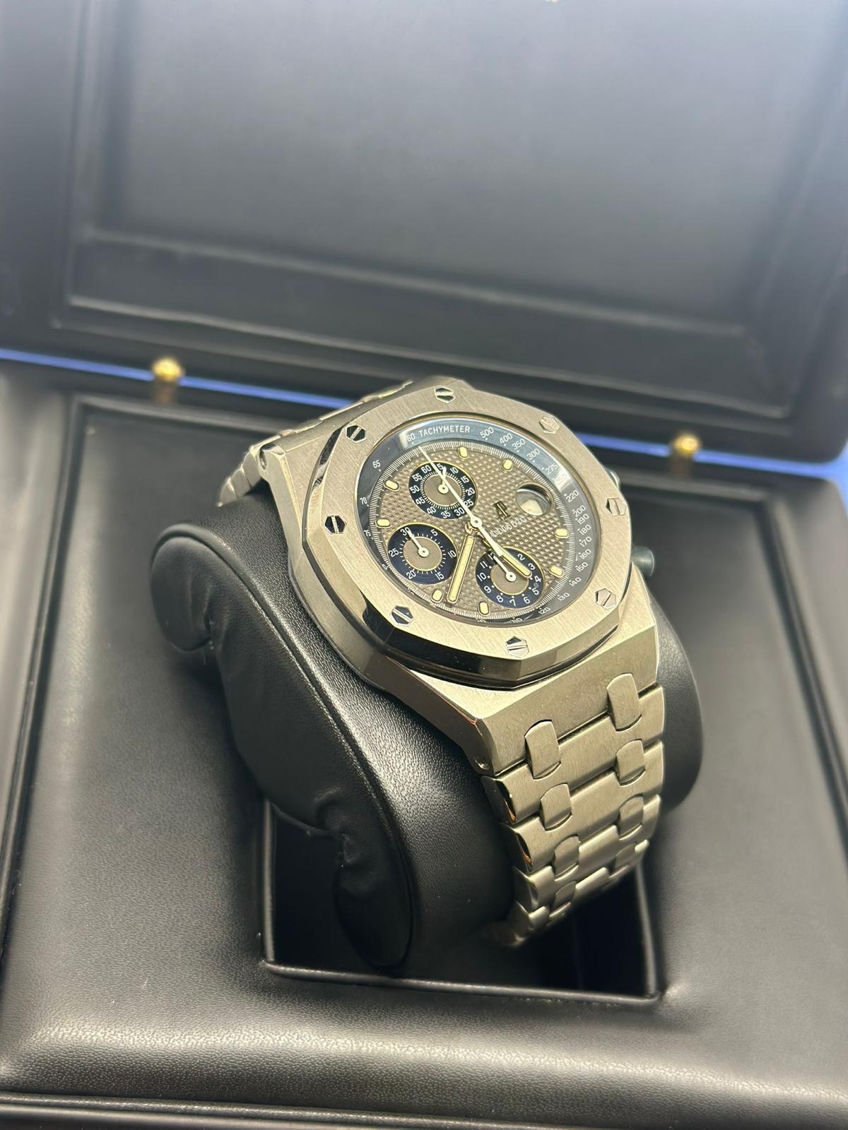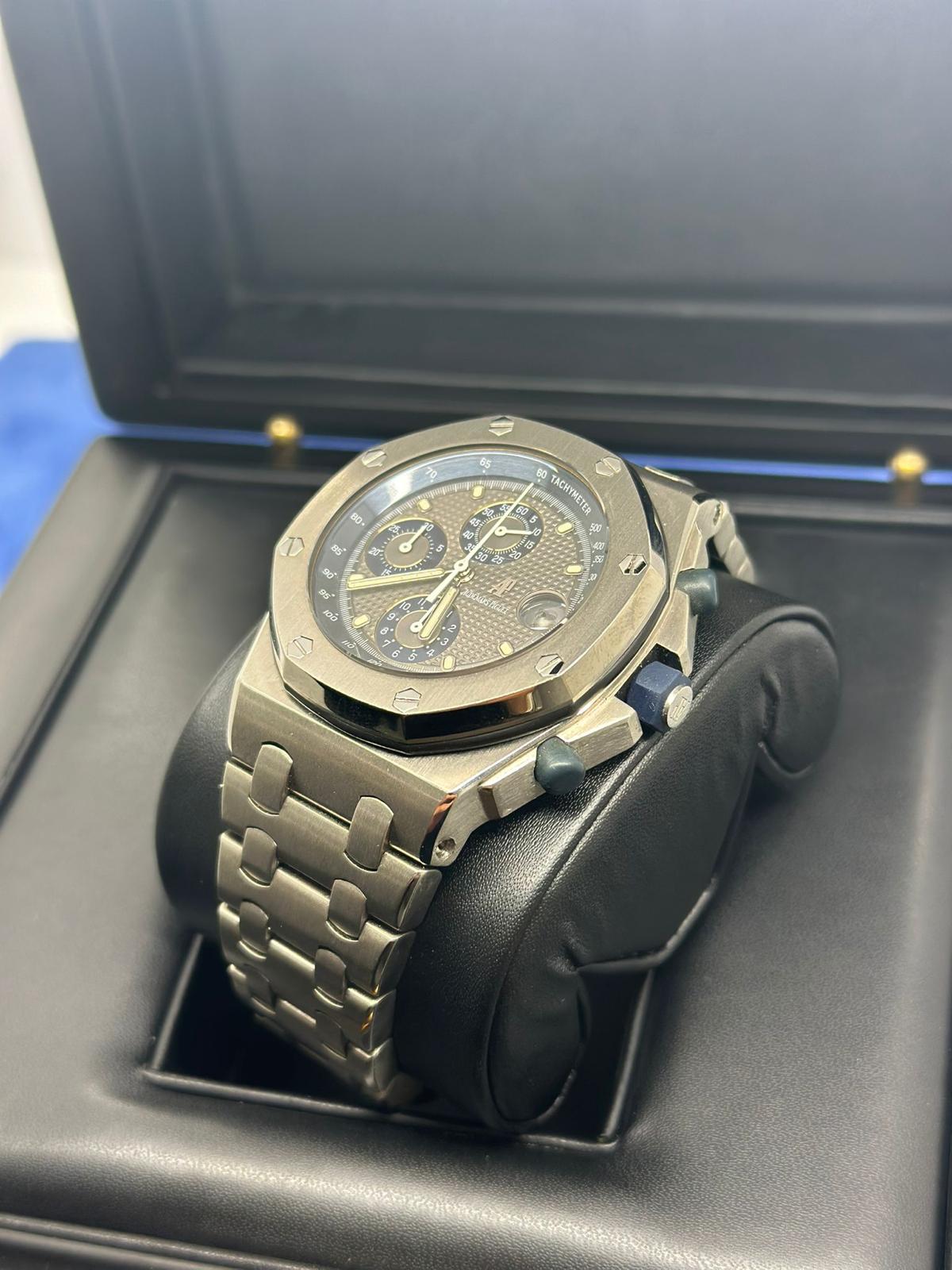 Marca Audemars Piguet Modello (Orologio) Royal Oak Offshore Chronograph Numero di referenza 25721TI.OO.1000TI.01 Carica Automatico Materiale della cassa Titanio Materiale cinturino Titanio Anno di produzione 2002 Condizione Buono (segni di usura o graffi poco visibili o visibili) Corredo Senza scatola originale né documenti originali Calibro Carica Automatico Cassa Materiale della cassa Titanio Diametro 42 mm Vetro Vetro zaffiro Quadrante Grigio Cinturino Materiale cinturino Titanio Funzioni Cronografo, Data