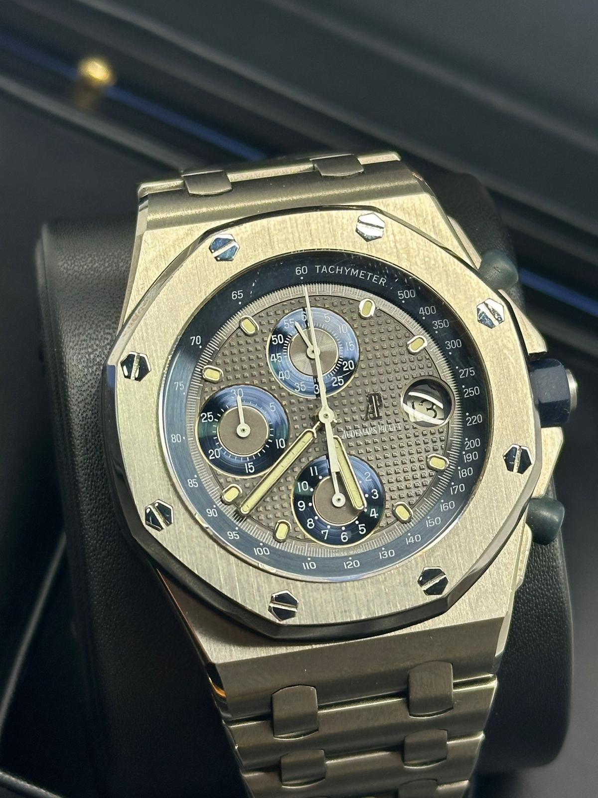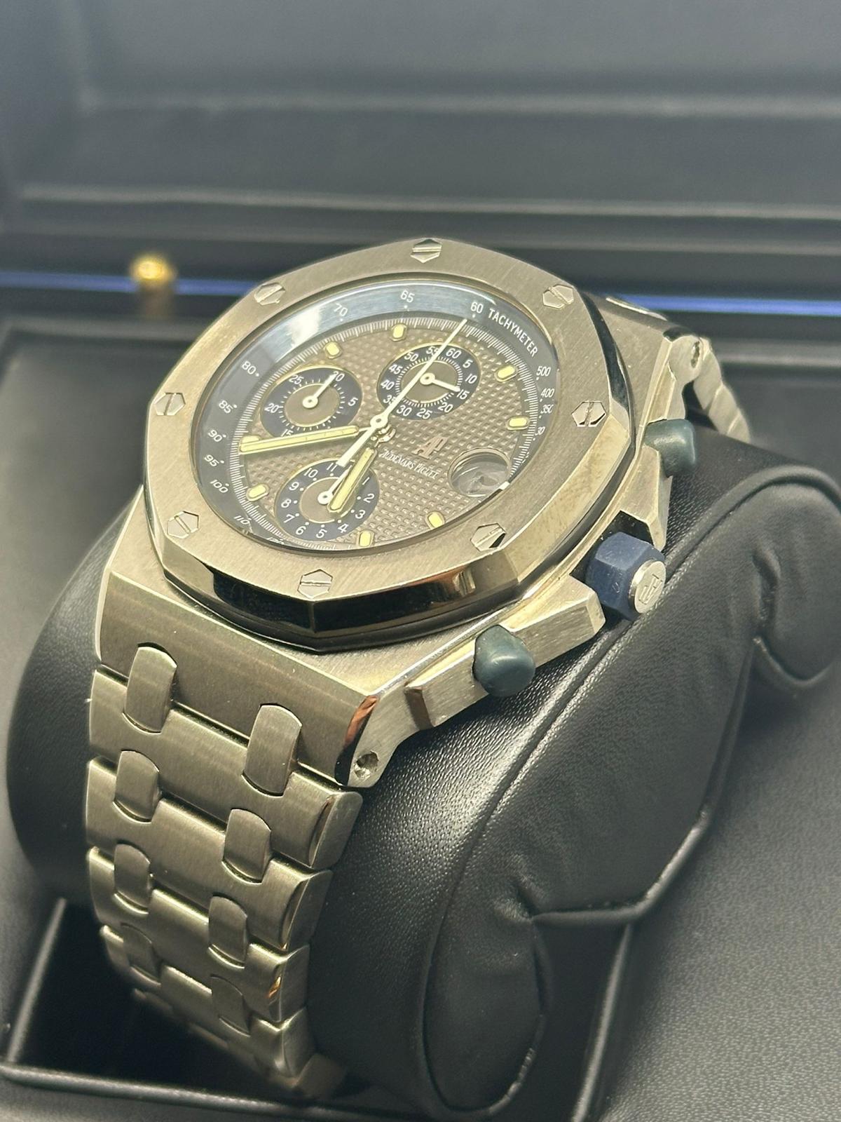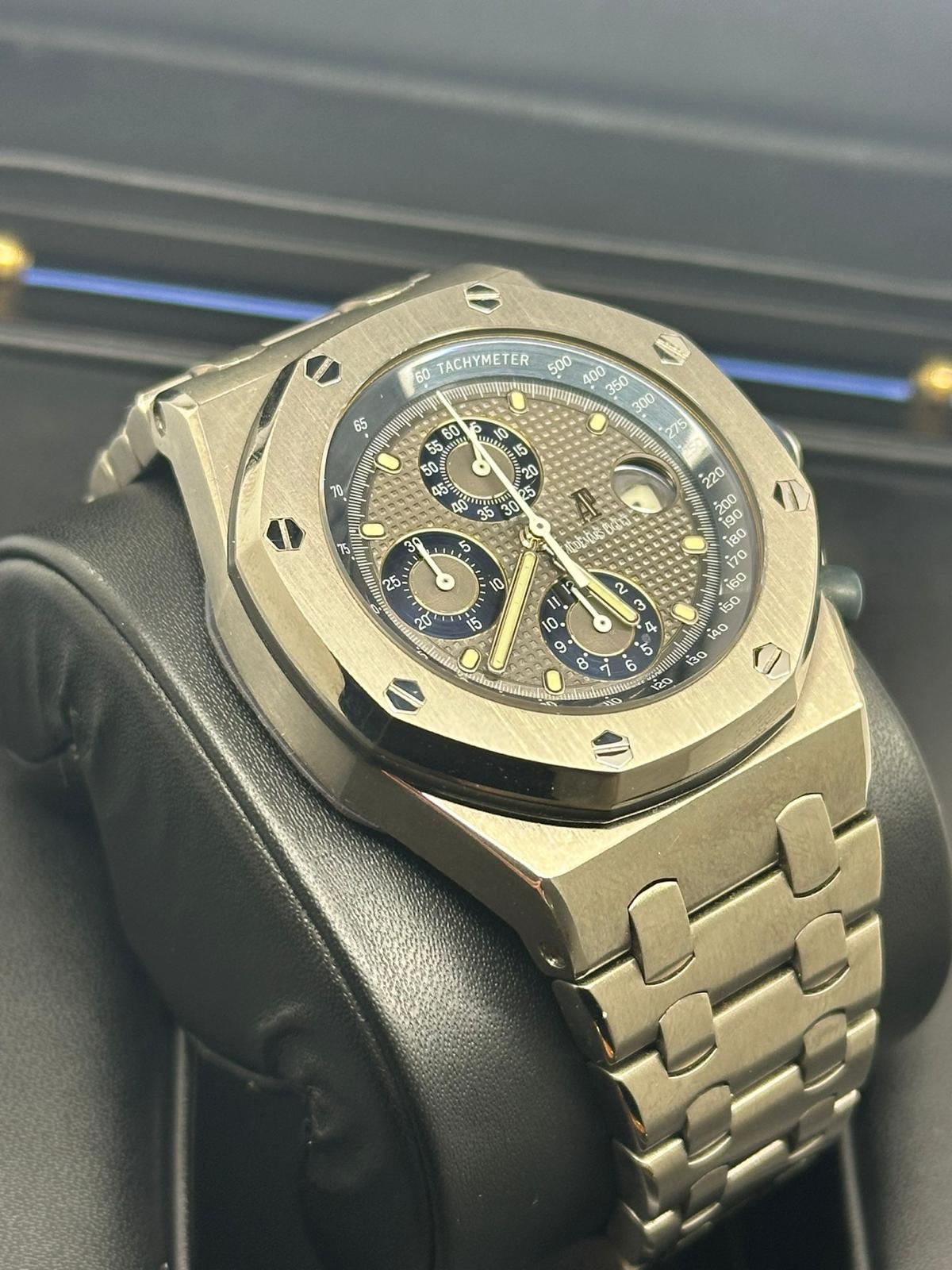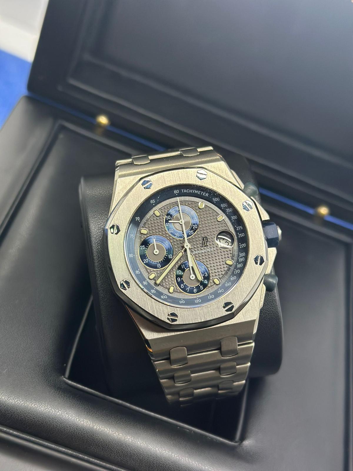 Marca Audemars Piguet Modello (Orologio) Royal Oak Offshore Chronograph Numero di referenza 25721TI.OO.1000TI.01 Carica Automatico Materiale della cassa Titanio Materiale cinturino Titanio Anno di produzione 2002 Condizione Buono (segni di usura o graffi poco visibili o visibili) Corredo Senza scatola originale né documenti originali Calibro Carica Automatico Cassa Materiale della cassa Titanio Diametro 42 mm Vetro Vetro zaffiro Quadrante Grigio Cinturino Materiale cinturino Titanio Funzioni Cronografo, Data