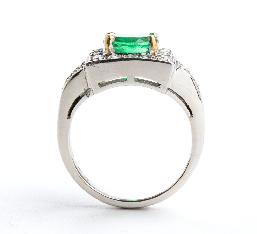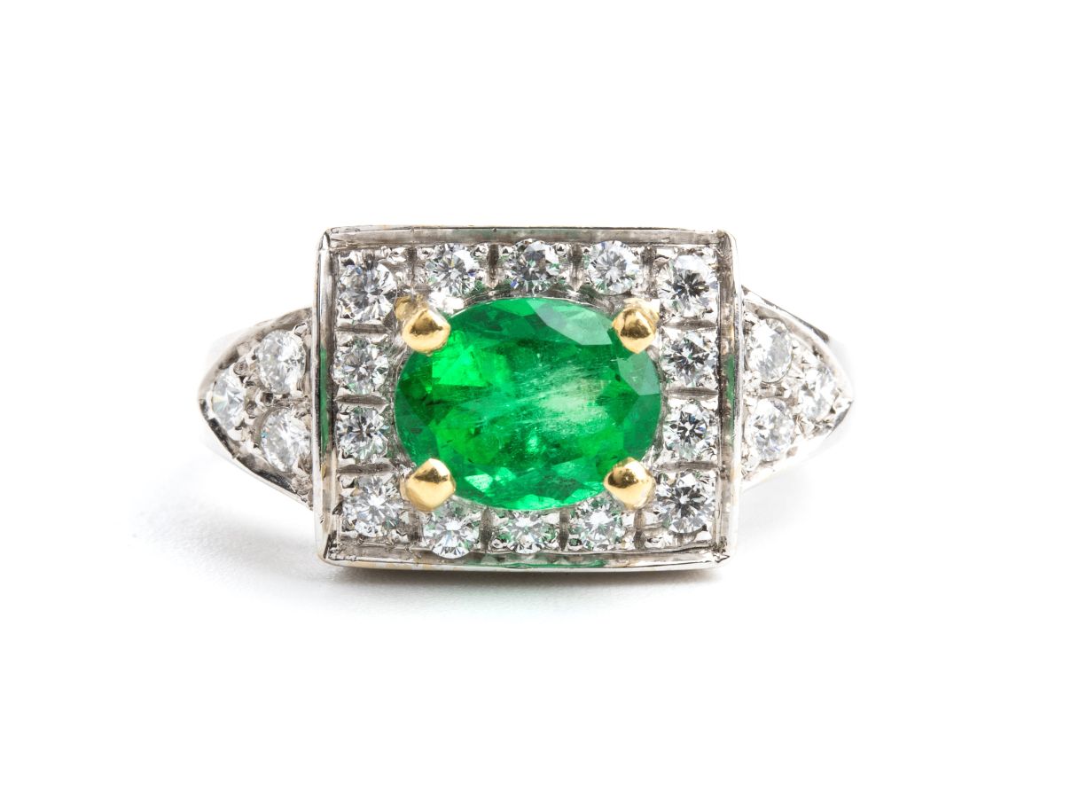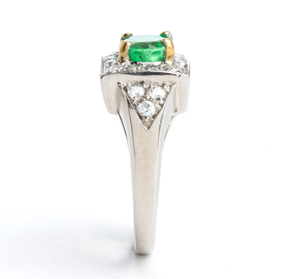 in oro bianco 18k, incastonato con smeraldo ovale contornato da pavè di diamanti.