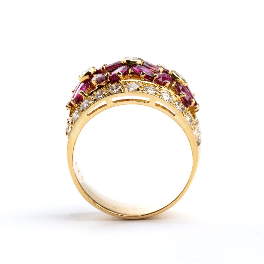 in oro giallo 18k, con tre motivi centrali a fiore in rubini tra profili di diamanti.