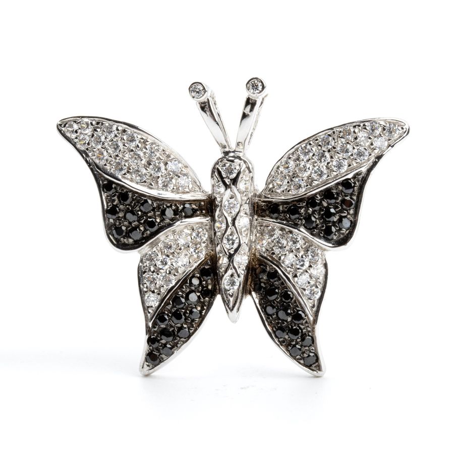 in oro bianco 18k, raffigurante una farfalla dal corpo ed ali decorate con pavè di paste vitree e moissanite nera.