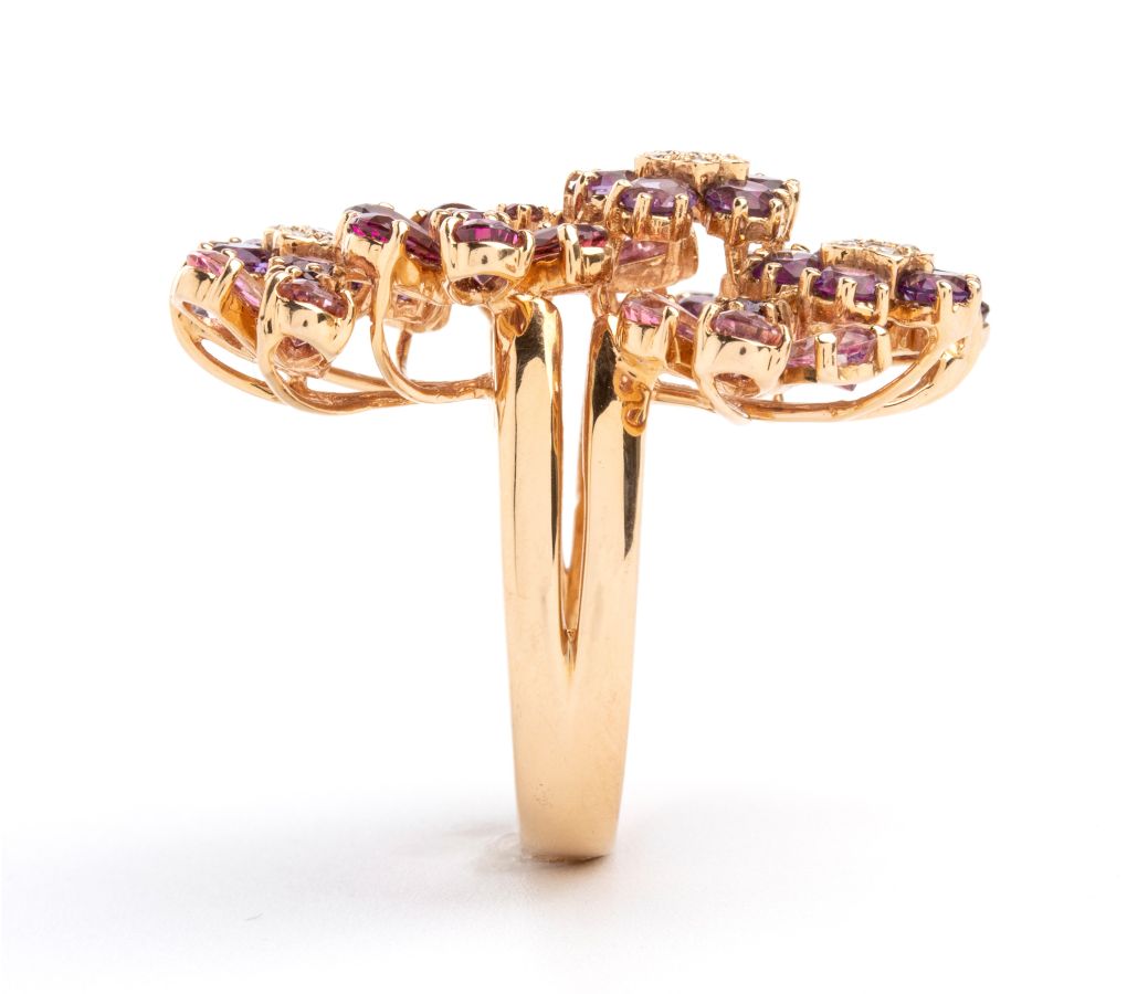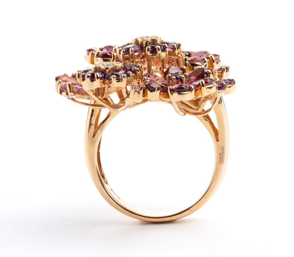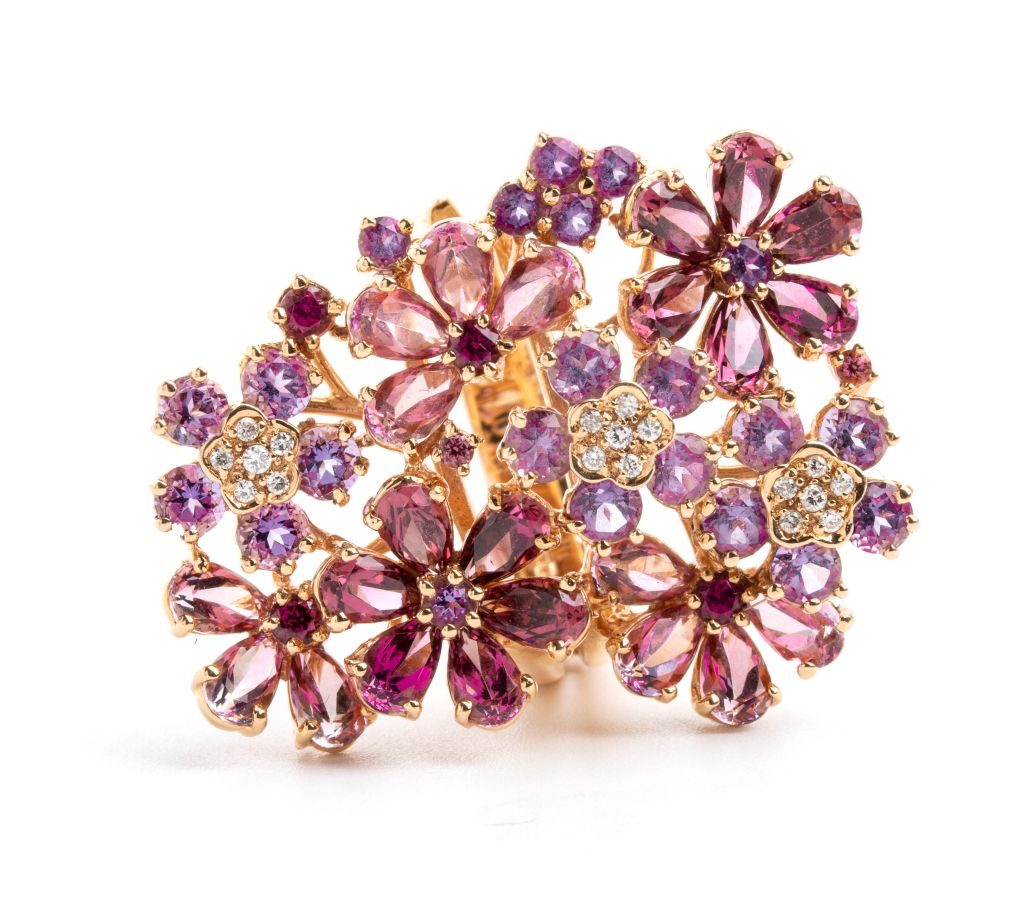 in oro rosa 18k, con bouquet di fiori in ametiste, tormaline e punteggiature di diamanti.