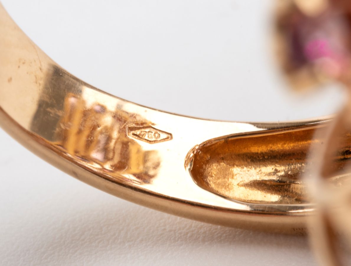 Punzonato "750 - 53 FE". Misura ITA 15 - Misura USA 7. Dimensione fronte: 3,2 x 2,4 cm. Peso: 12 gr.