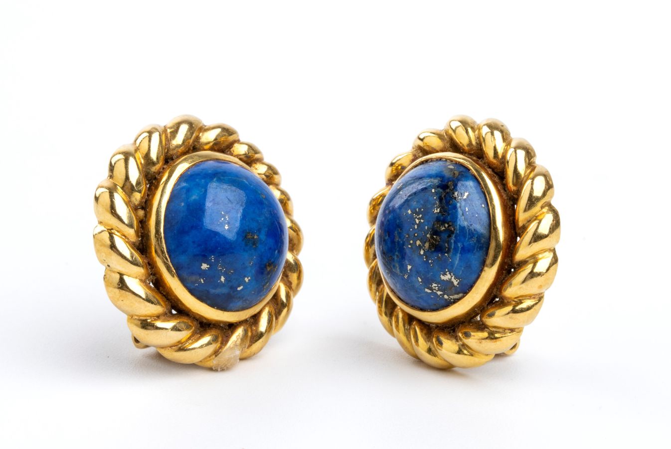 ciascuno incastonato con cabochon di lapislazzuli tra cornice godronata.