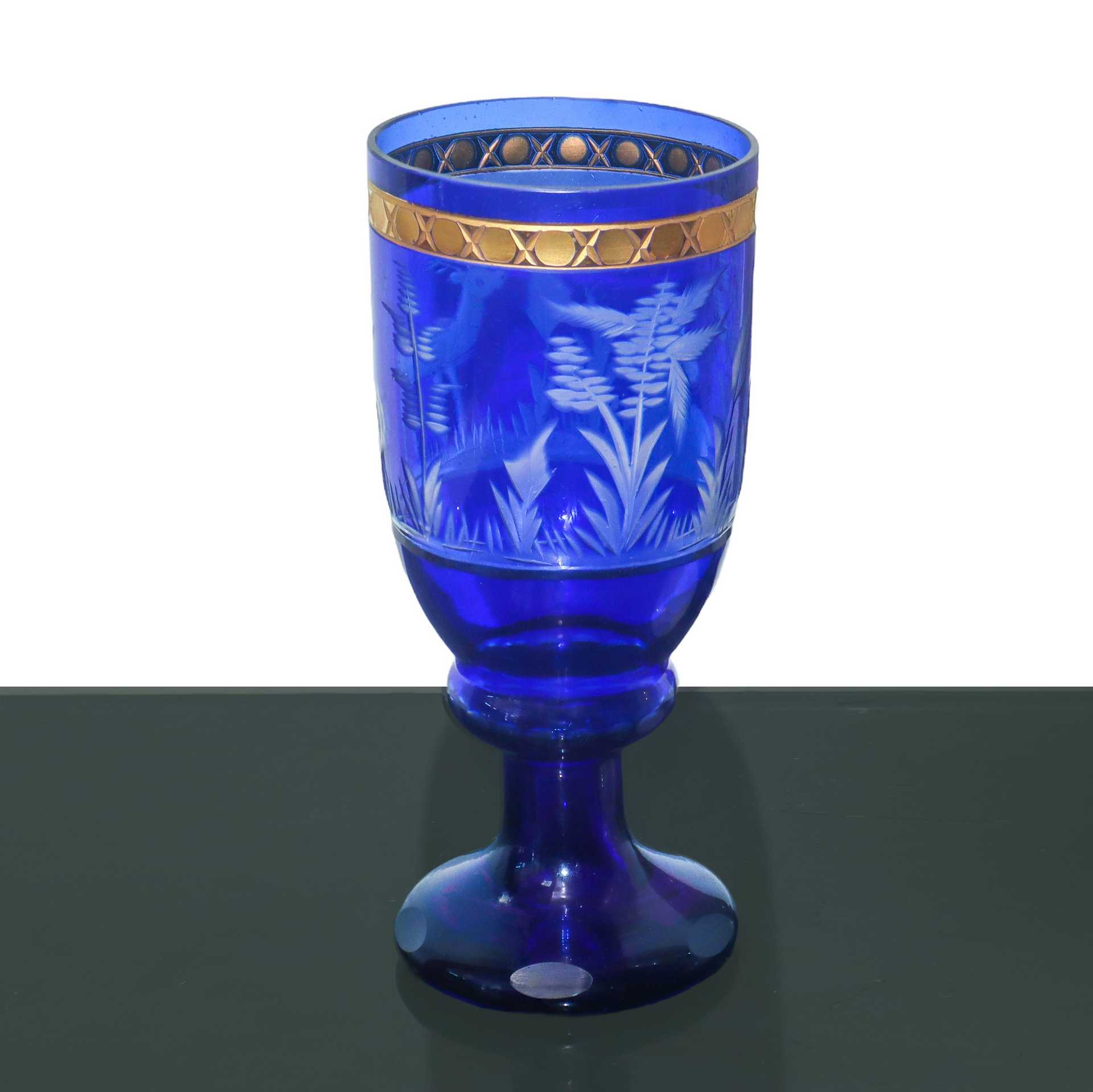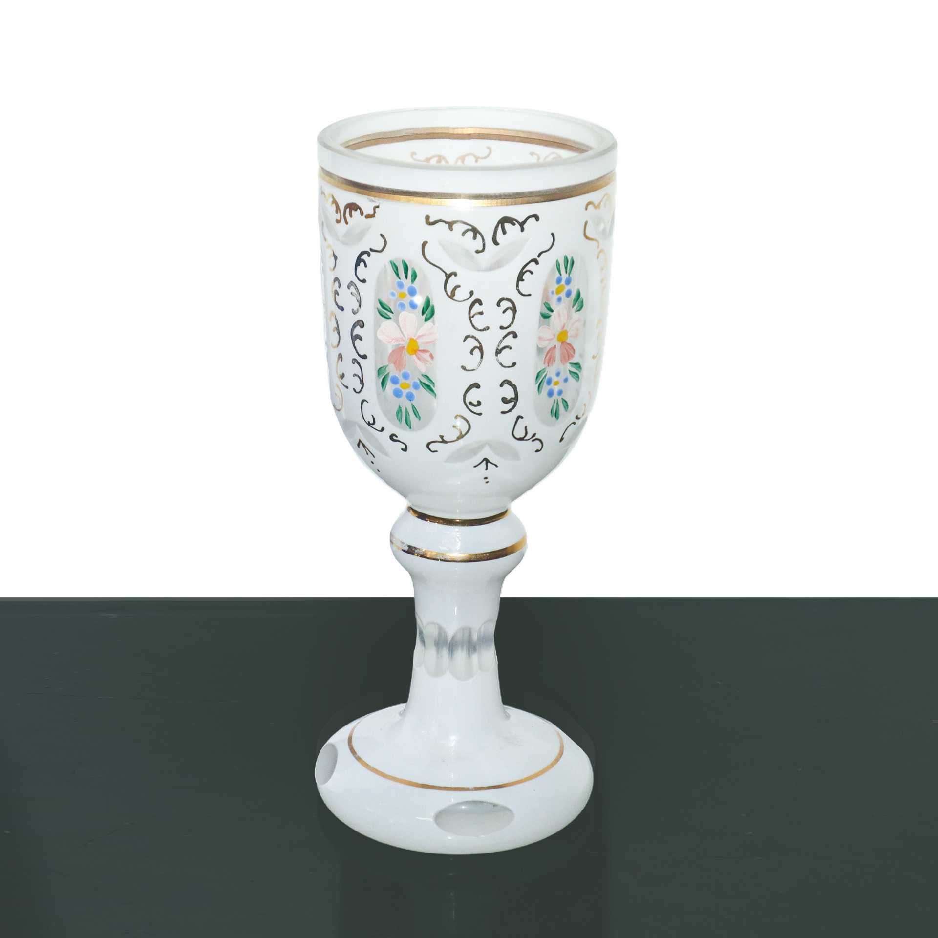 Due bicchieri in vetro di murano uno blu e uno bianco dipinti e incisi sul fronte