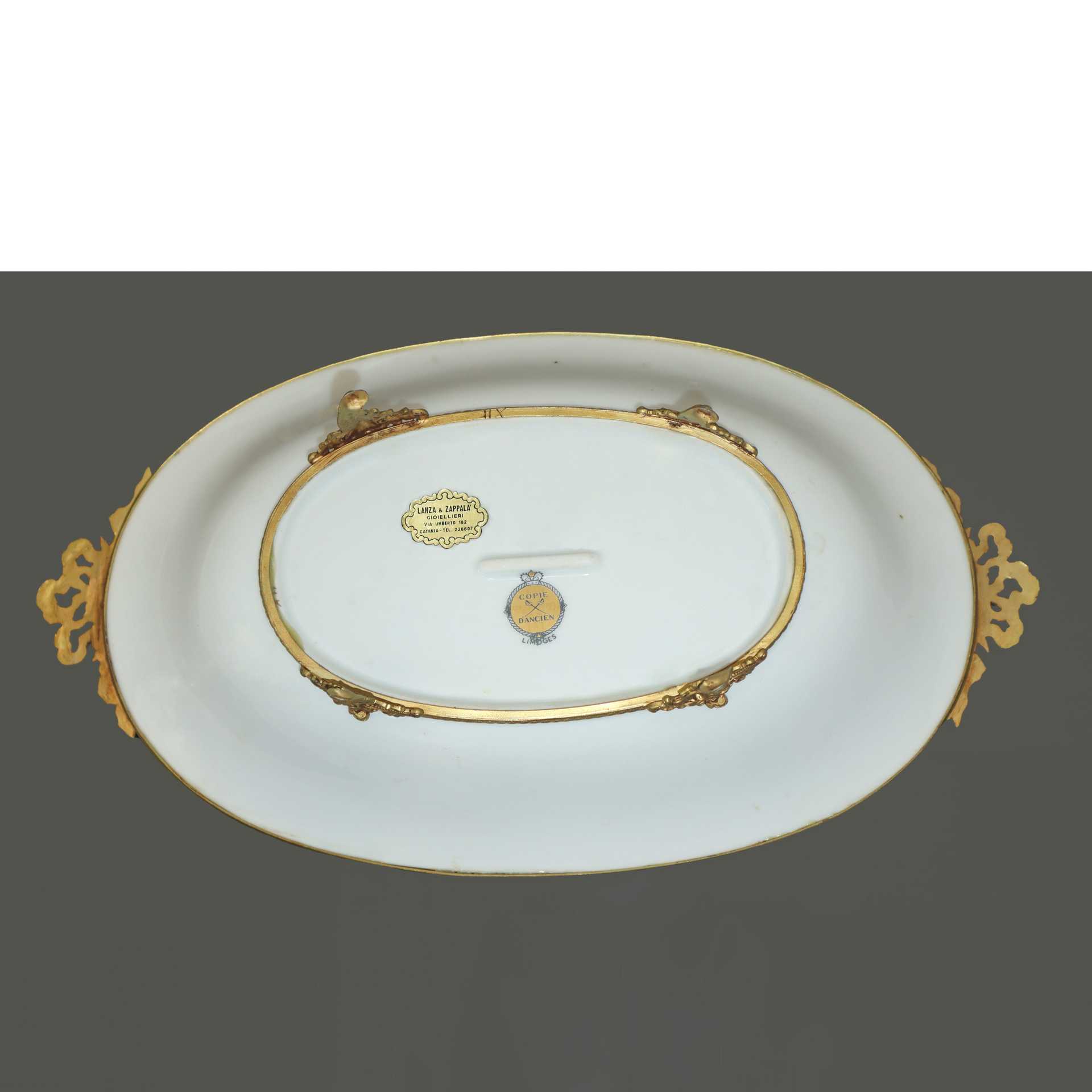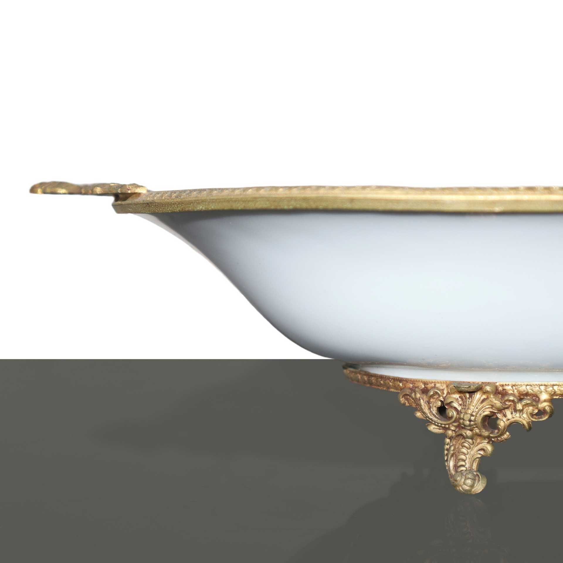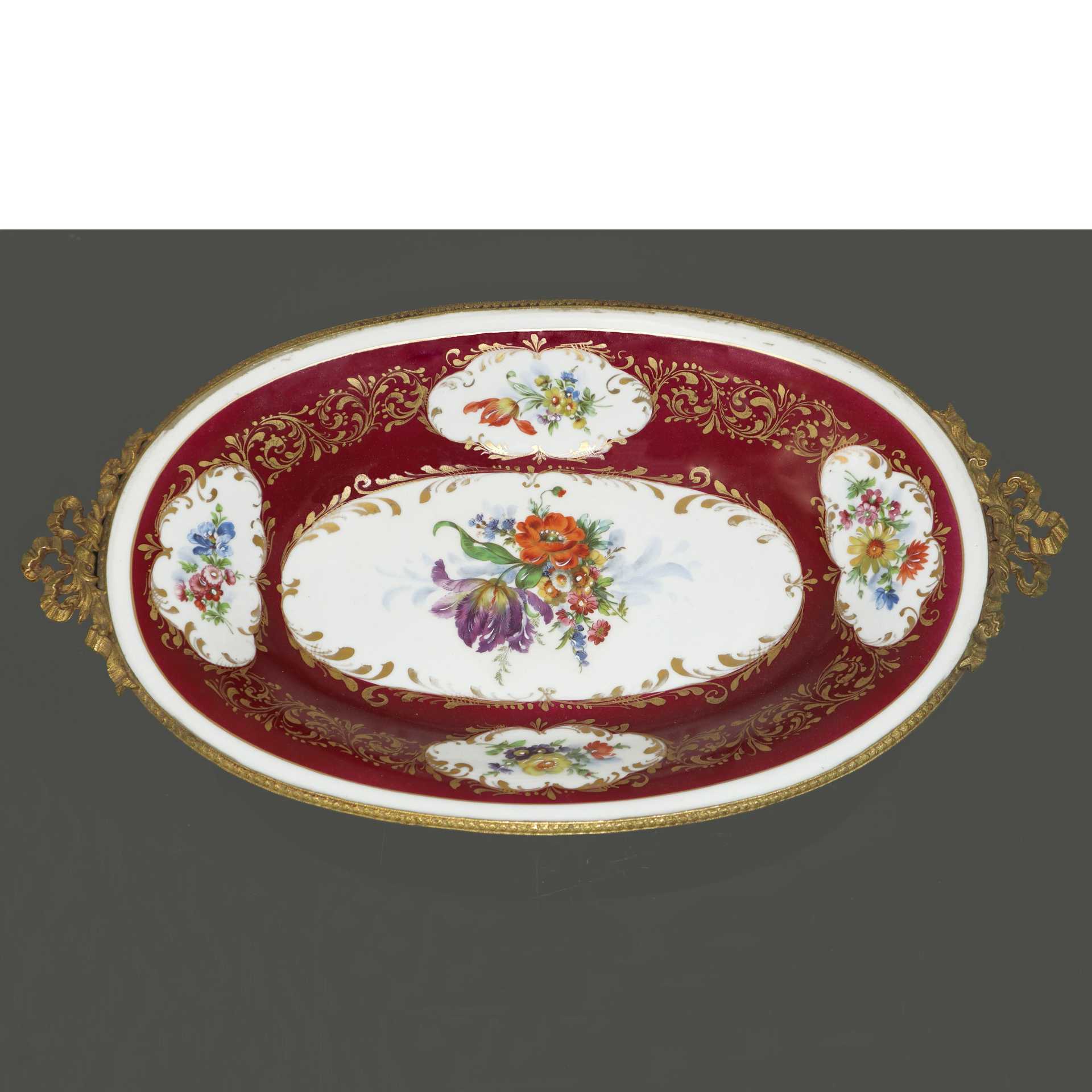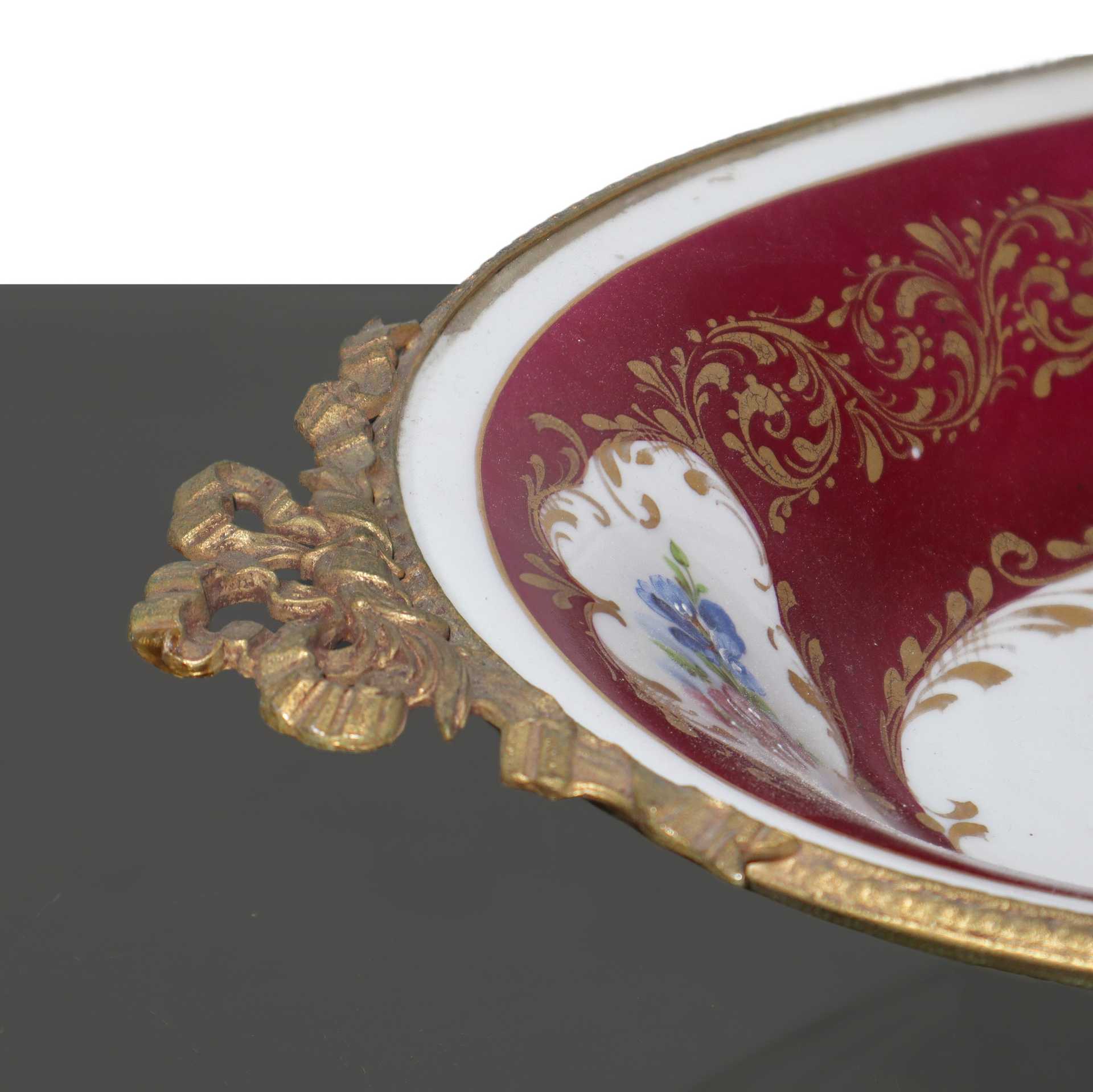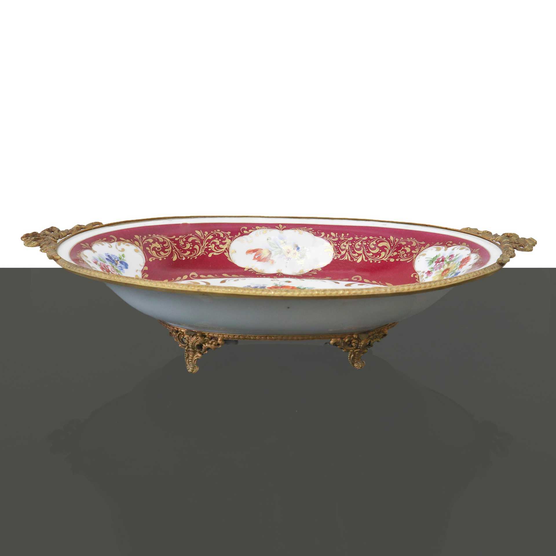 Limoges - Vassoietto ovale in porcellana bordeaux con smalti e oro H cm 9x39x22 Con piedi e contorni in metallo dorato. Marchio alla base.Con piedi e contorni in metallo dorato. Marchio alla base.