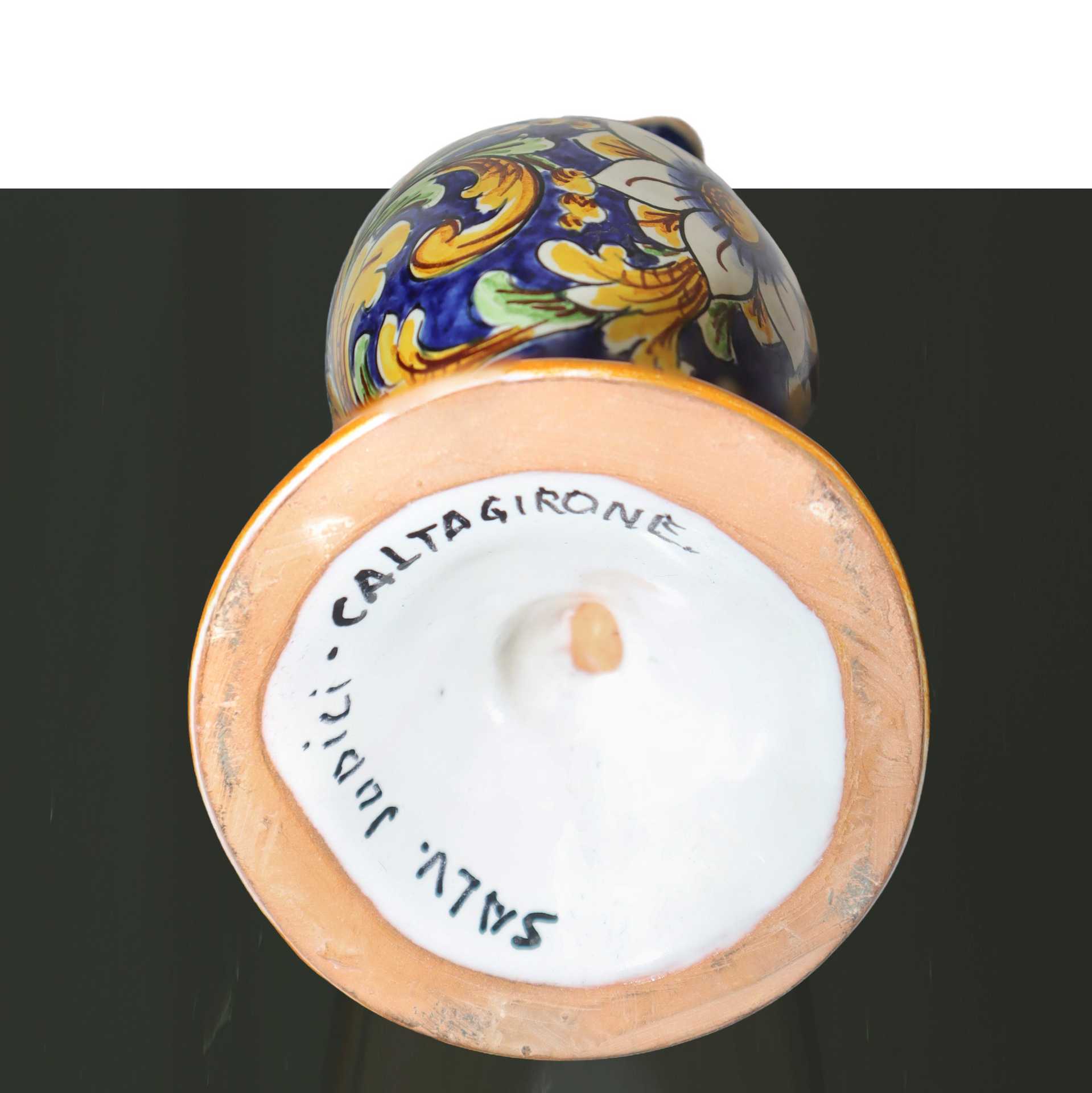 Salvatore Iudici (Caltagirone) - Coppia di anfore con manico in maiolica di Caltagirone h cm 36 Fondo blu e disegno a larghe foglie con margherita nei toni del giallo e verde. Fondo blu e disegno a larghe foglie con margherita nei toni del giallo e verde.