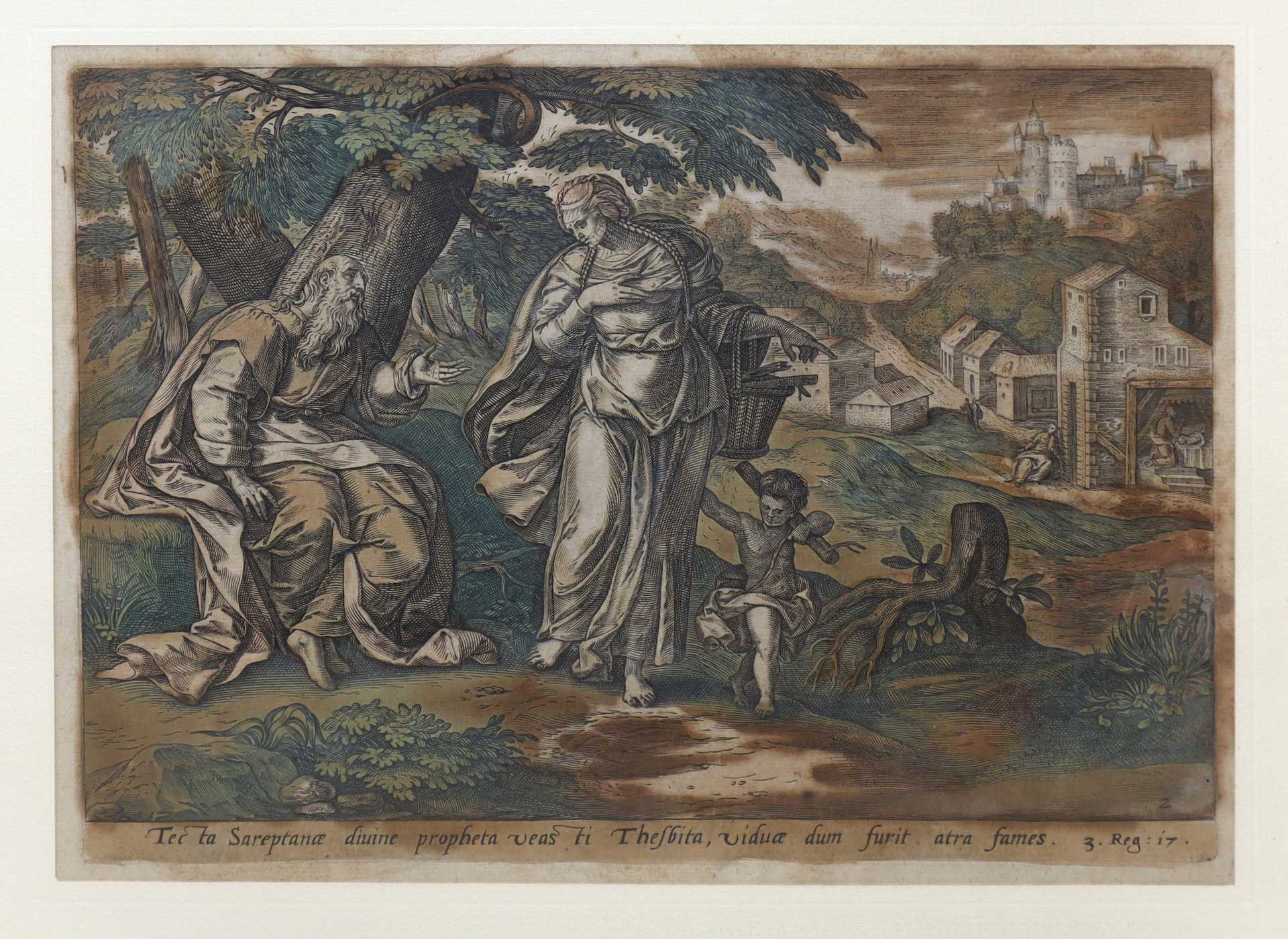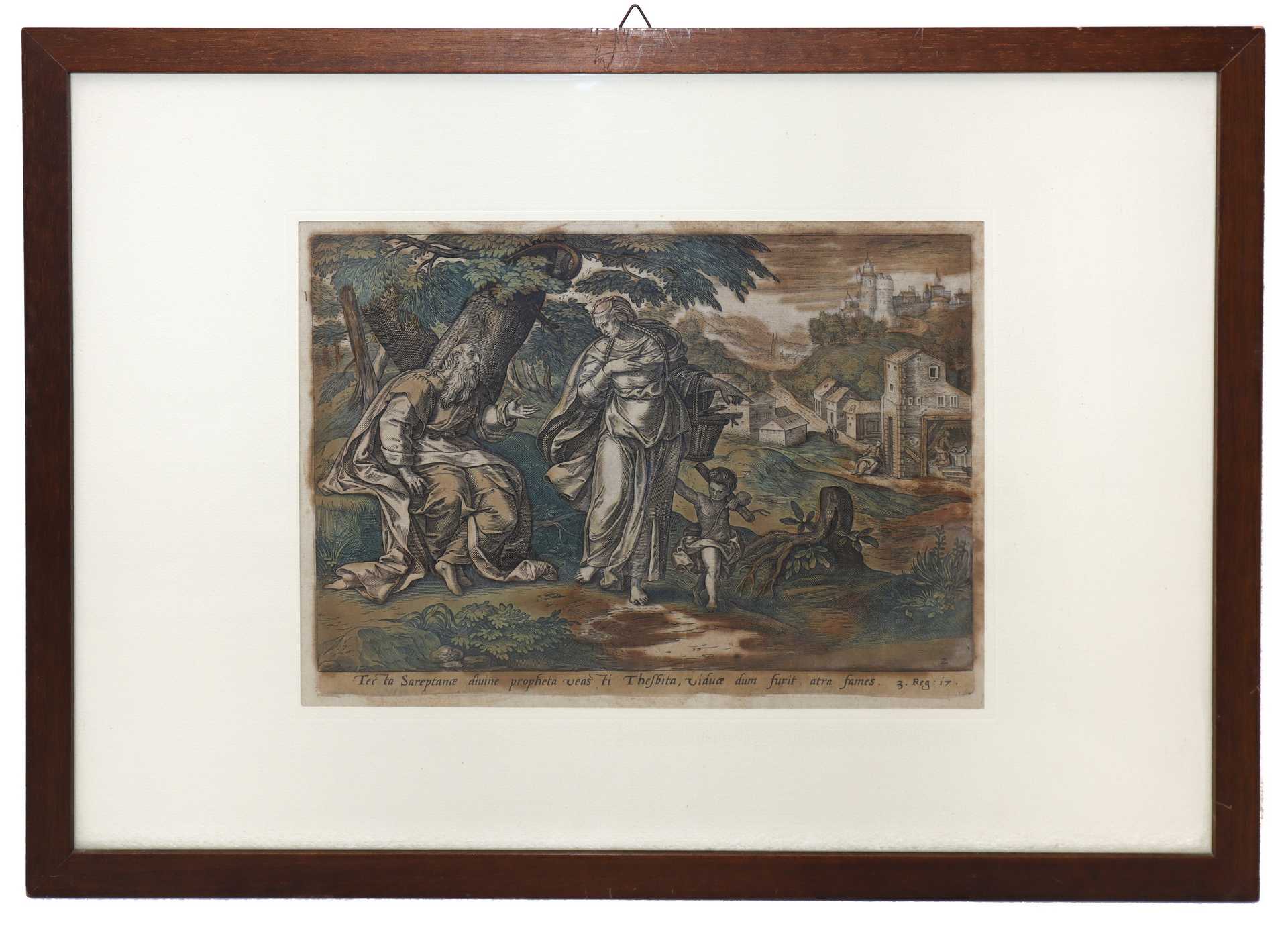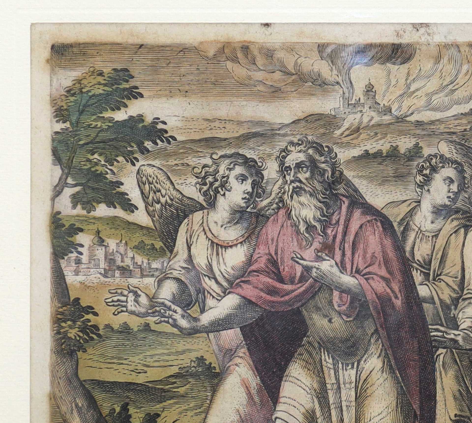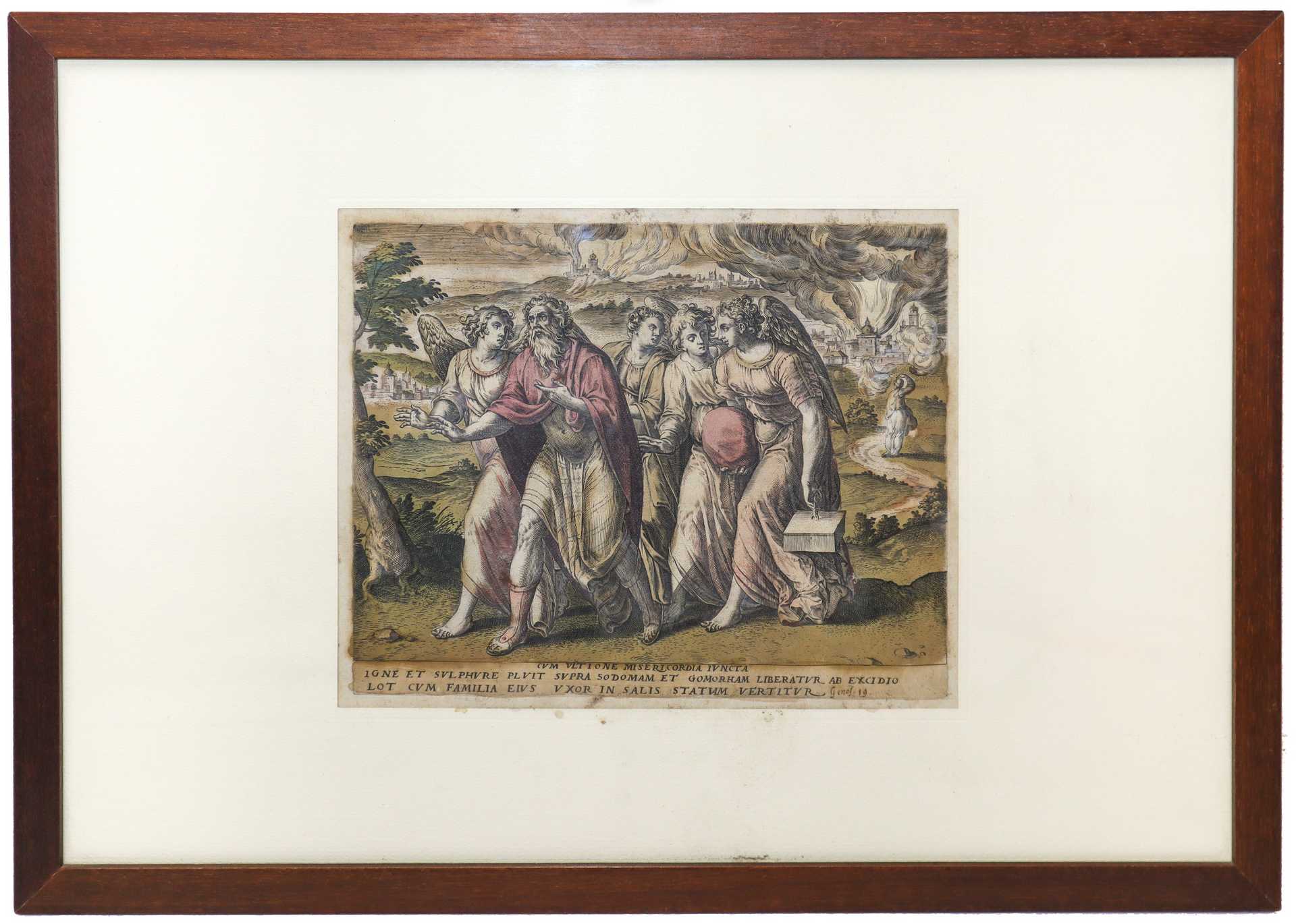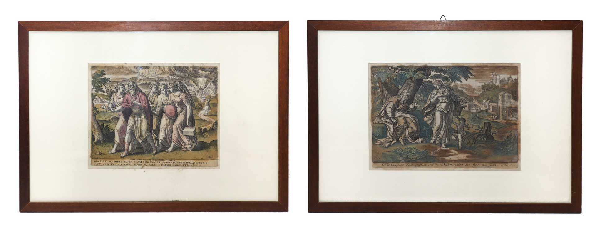 Gerard de Jode (Flemish 1509-1591) - Coppia di incisioni a sfondo biblico, XVI secolo cm 22,5 x cm 27, in cornice cm 38,5 x cm 54 incisione acquarellata Da Genesi 19 ''Igne et sulphue pluit supra sodomam et gomorham libertatur ad excidio lot cum familia eius uxor in salis statuam vertitur'' e 3. Reg : 17 '' Tec ta Sareptance divine propheta veas ti Thesbita, viduce dum furit atra fames.''