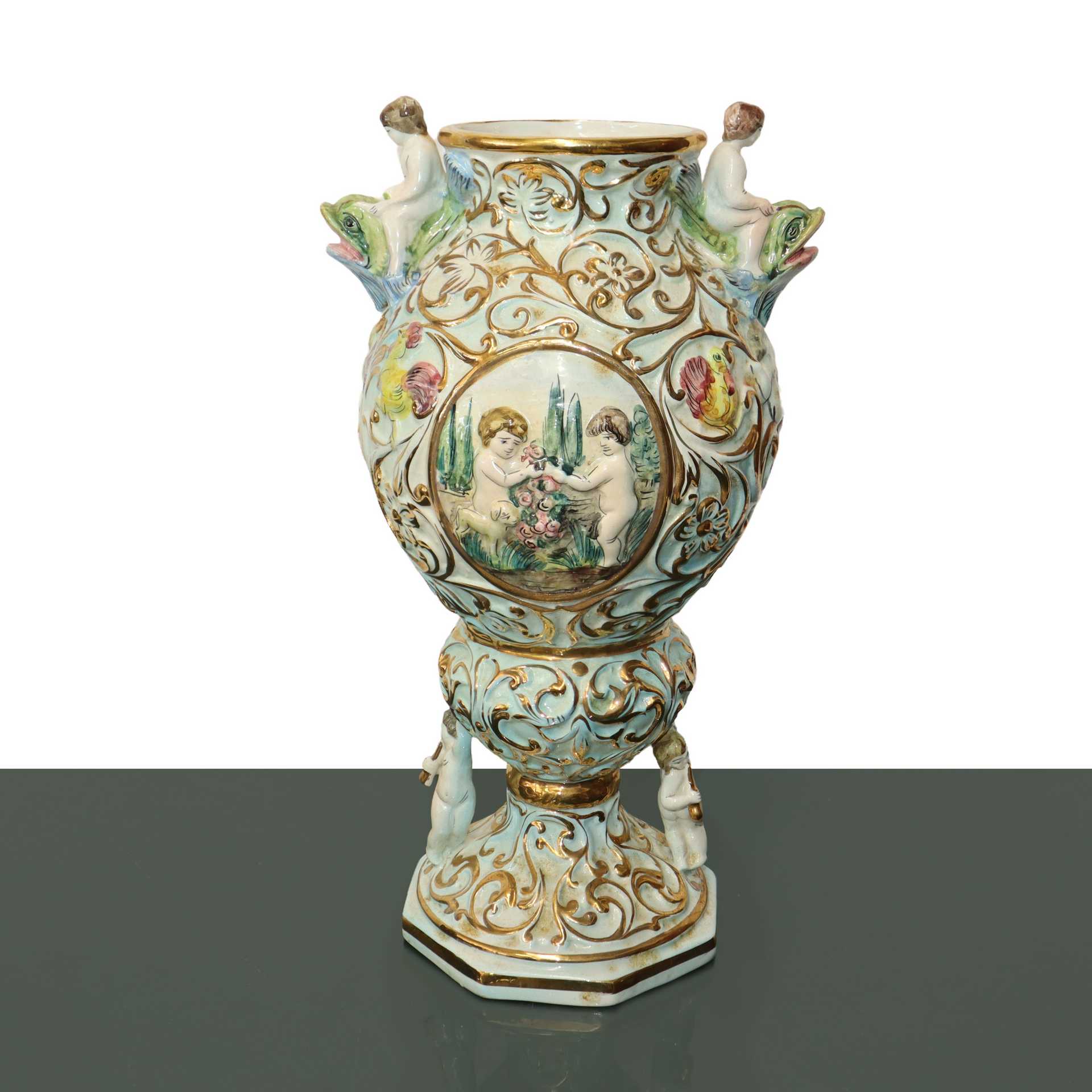 Vaso in porcellana di Capodimonte policroma con puttini, 20° secolo h cm 36X22