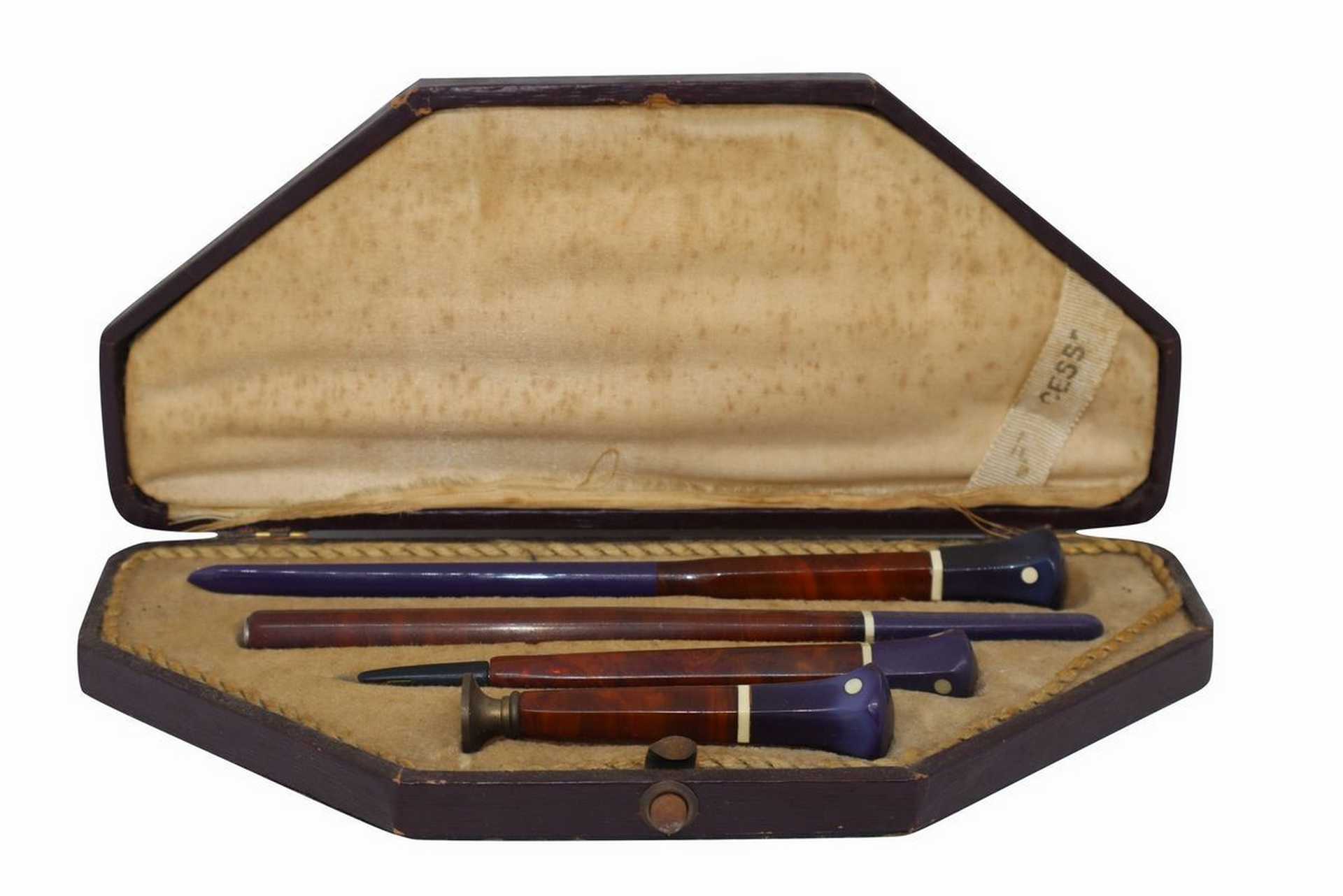 Antico set in scatola a 4 pezzi, fine 19° secolo cm 22 x cm 9,5 Sigillo ed accessori in tartaruga ed avorioSigillo ed accessori in tartaruga ed avorio