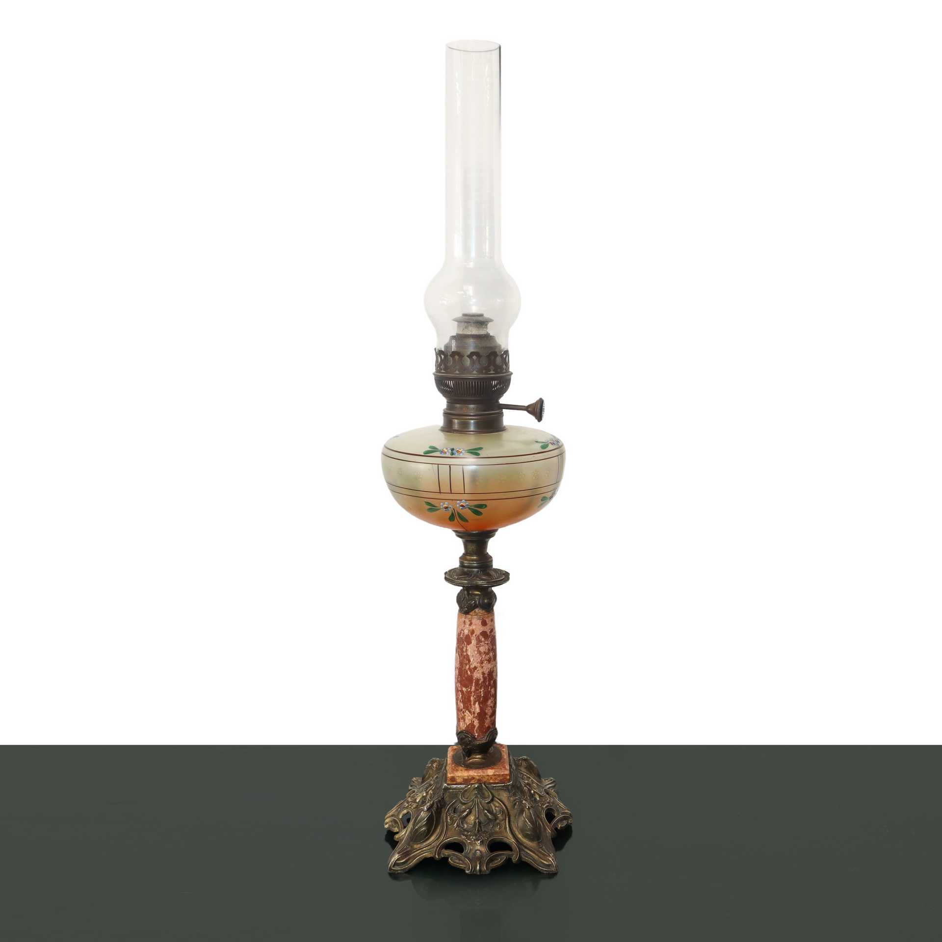 Lume a petrolio con base in metallo e sostegno in marmo, fine 19° secolo