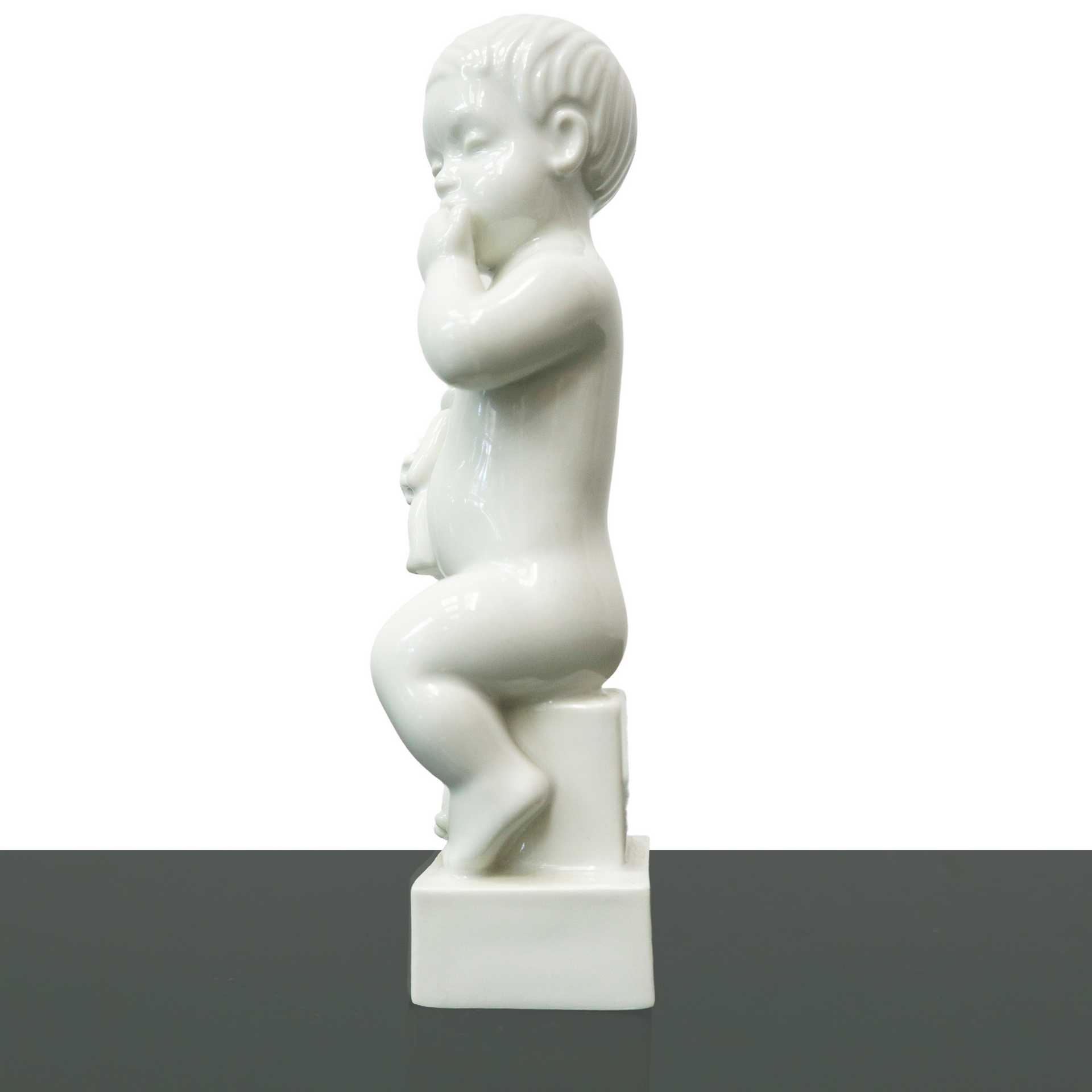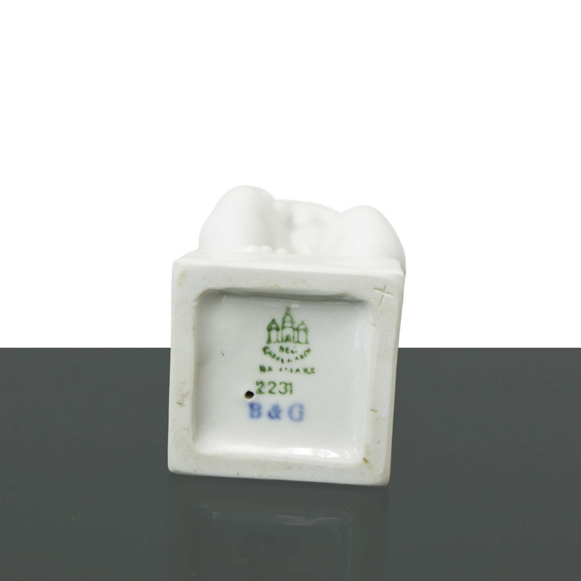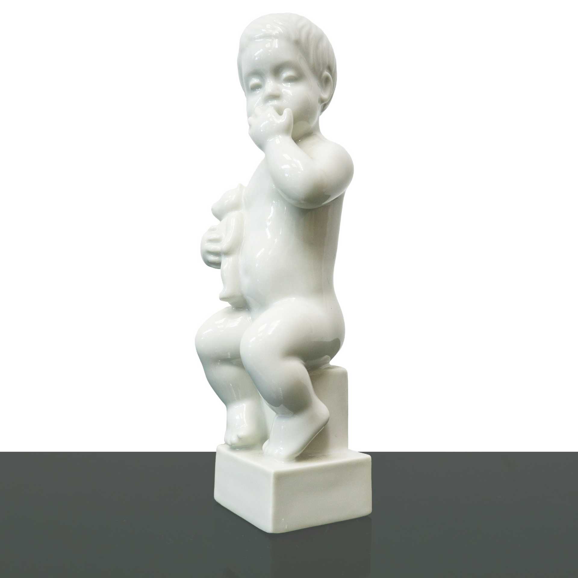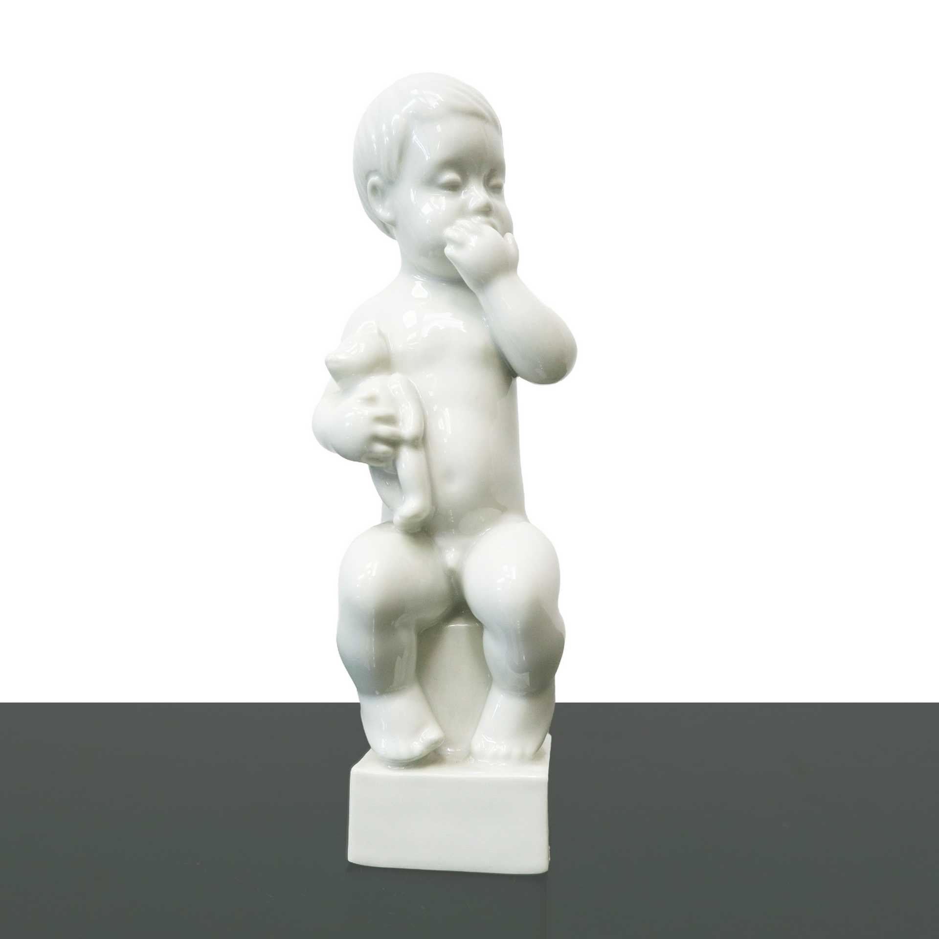Bing & Grøndahl - Bimbo su cubo con peluche di orsetto H cm 16,5x6 Marchio alla base. Incisione "SV. Lindhart 1936" su un lato del cubo.Marchio alla base. Incisione "SV. Lindhart 1936" su un lato del cubo.