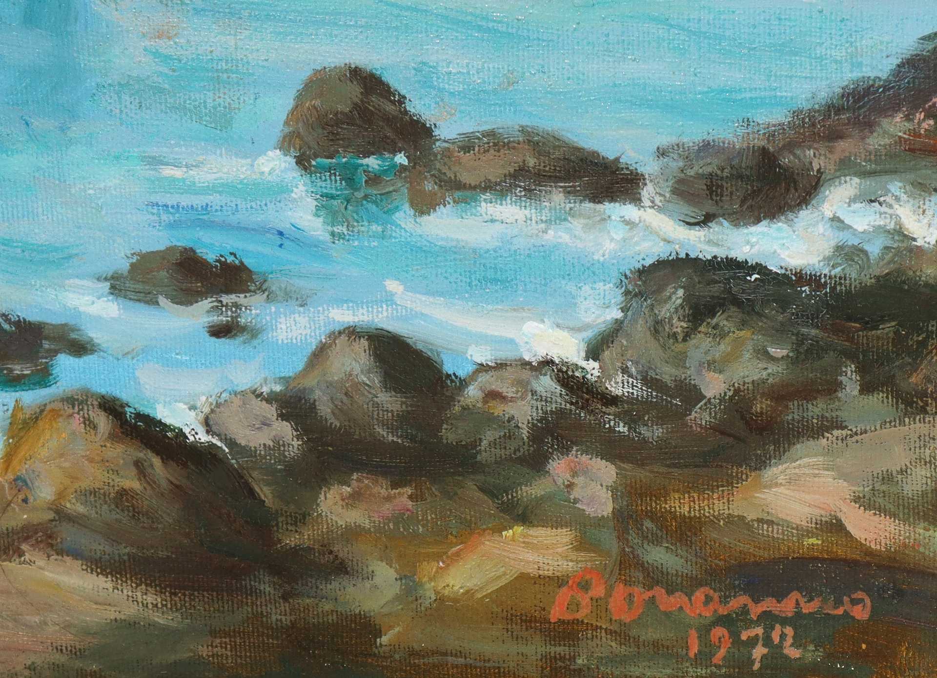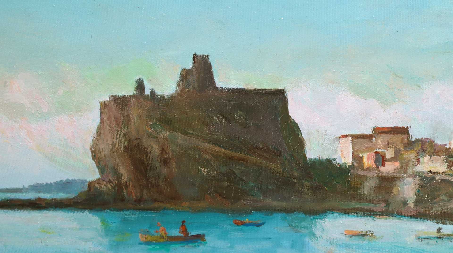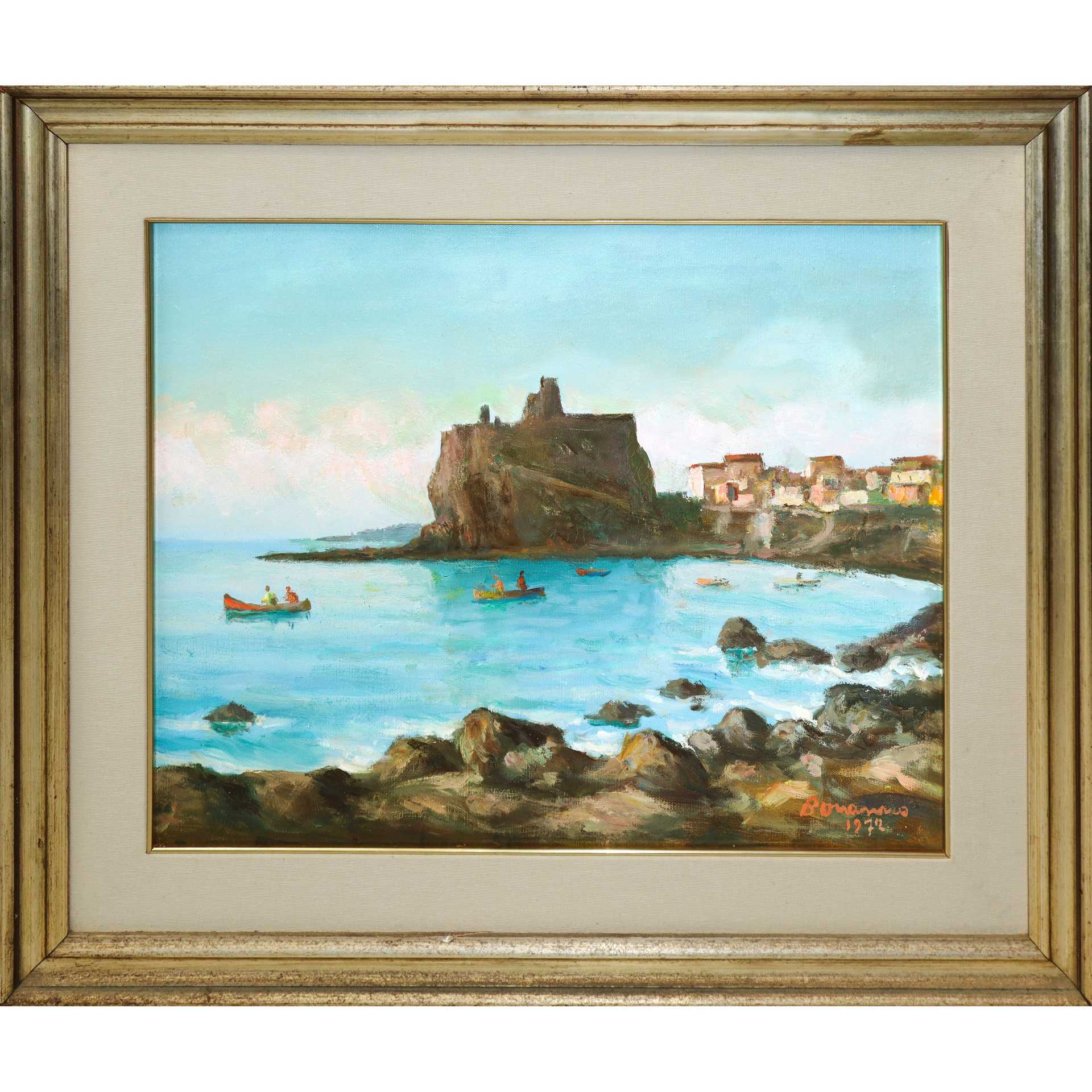 Baia di Aci Castello con case, 1972 cm 38 x 48, in cornice 57 x 67 olio su tela Firmato Salvatore Bonanno e datato.