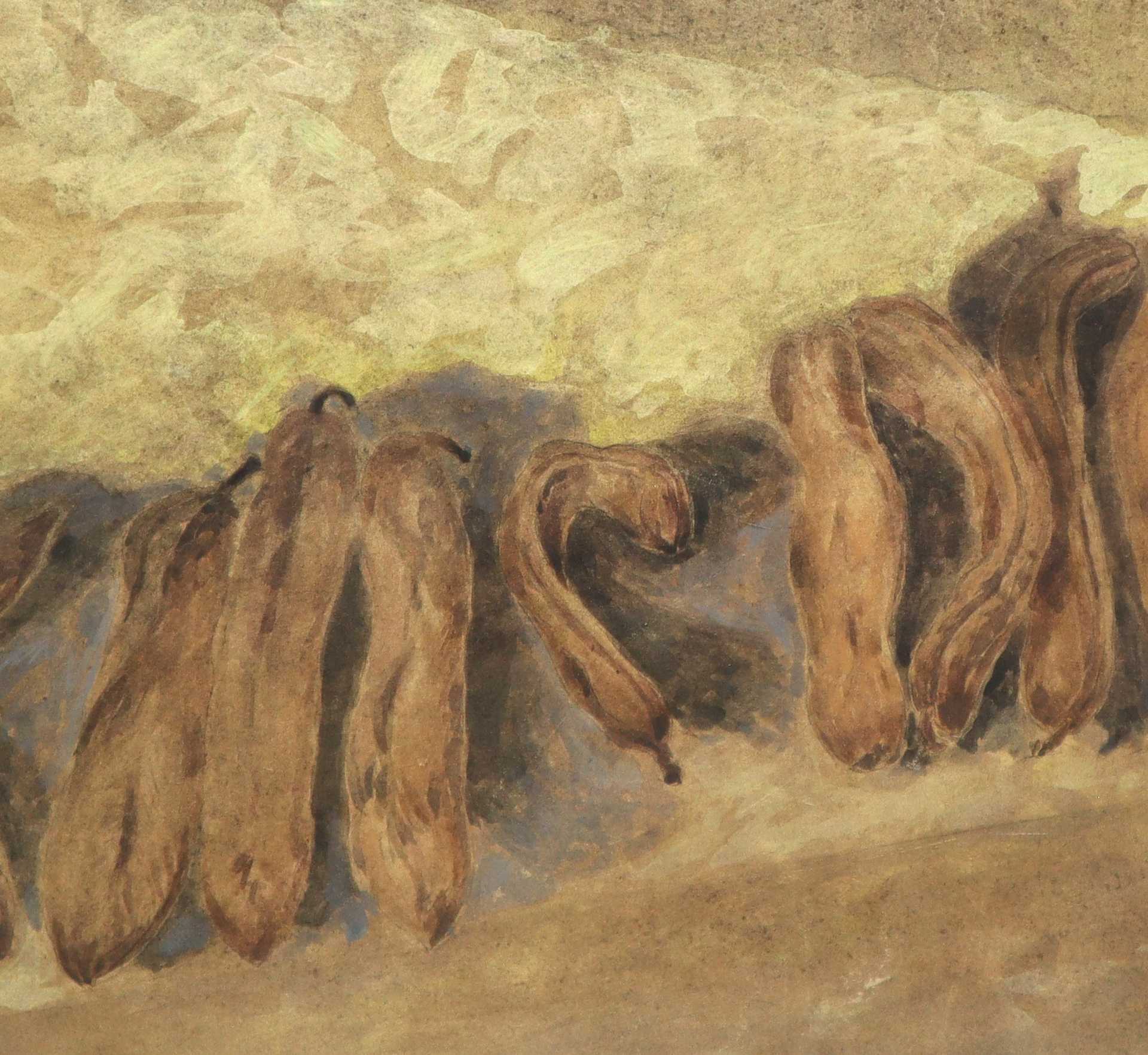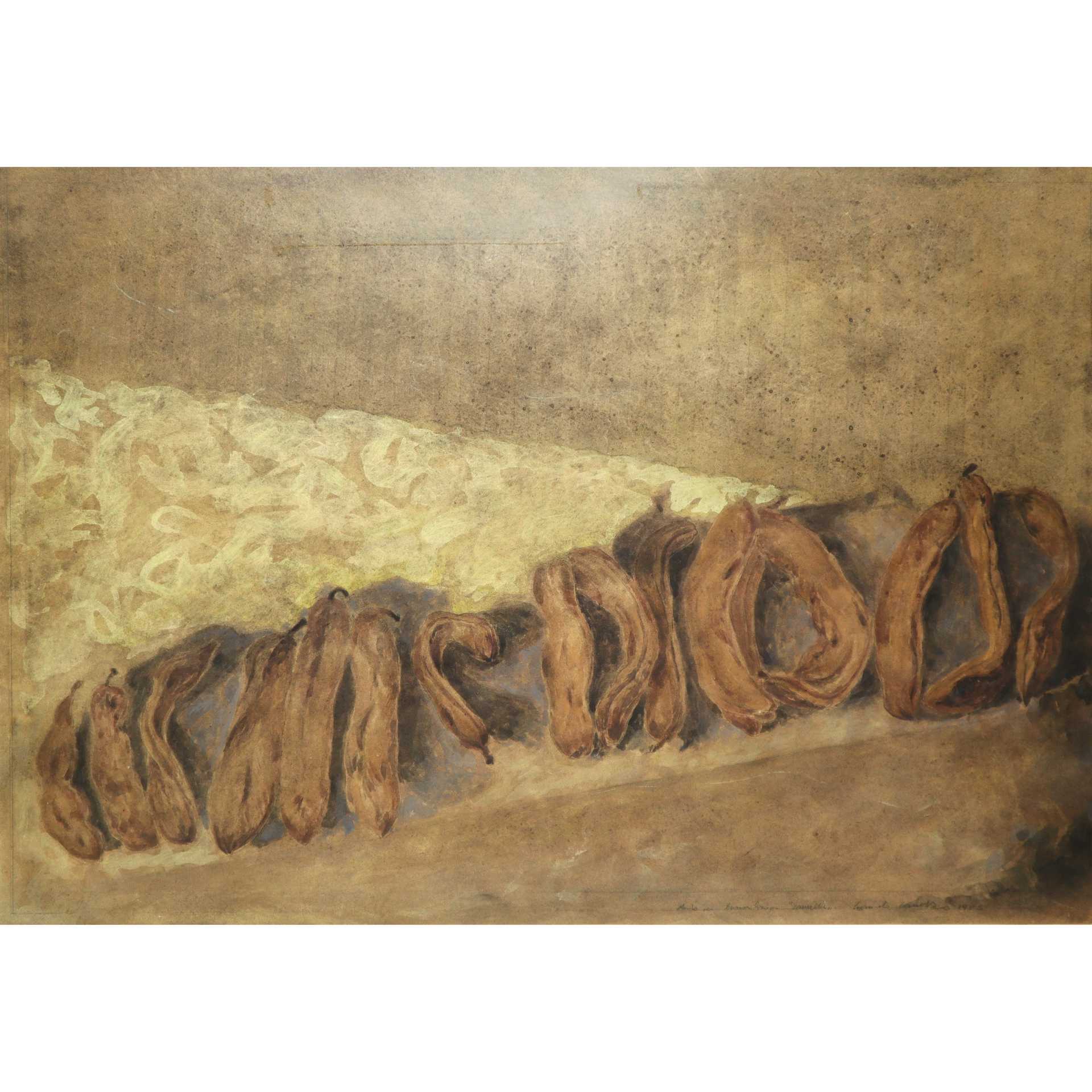 Carmelo Candiano (Scicli 1951) - Carrubbe, 1985 cm 45x65 in cornice cm 72x 90 Acquerello su carta Firmato, titolato e datato sul fronte in basso a destra. Sul retro etichetta Galleria Il Gabbiano, Roma