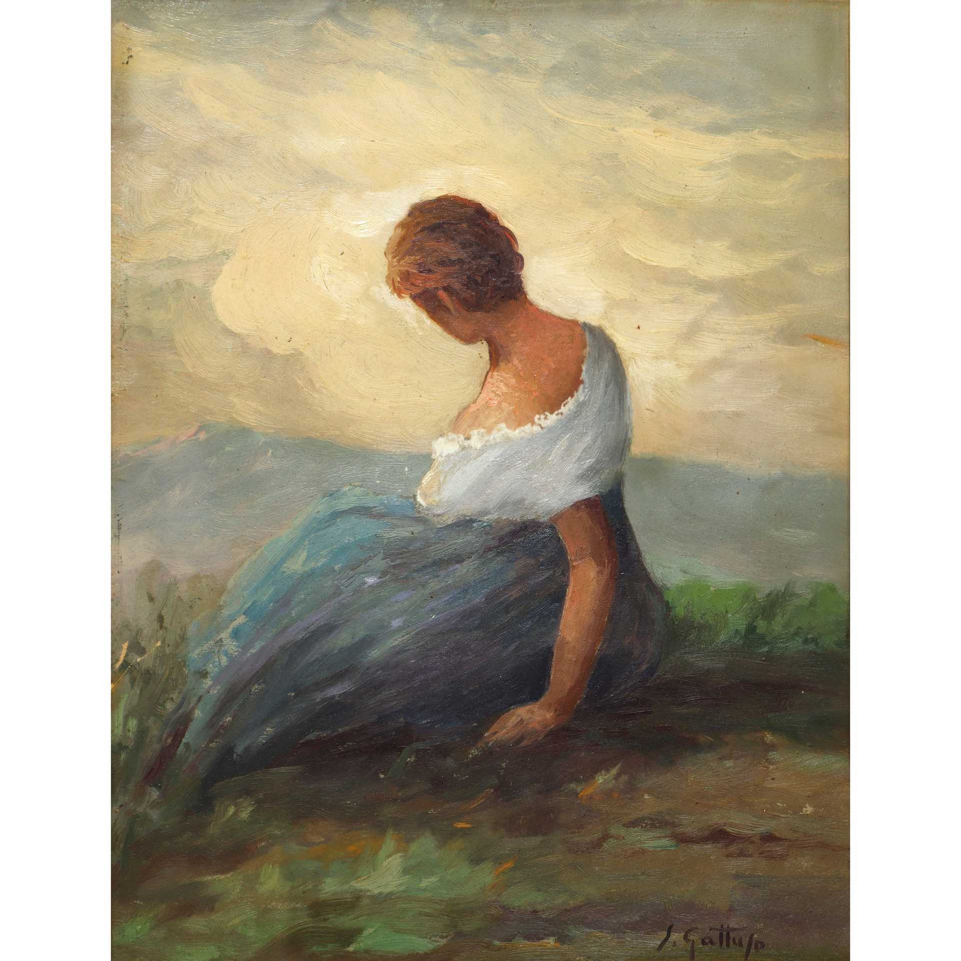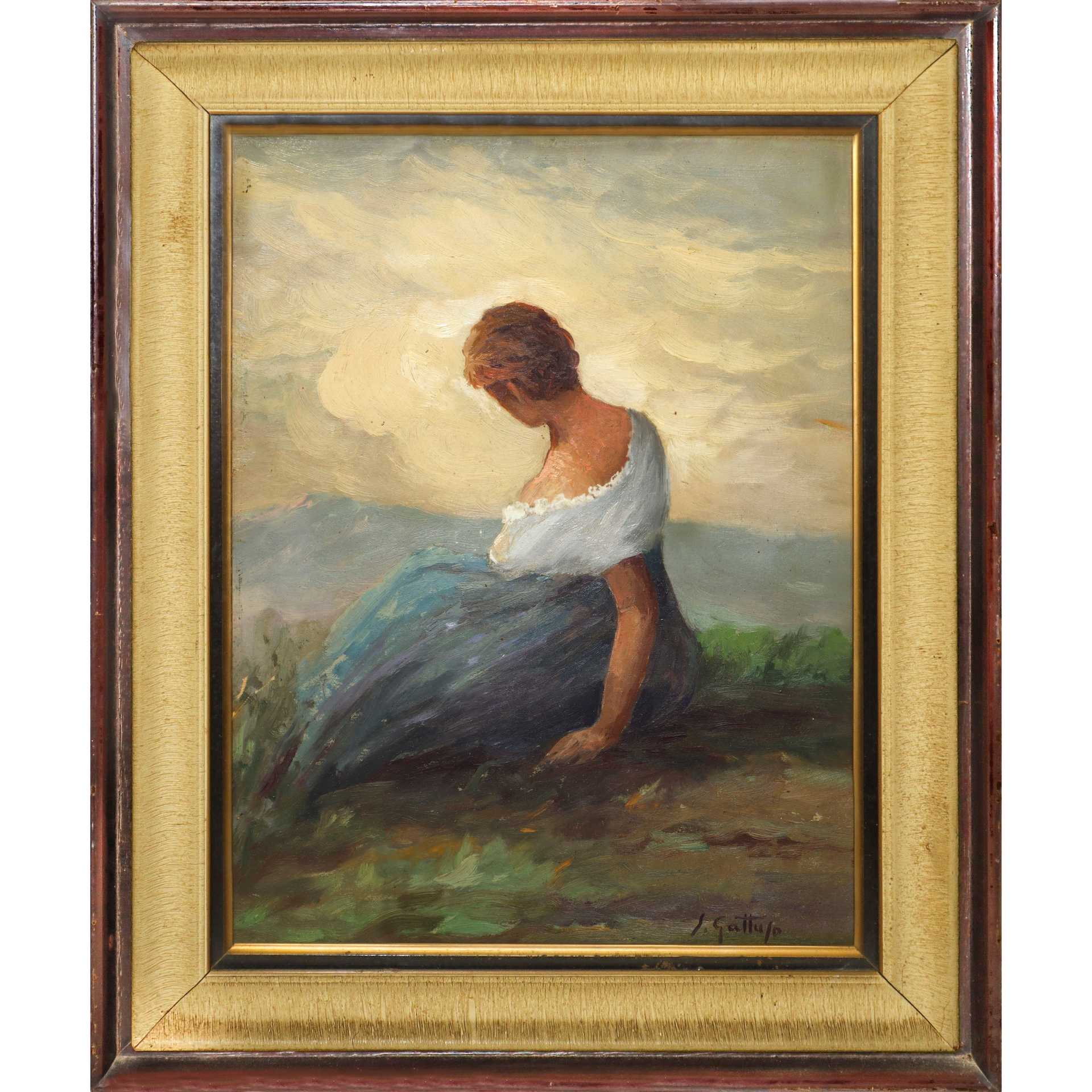 Donna seduta su prato H cm 46x36 - in cornice H cm 57x47 Olio su cartoncino Firmato Gattuso in basso a destra