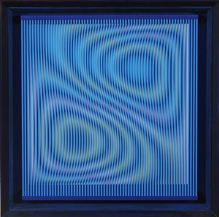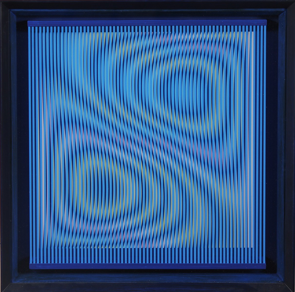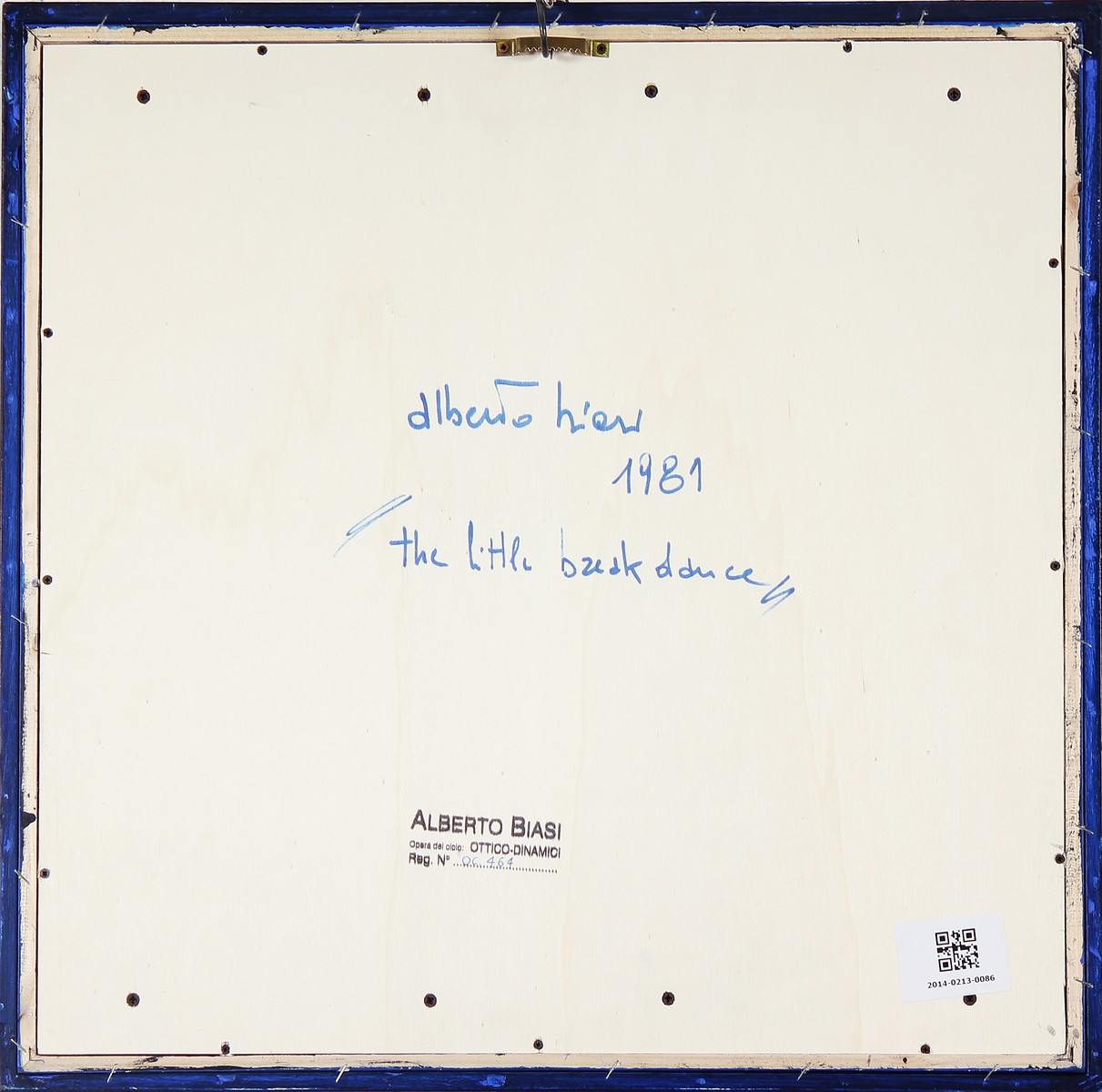 BIASI ALBERTO (n. 1937) The little break dance. 1981. Tecnica mista su tavola. Cm 50,00 x 50,00. Al retro firma, titolo, anno e timbro di Alberto Biasi. Opera archiviata presso l'archivio Alberto Biasi come da documentazione fotografica allegata all'opera riportante il relativo numero d'inventario. Cornice presente
